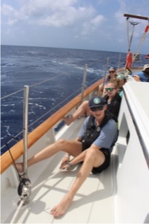 Today was a super early morning for Watch Team 1 since we were finishing up our passage from Dominica back to Antigua and had the early morning watch. Getting woken up at 3:30 in the morning was not the most fun thing in the world, but getting to see dolphins swimming off our stern with the sun rising in the background made the early wake-up worth it. There was also a super special moment during the sunrise when the rays of the sun were shining through the clouds down onto the boat. It was genuinely so beautiful, and Tyler told our watch group it was like looking at heaven. After the sun had fully risen and we were relieved from watch, we all promptly went back to sleep for the next 4 hours.