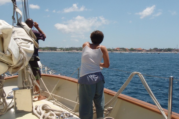 After a short night’s passage from Gili Island, we, along with some dolphins swimming by the bow, arrived in Bali at 1:30. Everyone was on deck, enjoying the sight of a busy marina full of various water sports. There were people zooming around on rafts that lifted off the water so that they were completely airborne. Little fishing boats were taking their time cruising in between all the big ships that Argo beautifully maneuvered her way through. Seeing as she did such a good job, we had a thorough primping session for the pretty lady. Everyone had a spot to brush, scrub, or shine. We became a kind of entertainment for the local onlookers. I envied the people standing on the dock watching as we were sweating and shielding ourselves from Bali’s bright sun. Of course, though all our efforts were well worth it, seeing that we could claim such a classy chick and knowing there would be a night out after also helped. It was a good day- we got some nice tans, saw some big boats, oh, and we’re in Bali! Sweet.