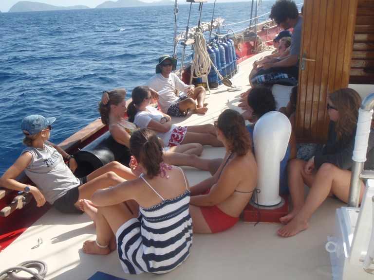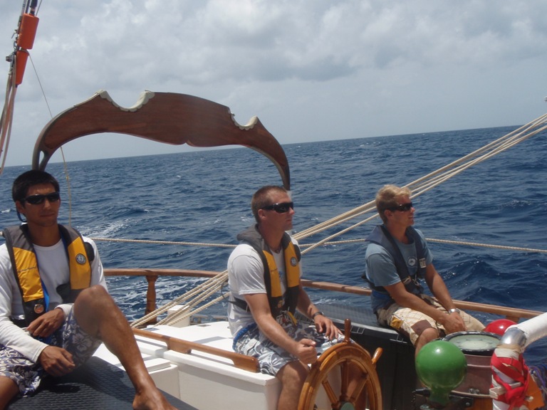 Leaving Saba last night just after dinner, we enjoyed a peaceful sail overnight and returned to the British Virgin Islands just before breakfast today. After re-entering the country, we all enjoyed some downtime onshore in Spanish Town. We used the time to fill up on Facebook, snacks, and shopping before making our way over to GHP – Ocean Star’s home. Our trip over was punctuated with “welcome back” messages from the members of the ActionQuest fleet as they saw us pass by. Mystral and Elise cooked us up a delicious Mexi-night dinner, for which we had the pleasure of being joined by Jim Stoll, the founder of Seamester. (Aaron from ActionQuest also joined us but mainly garners a mention because he is in the chart house as I write this) We were treated to Jim’s card game after dinner, which entails the following: a stack of black and white postcards, all depicting different images, are strewn across the table. Everyone is given a chance to select three – one that shows something that you like about yourself, something you are not so crazy about, and the third is meant to show what your idea of a friend is. It was fascinating to hear how people view themselves – a perspective we don’t often get of people, even when you live with them for 40 days. Some were funny, some were poignant, and all were meaningful. Tonight, shipmates are busily preparing themselves for the three big events scheduled for tomorrow – the Oceanography final, the Seamanship final, and Andrew’s birthday.