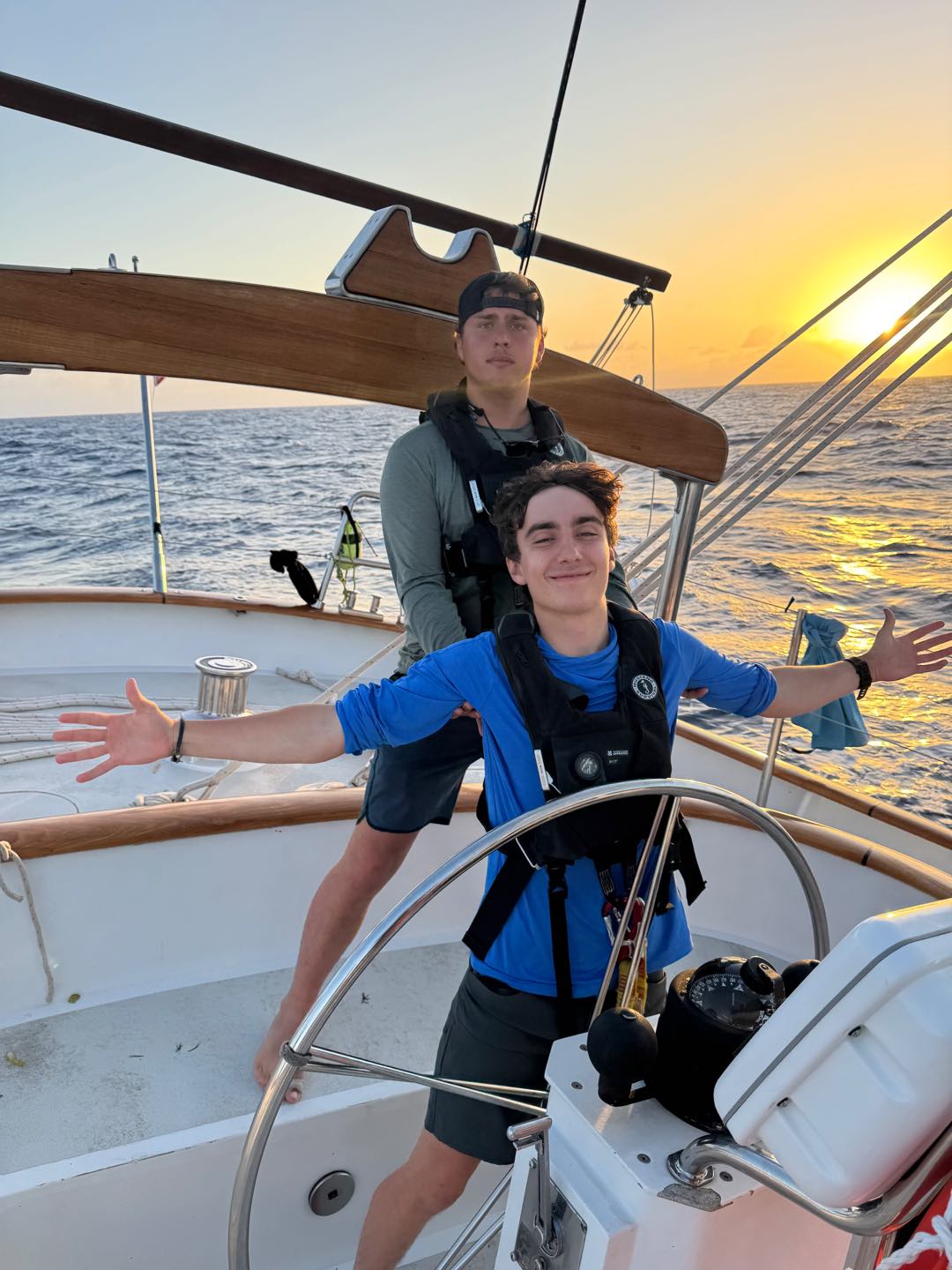 Today was our third day of passage between Dominica and Bonaire. The morning started off with a bang for watch team 2 (Caro, Liam, Jay, Maya W, Brooks, Maisy, and Claire), who had watch from 8-12 am. Captain Mac elected to tack and change our course as our arrival to Bonaire would be too early. This essentially meant turning back around and reversing the previous day’s work because we were too speedy! They kept themselves busy with crazy, confusing riddles about trains and lines and other nonsense games. They practiced heaving, too, along with tacking. The 12-4 watch was less eventful but was still great for Watch Team 3 (Harrison, Harry, Morgan G, Maya L, Emma, Sam, and James). I (Harrison) taught a game I learned at a summer camp called Roast and Toast, where you both compliment everyone and give a lighthearted roast. It was a super fun game and rounded out the watch well. By the way Harry is a prodigy at helming, some are whispering that he’s surpassed Mac. Watch team 1 ( Jake, Graham, Paloma, Morgan C, Henry, Brooke, and Ben) got a beautiful sunrise to close out the night watches. After lunch, we had two classes, Seamanship and Marino Bio. We had our first Seamanship exam for our International Crew Competency License. For the rest of the day, I’m not entirely sure what everyone else did, but I completed some fish IDs for our log book and did some other assignments.