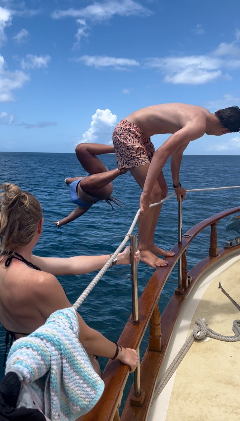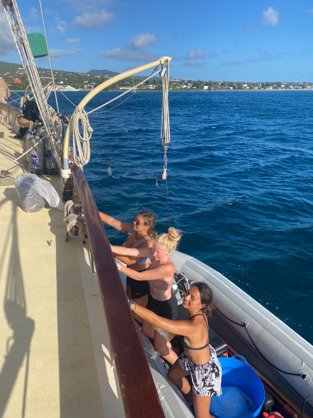 We then went through how to use a pure oxygen tank and then did a boat appreciation (really aggressively cleaned the boat). Savy, Fizz, and I cleaned the topsides and KILLED it. (picture 4) We used the dinghy to walk ourselves around the boat when all of a sudden our hands slipped and we, unfortunately, drifted away in the dingy, so I jumped in the water and had to swim us and the dingy back to the boat. We are all looking forward to the clean sheets and clean boat tonight. At dinner, Sarah and her sous chefs made pasta with meat sauce and Oreos for dessert! Hedrick showed off his juggling skills some more at dinner (picture 5). Anyway, that’s all for now, folks! See you again soon.