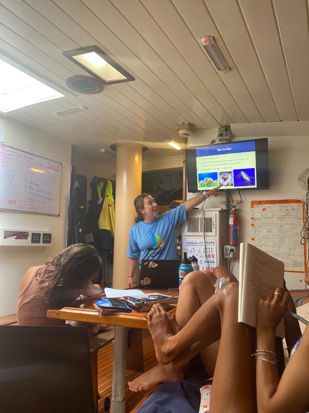 So today is day 62 (what the heck). The mere thought of this trip almost being over is going to make me sob, so let’s just skip over that for now. It was a crazy wild day here on Ol’ OStar (per usual). We started the day off with Sarah’s famous scones (picture 1). Side note- if you haven’t tried these yet, you haven’t fully lived. They are so good! After breakfast and clean up, we had double science all morning. First was Oceanography with the iconic Sam. She taught us all about fisheries (which I was especially happy about because one of my favorite things to do at home is fish with my dad). Then in marine bio, we learned about sea birds and reptiles (picture 2) with the famous Mandy. WE TALKED ABOUT TURTLES. Sunny and Alex did peak performance butts. After class, I had the sudden urge to do a backflip (which I had never done before ever), so I asked Heddy, and he taught me how. Side note Heddy is the best for teaching me. Definitely, a forever highlight, and I really appreciated it. Alexiou came on deck, and we decided to start doing backflips together (picture 3) until lunch came up. For lunch, Sarah made BLTs. The sun was shining bright, and it was very, very hot during lunch. After lunch, we cleaned up and gathered in the salon to work on our rescue diver course. Ash went over knowledge reviews for five whole chapters with us.