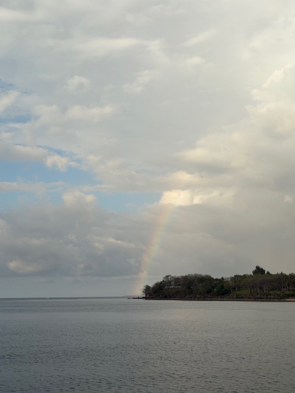 My tummy growled. Grrrrrr! After this, I went back to bed while team 2 took over the watch. The squelch of the VHF radio left me brrrr brrrrr ch ch ch While sleeping, I broke out into a sweat. Later, everyone gathered and woke up for lunch, which was very good. We ate broccoli Caesar salad. Yummy! While eating, the broccoli tickled the blood cells on my tongue. It made me have to sneeze, but I held it in. I sneezed. After lunch, we cleaned up and kept making our way to Lombok. We eventually set the anchor in the pretty bay. BOOM! It rained a lot, but that left a super pretty rainbow. I stared in awe at the rainbow. Wow, this world is so gorgeous, I gasped while I put on sunglasses. They were tilted at a right angle, which tickled my nose. I sneezed again. My sinuses absorbed the ambience. The certified divers made a short checkout dive off the boat while the non-certified divers went to a resort to use their pool to do their first dive! After that, we ate dinner and are now preparing for anchor watch. Good day, 10/10 would recommend.