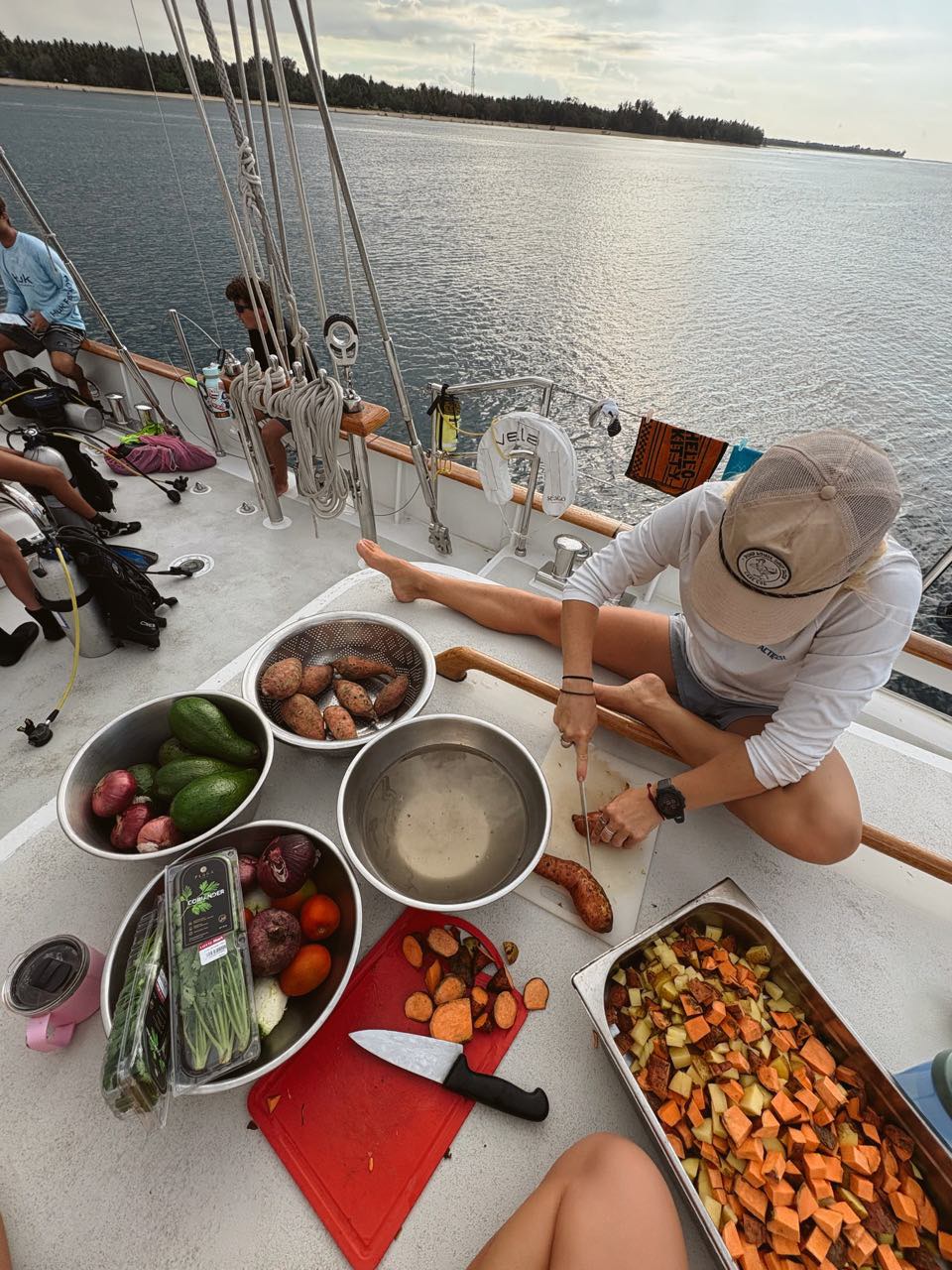 Today was packed with lots of stuff. I started the day at 4:00 am for night watch with watch team 1. The other teams had already gone earlier in the night. It was rough having to wake up that early, but watching the sunrise made it worth it. My eyes kept closing throughout the watch like an elevator door. However, I understood my duty. I AM IN CHARGE of Vela. I accept. I believe. I power through against all odds. I AM VELA. I raised some of the sails for the first time on this trip, which was fun. Zeke saw a flying fish early in the morning, reminding us of sushi or something. Since we were underway overnight, we didnt have a real breakfast, but I enjoyed some yogurt mixed with some other stuff with the rest of my team.
