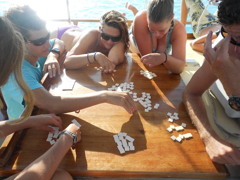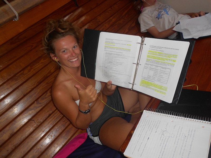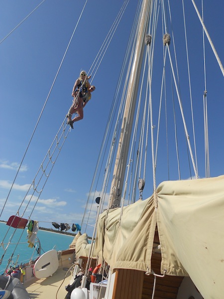We kicked off the day with a double class morning. MTE followed by OCE. The classes aligned well, as they both were covering currents. The day before was a bit overcast, so as we came on deck for our 10-minute break between classes, we were pleasantly surprised at the stunning day in Barbuda. In regular college life, passing periods between classes consist of us scurrying from building to building, often in unpleasant weather. In Sea|mester college, passing periods is when we sit on a boat and admire the endless sandy beaches surrounded by bright blue waters. Today is a good day. After our morning classes, we had the rest of the day free to do as we pleased. All of us took this time to study for the OCB test looming over us. Fun was had during our study breaks, however. Some went swimming, Boots made herself a towel fort and watched a movie on deck, and Brando became the dreaded fly hunter extraordinaire, killing at least 3 of those pesky flies. High up in the air, Mollie taught me how to tie ratlines. She is the best buddy ever! And together, all of us played a game we are, as of recently, freakishly addicted to Bananagrams. During dinner, we realized that we could see Antigua, St. Kitts, and Nevis from where we were sitting in Barbuda. Amazing to see how we are going full circle around the Caribbean. After dinner, we faced that OCB test, killing it, obviously. Passage prep followed at 9 pm. Fearing the worst, everyone was mentally preparing for what could be a rough passage. The watch teams began, starting with watch team 1- Meg, Brando, Coach Ivy, and Captain Spice. Watch team two would take over at midnight, and my all-girls watch team went to bed, awaiting the pleasant hour of 3 am when we would get to sail this vessel to St Barth’s!