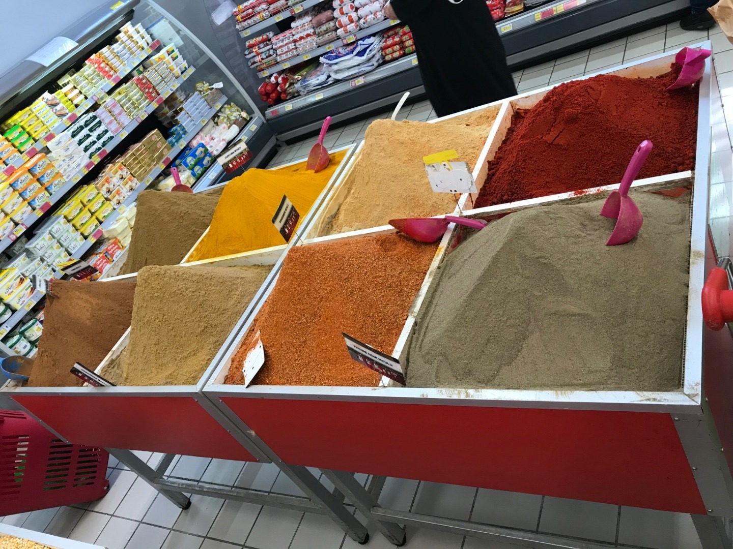 We are in the land of spices, and Amanda found these beautiful spices on display for purchase at the otherwise-standard grocery store during provisioning.