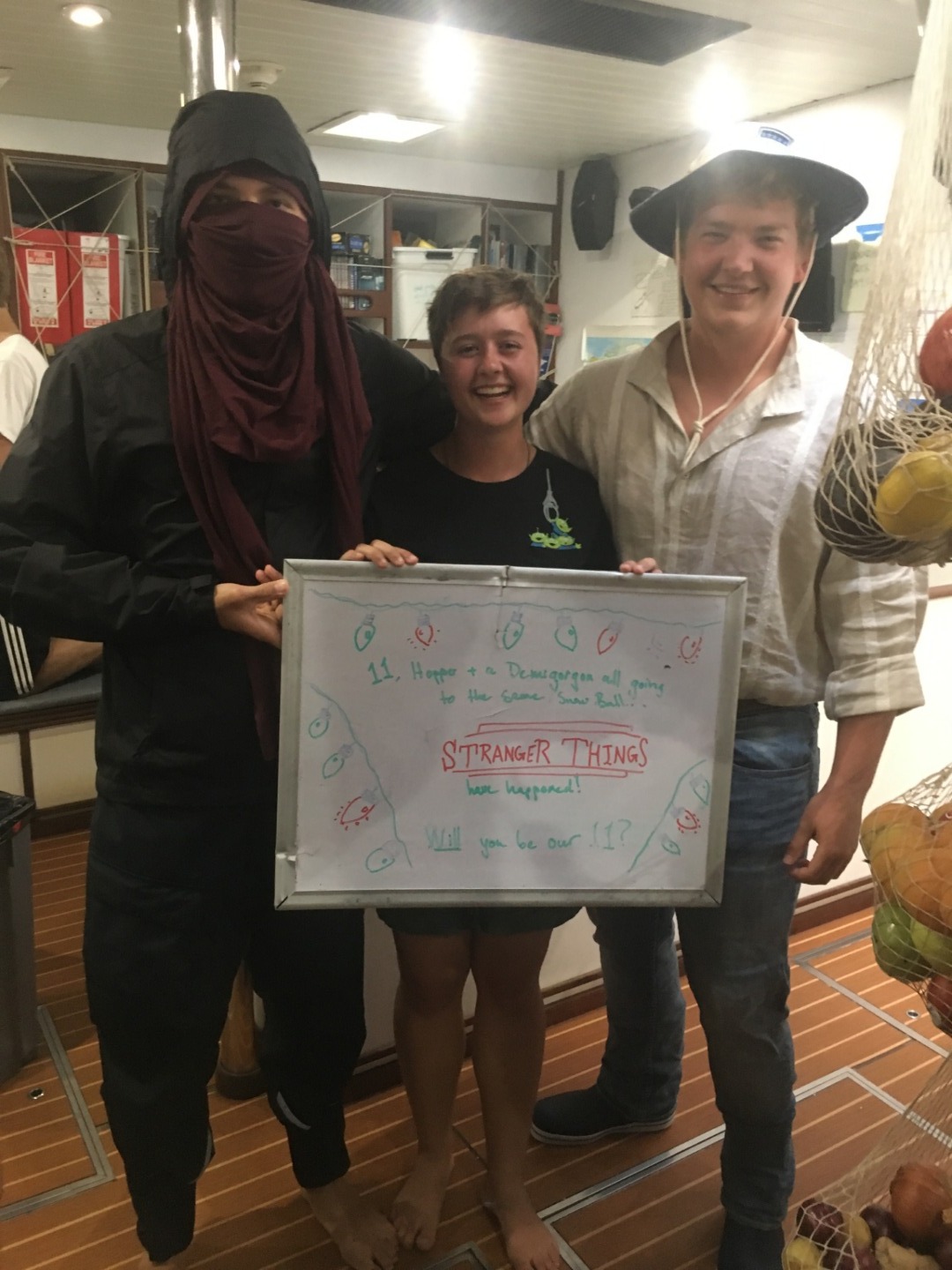 Pictured: Ben and CJ were asking Ev to the Halloween bash with a sign that says “11, Hopper, and a Demogorgon all going to the same Snow Ball? STRANGER THINGS have happened! Will you be our 11? (We have lots of fans of the show Stranger Things onboard)