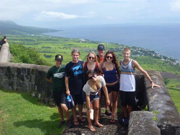 On the 11th day, we continued to sail into Saint Kitts on our 18-hour journey from the West End of Tortola. The crew took 3-hour shifts from Tortola to the Kitts. Once we entered Saint Kitts, we were amazed by the beautiful green shore and set anchor just off of Sandy Beach Point, St. Kitts. We then had wonderful pancakes for breakfast, cleaned up, and got ready for a nice hike to Brimstone Hill, an Old British Armed fort with tons of cannons all over. The hike was about an hour to the top. As we went along the road, the locals sped past us in cool-looking buses. We saw some cool local monkeys, and then it began to rain furiously on us. Once we arrived at the top, we had a wonderful view of the island and a few others around us. We then hiked back down the mountain and went back to Ocean Star. After lunch, we wanted to move our anchor because it was too close to a break wall. We then ran into some trouble and noticed our anchor was stuck on the bottom in about 90 ft of water. As we watched, our dive instructor, Laurie, and captain, Kevin, dove down to get our anchor out of that mess. We then had a wonderful Thanksgiving-like dinner with turkey stuffing and mashed potatoes. We concluded the night with a Marine Biology Class, and then Ocean Star motored to Potatoes Bay, where there is an underwater shipwreck, for a great diving adventure tomorrow.