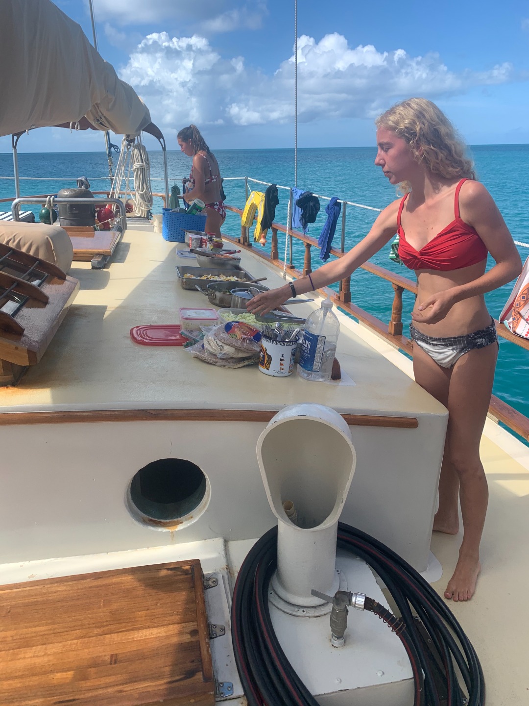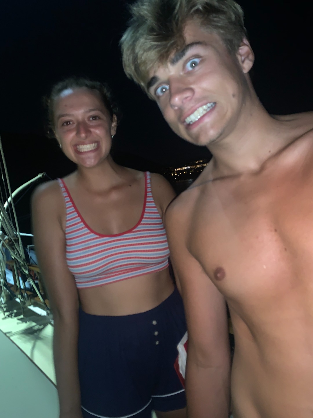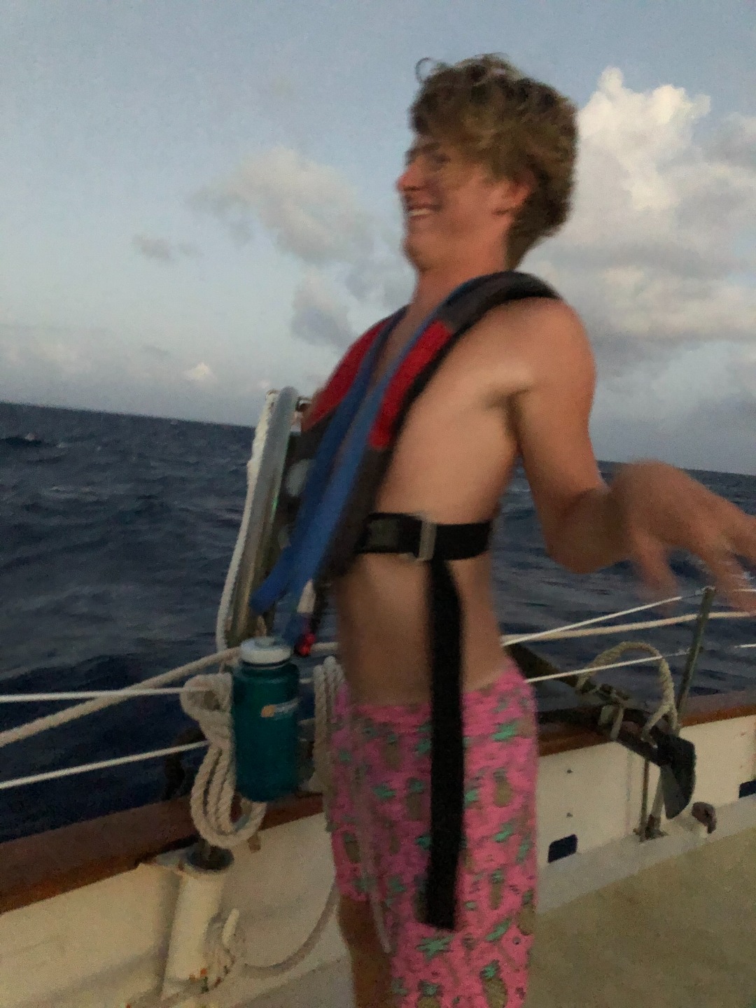 At 12, we had a delicious lunch of breakfast burritos with sunny-side-up eggs and pineapple salsa. After lunch was leadership in which we prepared for a debate about whaling on one of the Grenadine islands, Bequia, this was cut short, however, from Calum’s return from provisioning. We packed the fridge full of vegetables, meat, and most importantly, bread for the next 9 days. Now we get into a bit of a gray area when recounting the day. From after provisioning until dinner at 6, I was happily and deeply asleep. So although I am not sure what truly happened while I was sleeping, I awoke to tame stories about gorgeous dives and chill deck showers as well more “darangerous” (DA-RANGA- RUS) stories about malfunctioning ovens. Being the unbelievably kind soul he is, was helping the chefs light the oven, and there was a bit of excess gas in the air. He was met with a giant ball of fire, almost sinching his mile-long lashes. Luckily, he made it out of the galley unscathed.