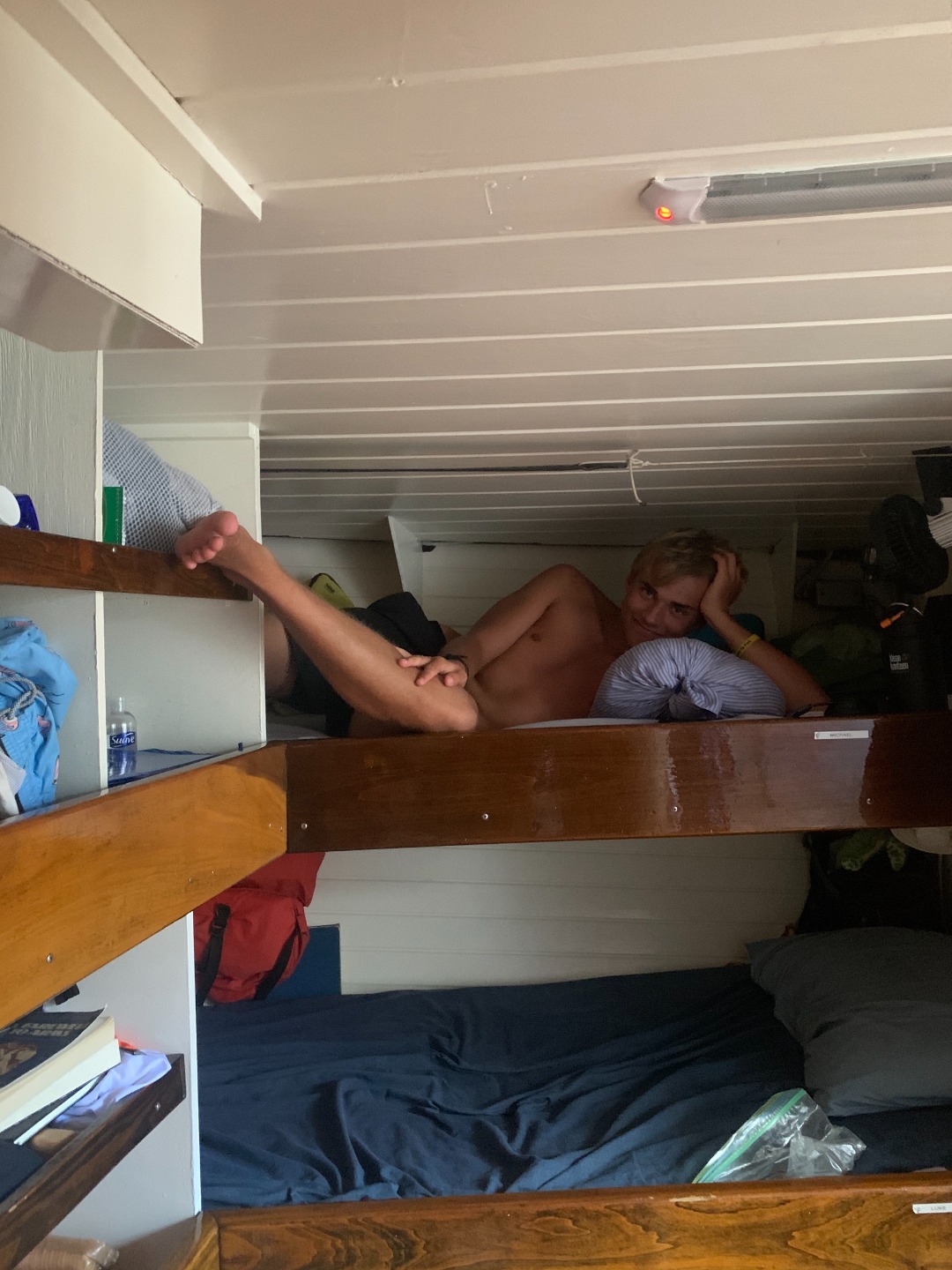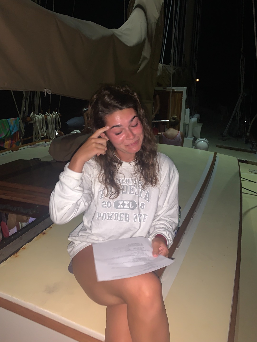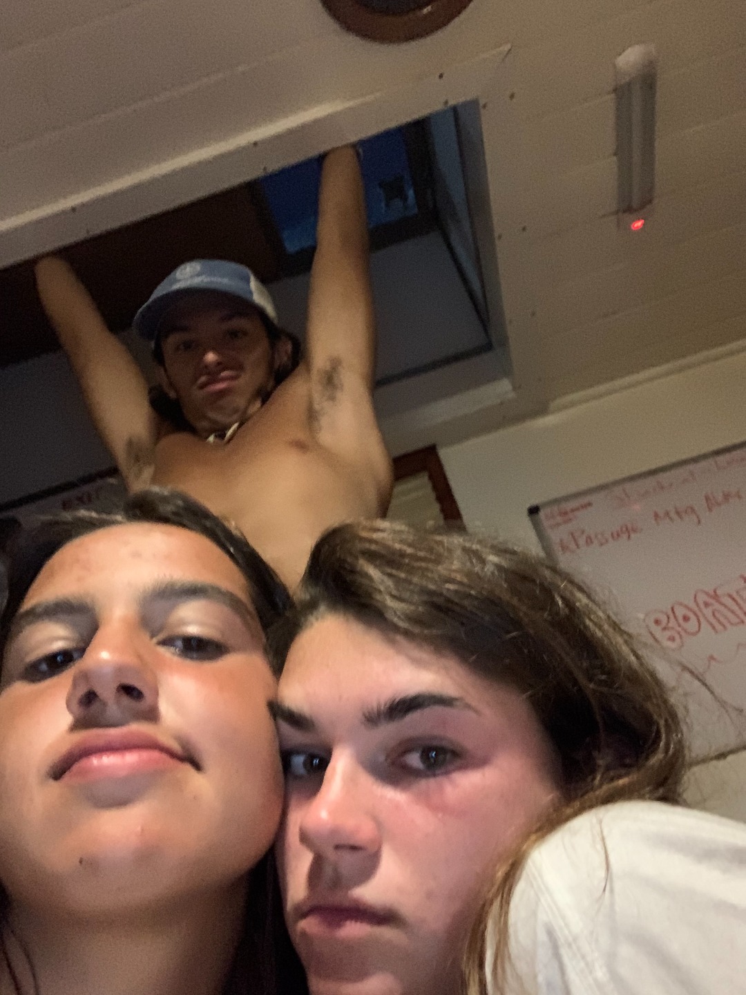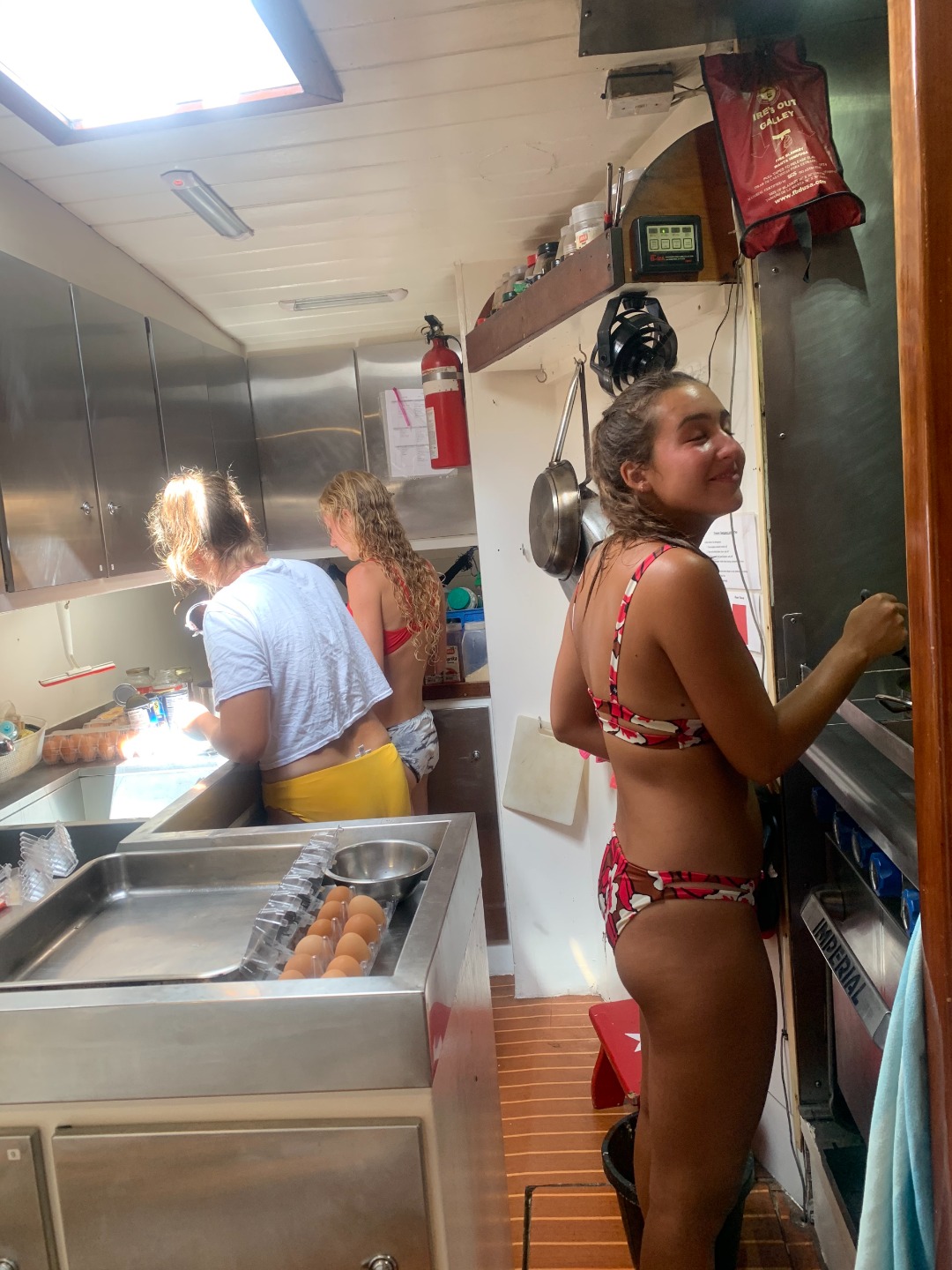 At 12, we had a delicious lunch of breakfast burritos with sunny-side-up eggs and pineapple salsa. After lunch was leadership in which we prepared for a debate about whaling on one of the Grenadine islands, Bequia, this was cut short, however, from Calum’s return from provisioning. We packed the fridge full of vegetables, meat, and most importantly, bread for the next 9 days. Now we get into a bit of a gray area when recounting the day. From after provisioning until dinner at 6, I was happily and deeply asleep. So although I am not sure what truly happened while I was sleeping, I awoke to tame stories about gorgeous dives and chill deck showers as well more “darangerous” (DA-RANGA- RUS) stories about malfunctioning ovens. Being the unbelievably kind soul he is, was helping the chefs light the oven, and there was a bit of excess gas in the air. He was met with a giant ball of fire, almost sinching his mile-long lashes. Luckily, he made it out of the galley unscathed.