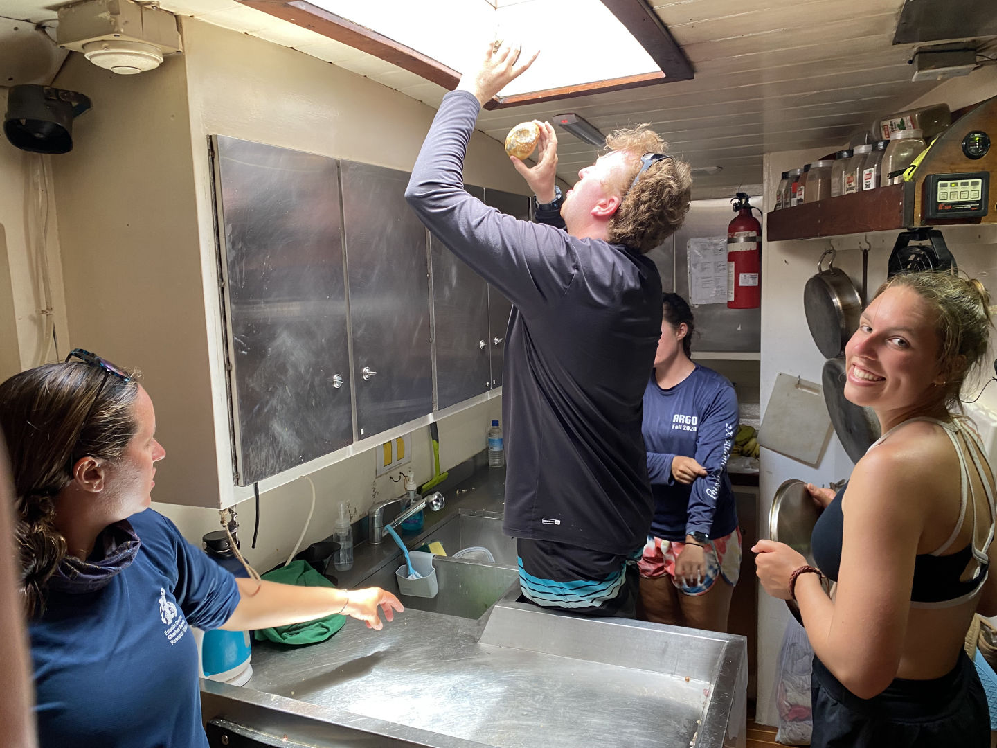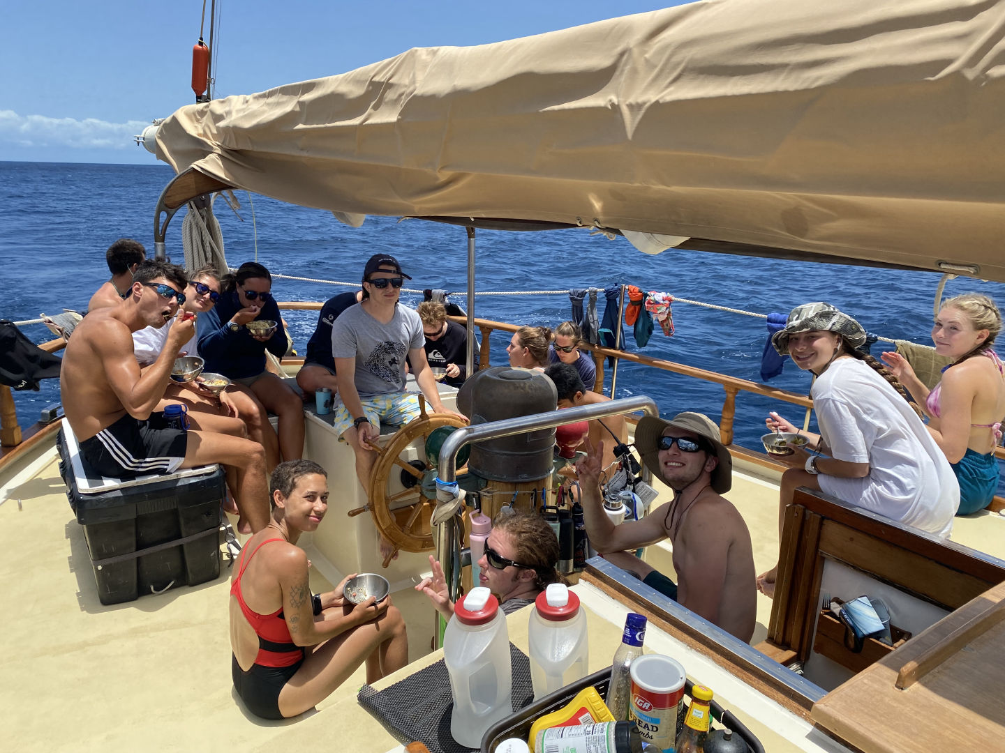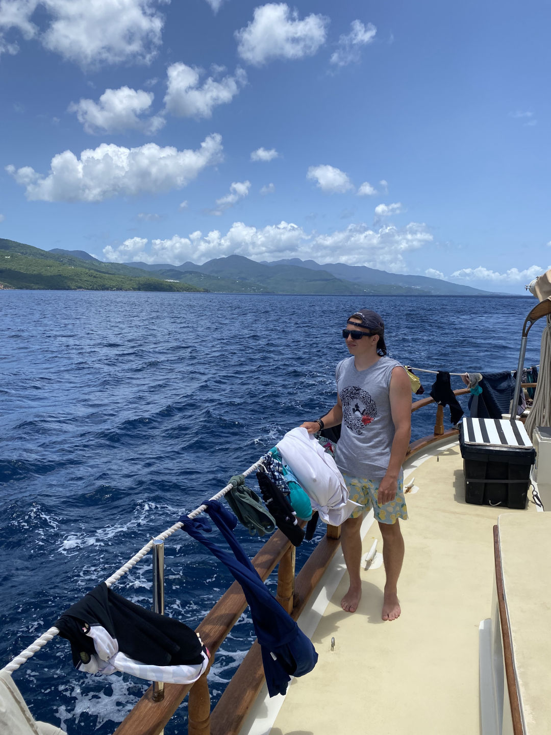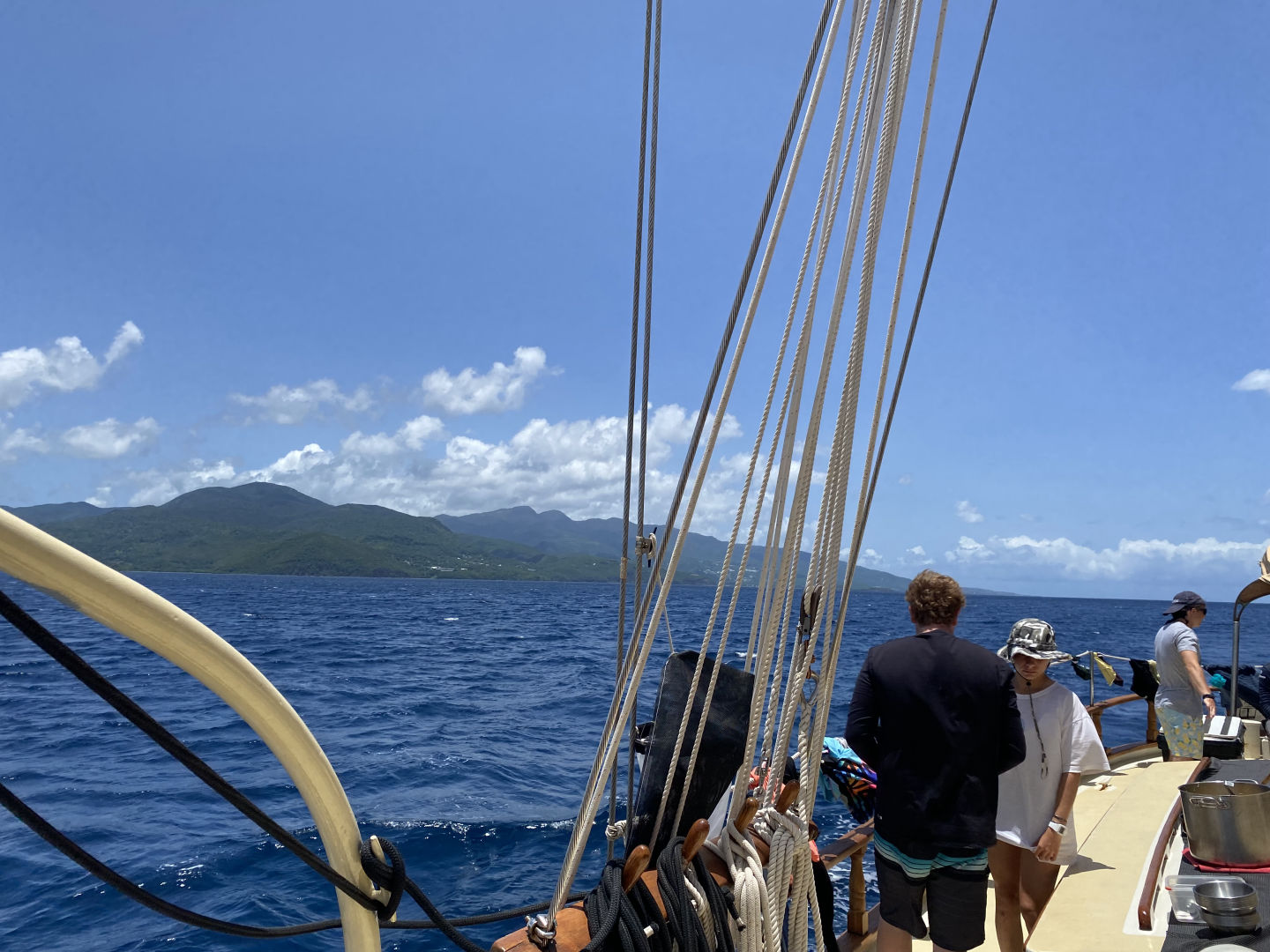 Off to another fresh start in the waters of Guadaloupe. A breakfast of blueberry pie oatmeal was followed by a fantastic dive at Jacques Cousteau’s favorite dive sight off the rocky shores of Pigeon Island. Below the surface, a large stone statue of him stood. Surrounding him were vibrant coral gleaming with life: triggerfish, damselfish, cowfish, trumpetfish, and the largest moray eel I have ever seen. As I laid down next to the beautiful green beast, I approximated its length to be about six feet and its body diameter about a foot; it’s clear someone was eating well. After a scare with a missing GoPro and then a successful recovery mission, we headed back to the boat where we took our VHF tests and earned our license, which allows us to use VHF radios (very high frequency). After lunch, we split into groups and waited for the screams up on deck, signaling the start of our Emergency First Responder scenarios. We were tasked with reacting and saving civilians (played by the staff) from injuries and conditions, including severe bleeding, neck, and spinal injuries, and unresponsiveness with no breathing. Although the scene became very hectic very fast, many lives were saved that day. After dinner, we had oceanography class and prepped for our passage the following day.