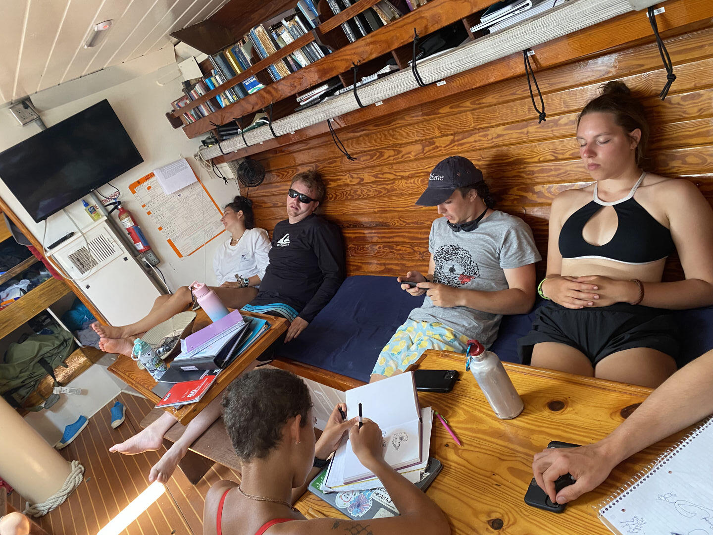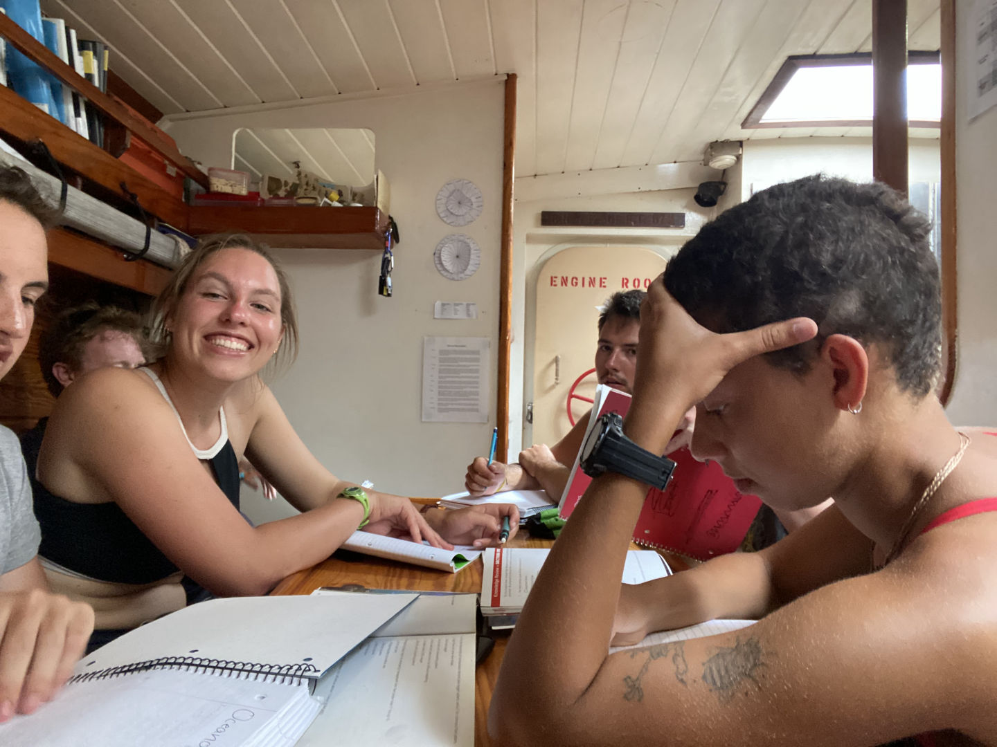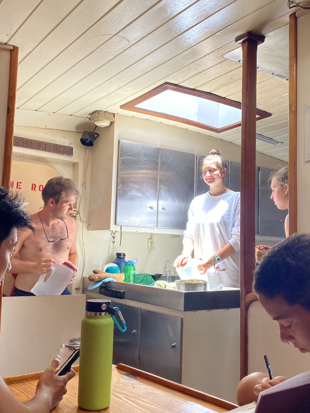 Off to another fresh start in the waters of Guadaloupe. A breakfast of blueberry pie oatmeal was followed by a fantastic dive at Jacques Cousteau’s favorite dive sight off the rocky shores of Pigeon Island. Below the surface, a large stone statue of him stood. Surrounding him were vibrant coral gleaming with life: triggerfish, damselfish, cowfish, trumpetfish, and the largest moray eel I have ever seen. As I laid down next to the beautiful green beast, I approximated its length to be about six feet and its body diameter about a foot; it’s clear someone was eating well. After a scare with a missing GoPro and then a successful recovery mission, we headed back to the boat where we took our VHF tests and earned our license, which allows us to use VHF radios (very high frequency). After lunch, we split into groups and waited for the screams up on deck, signaling the start of our Emergency First Responder scenarios. We were tasked with reacting and saving civilians (played by the staff) from injuries and conditions, including severe bleeding, neck, and spinal injuries, and unresponsiveness with no breathing. Although the scene became very hectic very fast, many lives were saved that day. After dinner, we had oceanography class and prepped for our passage the following day.
