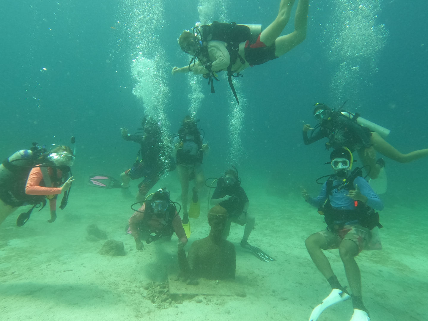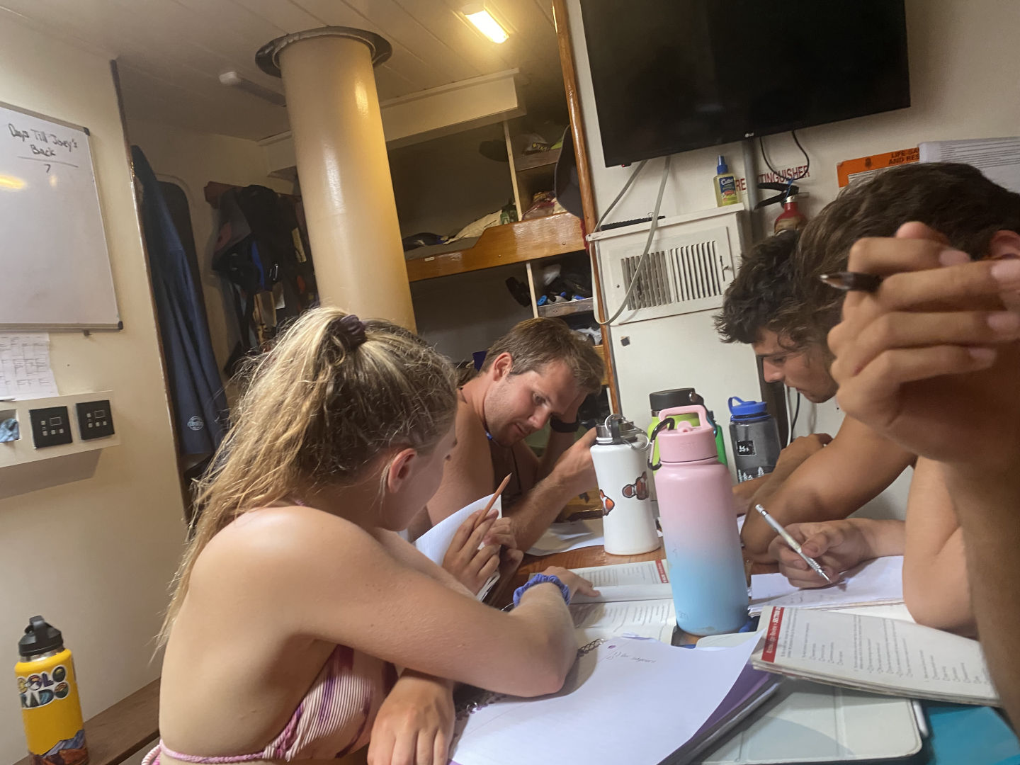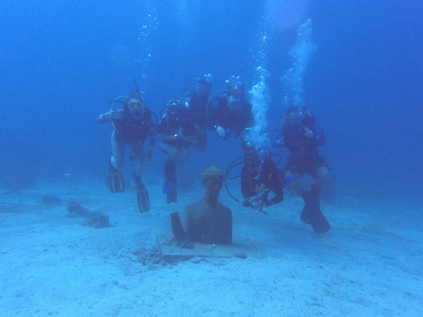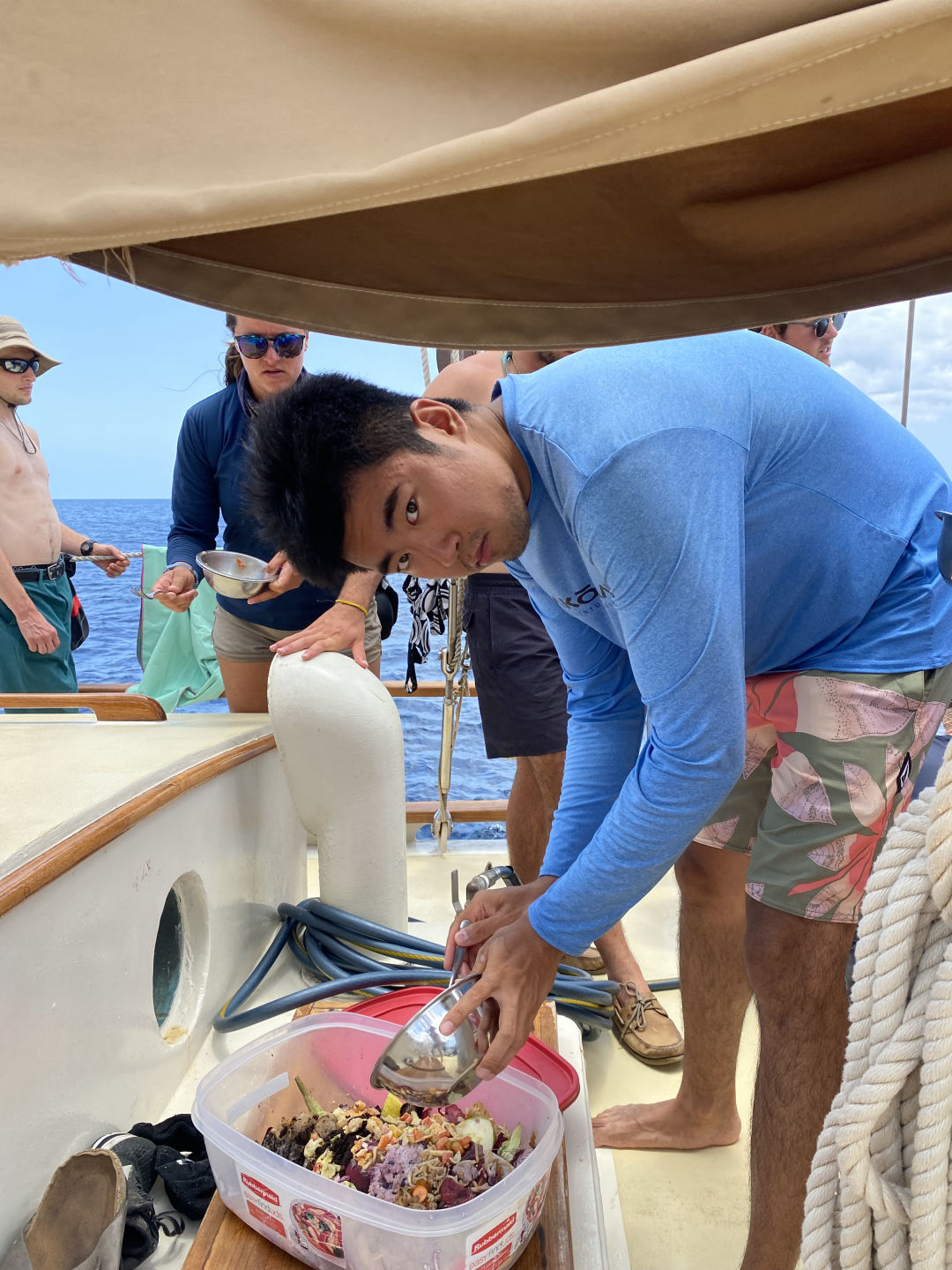 Off to another fresh start in the waters of Guadaloupe. A breakfast of blueberry pie oatmeal was followed by a fantastic dive at Jacques Cousteau’s favorite dive sight off the rocky shores of Pigeon Island. Below the surface, a large stone statue of him stood. Surrounding him were vibrant coral gleaming with life: triggerfish, damselfish, cowfish, trumpetfish, and the largest moray eel I have ever seen. As I laid down next to the beautiful green beast, I approximated its length to be about six feet and its body diameter about a foot; it’s clear someone was eating well. After a scare with a missing GoPro and then a successful recovery mission, we headed back to the boat where we took our VHF tests and earned our license, which allows us to use VHF radios (very high frequency). After lunch, we split into groups and waited for the screams up on deck, signaling the start of our Emergency First Responder scenarios. We were tasked with reacting and saving civilians (played by the staff) from injuries and conditions, including severe bleeding, neck, and spinal injuries, and unresponsiveness with no breathing. Although the scene became very hectic very fast, many lives were saved that day. After dinner, we had oceanography class and prepped for our passage the following day.