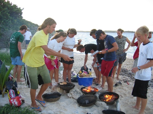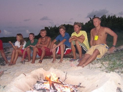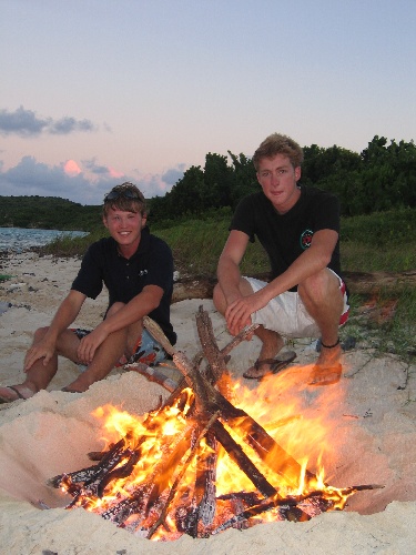 I roused the crew at 7 a.m. for a breakfast of eggs and muffins, compliments of Mark and Snoop. We departed English Harbour at 8 a.m. sharp and motored our way past the coastal Fort Berkley. Much like our passage to Antigua a few days ago, the sea was rough, and the swells occasionally splashed over the bow. Staying about 1 mile offshore, we motored the 8 miles to Green Island, which we entered cautiously due to shallow reefs. Luckily, we had the Birdman’s sharp eyes in the crow’s nest as a lookout. Today was also our final dive for our advanced certification. The Underwater Navigation dive lasted almost an hour and was smooth for all. The culmination of the day was a beach cookout and a campfire, which we all enjoyed after the hustle and bustle of English Harbour.
