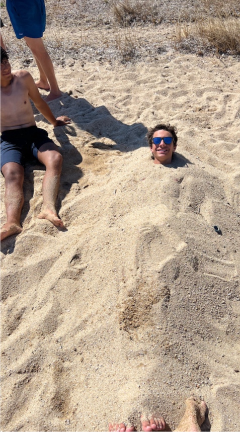 Meanwhile, the tanning team, including Piper, Lily, Sienna, Faith, Carli, and Charlize, was listening to some relaxing beach tunes. Disturbing the peace, there was a burial. Sawyer was buried with the help of Carlo, Gabe, and Brig. Shortly after this, chicken fights commenced with Piper and Gabe against Logan and Harrison, followed by Emory and Ryan. During all this, B was swimming laps, Nico and Ian were floating around. Coming towards the end of the beach fun, Axel turned into a prime architect and started building a beach club, which was made out of two planks, a net, and some rocks. He then worked on the helipad with the help of his builders and scavengers, Brig Derrick. After that, we all got dinghys back to the boat for lunch. Everyone wolfed it down as they were excited to go on shore and get phones.