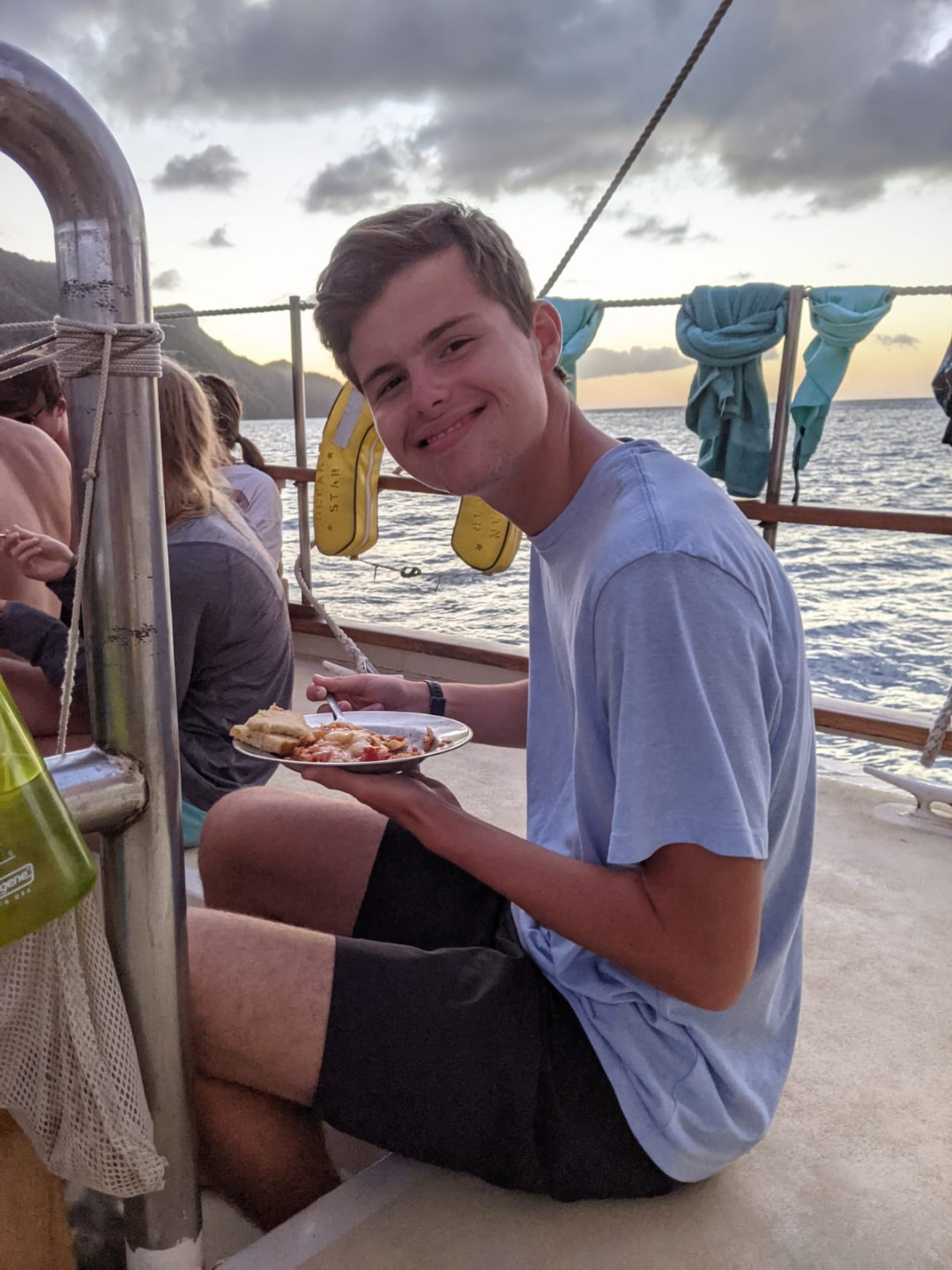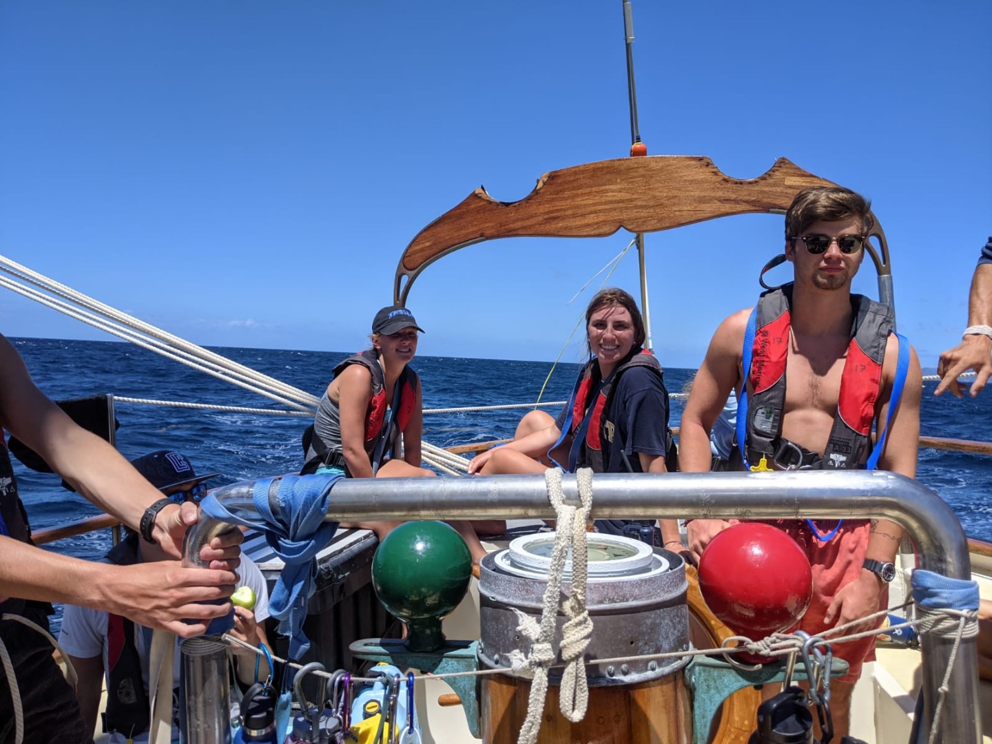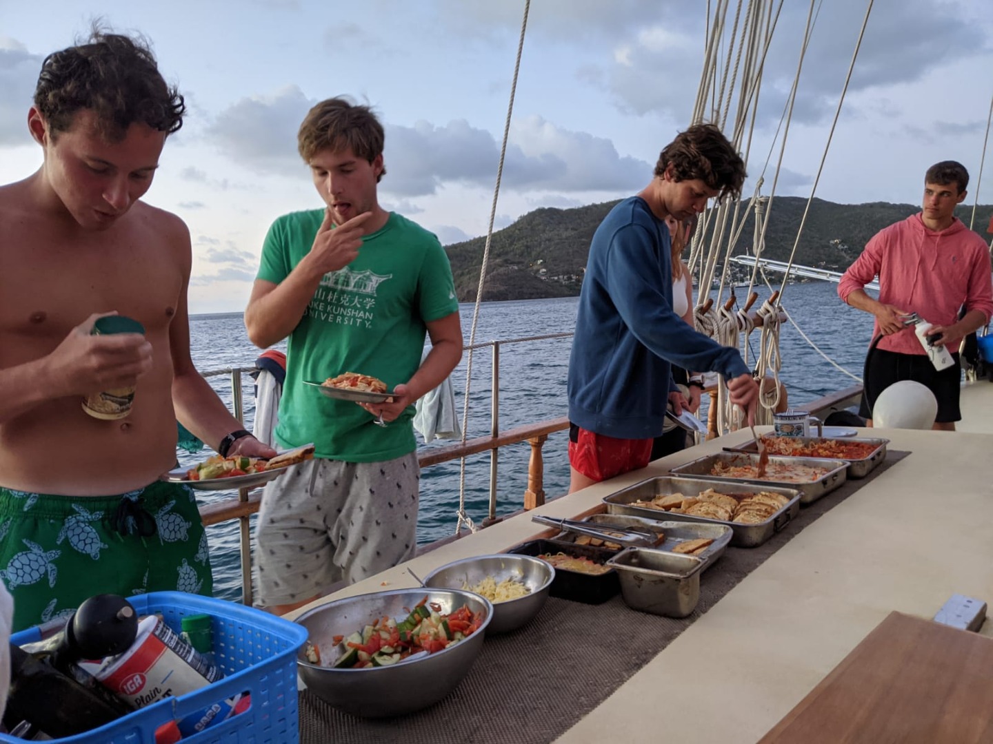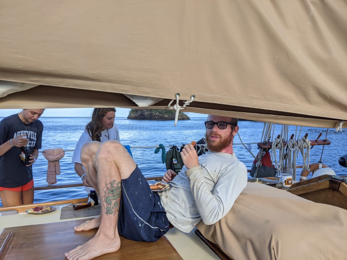 Have you ever wanted to wake up to the sound of the didgeridoo and Australian birds? Definitely possible on this boat since my go-to wake-up song is “Follow the Sun” by Xavier Rudd, an Australian musician who’s known for combining traditional instruments and Australian nature sounds. The more impressive thing is, so many people were already up and about by the time I went to wake everyone up at 7:00 am. There were a few people on deck, perhaps still awake from an early morning anchor watch and reminiscing about the sunrise some got to see. Down in the Salon, there was teeth brushing and some early morning studying, and from further aft, the galley crew busy preparing breakfast for 18 people, no easy task. The galley crew, consisting of Henry, Johnny, and Head Chef, Meg, were cooking up some pretty spectacular crepes accompanied by sausages, berries, powder sugar, and honey.