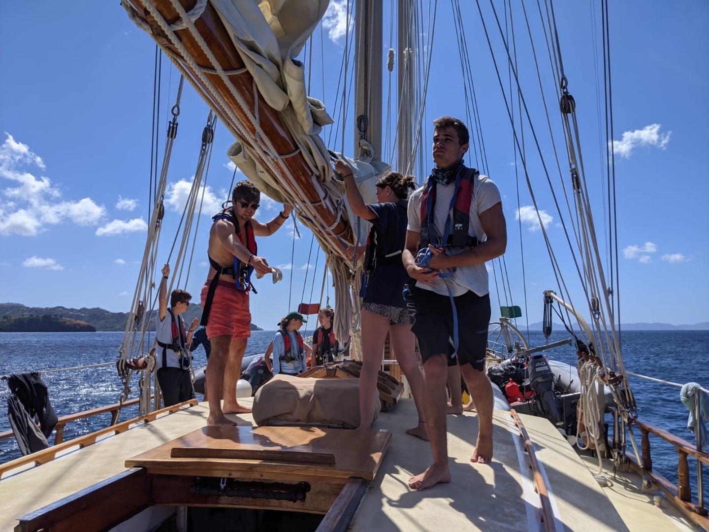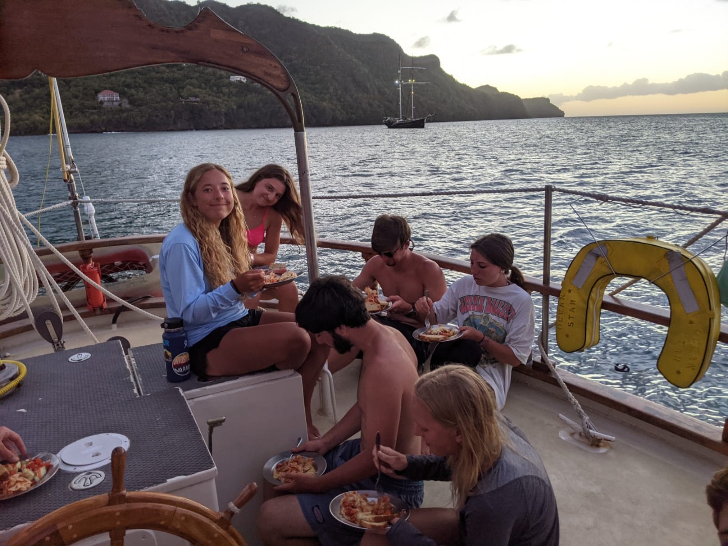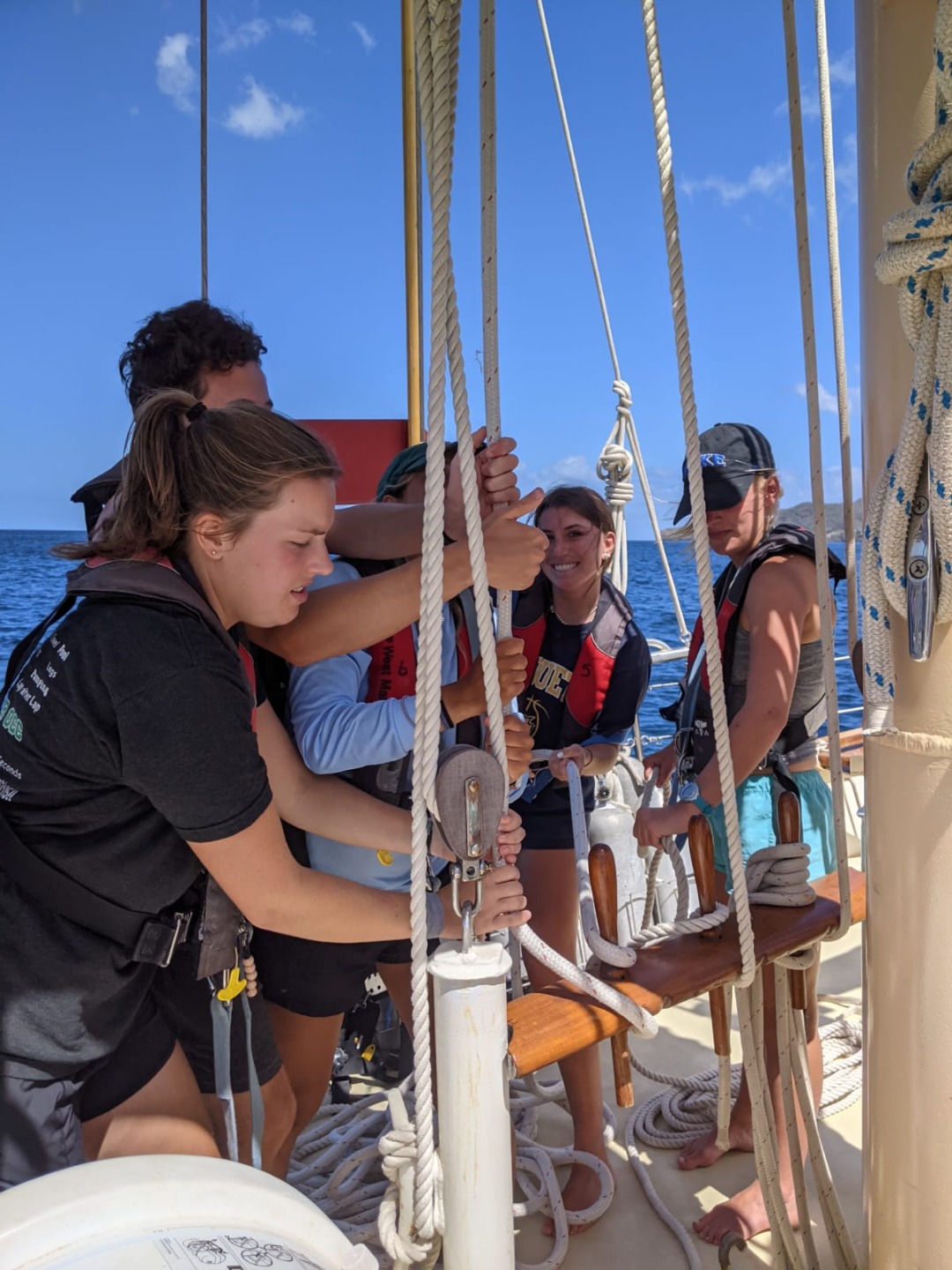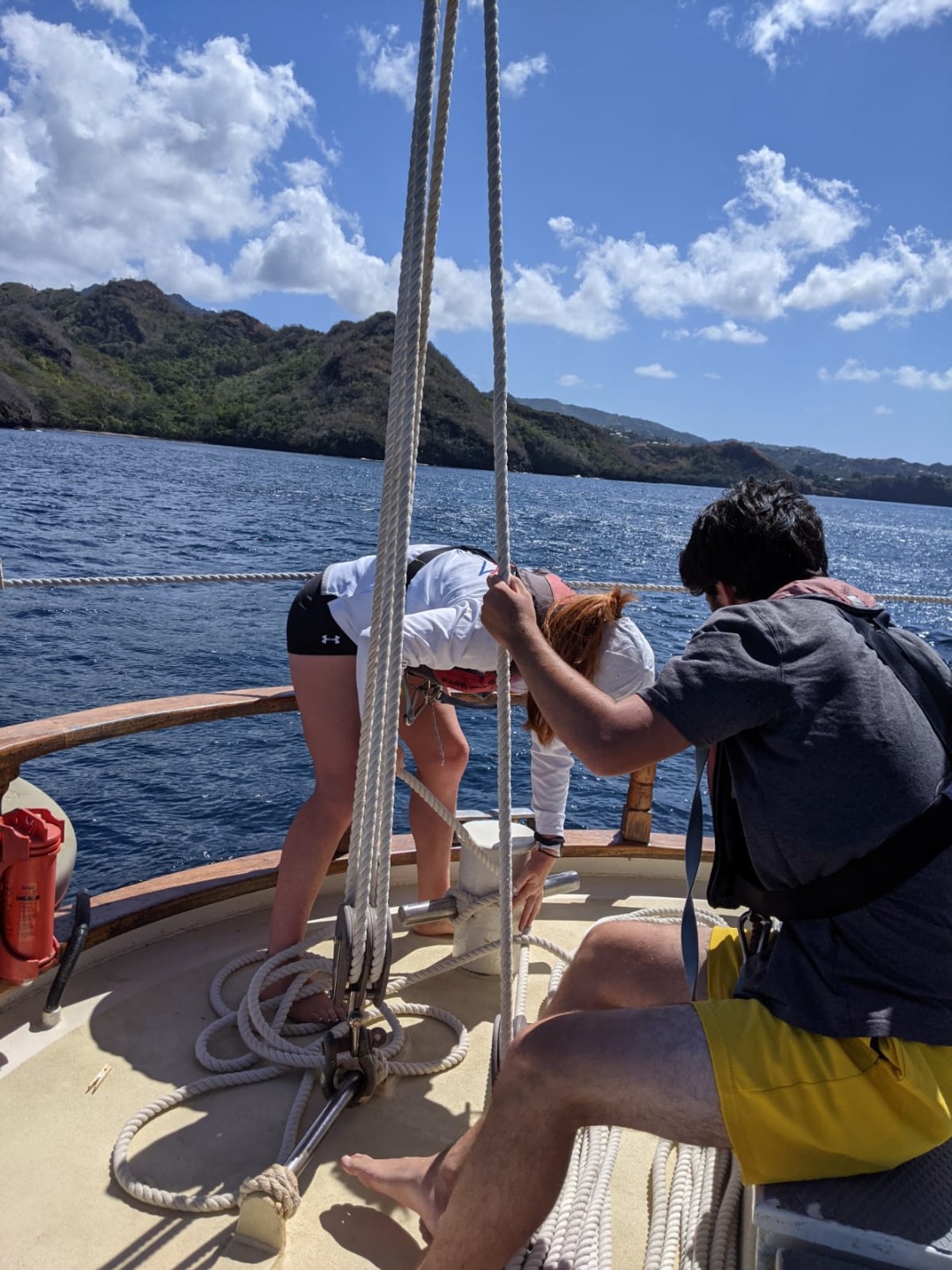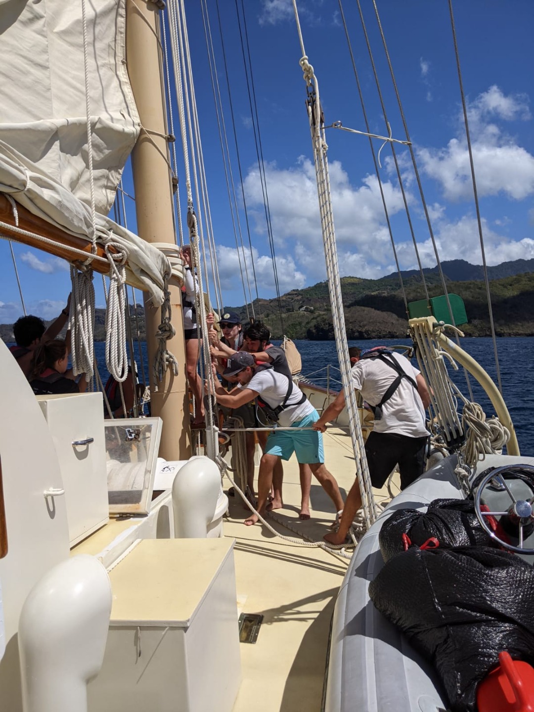 Upon finishing with Seamanship theory, we got straight into seamanship practical by raising the sails for our day sail from the island of St Vincent to Bequia, the northernmost island of the Grenadines. First, we had to “top the booms” by lifting them out of the “gallows” using a series of lines called “quarter lifts” and people power. This people’s power used on the lines is called “Sweating.” Once all the booms are topped, it’s time to put up the sails. This is also done completely by hand, and this crew is getting pretty damn good at it. Not long after we got underway with sails up and everyone comfortable, Steve surprised the crew with a fire drill to help us, as a team, stay sharp and know our roles in an emergency. After extinguishing the “fire,” we enjoyed some wonderful views and weather on deck until we arrived at Admiralty Bay, Bequia.