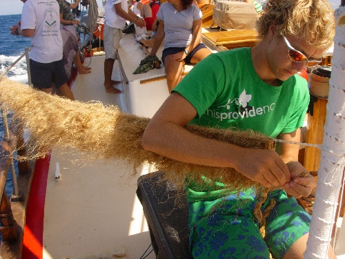After a quiet night out at the Prickley Bay Marina Bar, we awoke early to begin our 35-mile passage to Sandy Island, where we had our second Student Leadership Development class. The weather was beautiful, and the passage went smoothly. After our on-shore class, we pulled up the anchor and moved the boat to a calmer and safer anchorage in Hillsborough Bay, Carriacou. When we arrived, the small bay was filled with schooling baitfish, and larger tuna were frequently seen leaping from the water after them. The beauty of the Caribbean continues to amaze me, and the crew’s morale remains high. During the passage, Jeff successfully repaired the ratlines, Stu and Logan constructed two new baggywrinkles, and we almost caught a huge fish.