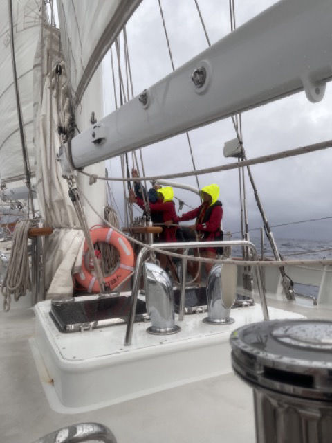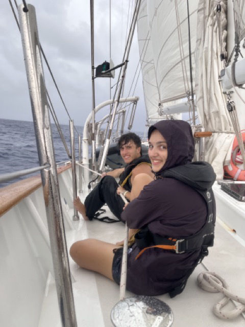 So, today was another fantastic day aboard Vela. Many of the students woke early this morning and camped out in a saloon to get some homework done before their watch. I’d like to say that the rough sea state added to the experience of studying, as it did result in both Dray and I spilling our freshly made coffees across the saloon. Despite the spilled coffee, we all had a nice morning study to churn out some homework before our classes and watch schedules. This morning we also got back our Marine Bio exams we took yesterday; we all huddled around the saloon with our noses in our graded tests and quietly asked each other, “What did ya get?”. To my knowledge, we all did pretty well, so go us! For lunch, Heloise presented us with felafel and naan bread (this is the third time this week we have had felafel and naan, but hey, I’m not complaining). After our delicious lunch, we raised the main sail in the rainy weather and continued our course to Palau. After our rainy sail handling, we sat down in the saloon for our classes, but instead of our normal lecture, this oceanography class featured a movie, which of course, raised some spirits from the rainy weather! A couple of us wanted to watch Taken, but Heather already chose an educational film on coral bleaching and ocean acidification. The film was really well done and informative, and it definitely had an impact on the students and our feelings for environmental protection, especially the protection of coral. As the movie played below deck, the rain on deck got heavy, which resulted in us having a below-deck dinner! Tonight’s dinner was a chicken lo mein with a variety of chocolate naan bread with caramel and bananas. Dinner was excellent, and it was really nice to stay dry below deck.
