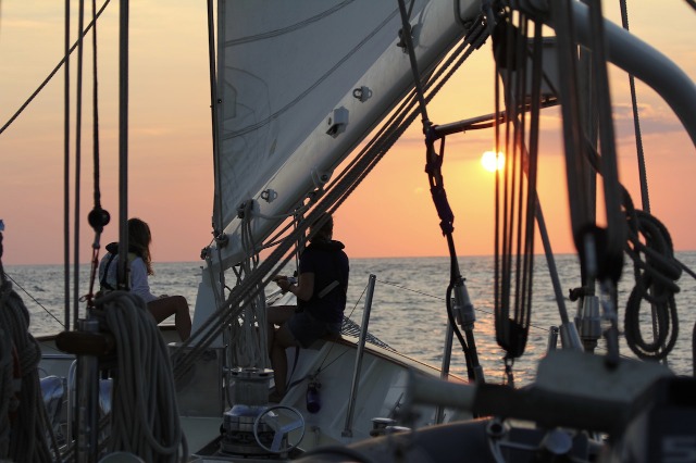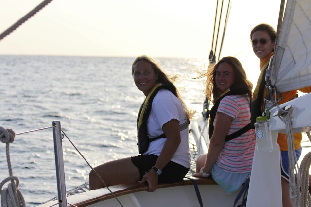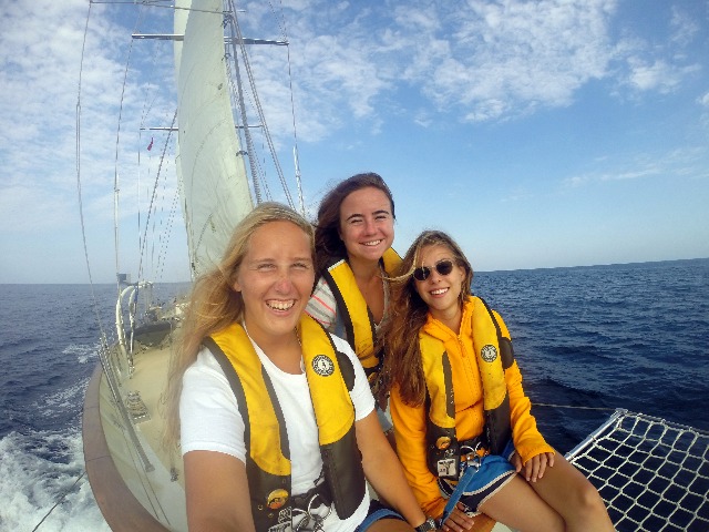 To me, today has been the best yet on this 90-day voyage. The crew of Argo awoke for a standard 0730 breakfast with coffee cake (I mean, come on, any day that starts with cake has got to be a great day!!) After breakfast, the crew quickly and efficiently finished passage prep and made Argo look and feel as though she was ready to venture out into the Indian Ocean. Benches were stowed, cabins cleaned, down below was 40-40, and dock lines were thrown off as we cast away from Bali and Southeast Asia. As we motored out of the channel and prepared to raise the mainsail, staysail, and forward staysail, the student crew began to take charge as their knowledge of Argo and her lines started to become second nature. We quickly raised these three sails, and watch team three began our watch team rotations for this passage. As we came around the coast of Bali, we raised the jib and fisherman sail as well and maintained 7.5 knots. After lunch, when my watch, watch team two, was on deck, we saw multiple pods of dolphins throughout our 2-6 watch time. We used a camera with a great lens and our dolphin and whale ID book to identify some as Rissos Dolphins and others as Spinner dolphins. It was amazing to watch the dolphins smack their tails on the water to stun their prey and jump feet out of the air while doing multiple spins. It was a truly memorable experience! Not long after our many encounters with dolphins, the wind picked up slightly. We eased the sails out to a beam reach and turned off the engine. It felt great to officially be in the Indian Ocean sailing Argo under (almost) full sail while the sun was beginning to set. Right as we had gophered, Argo’s term for bringing meals up on deck, another pod of dolphins graced the entire crew with their presence. Everyone was able to witness this magical moment of no land in sight, a beautiful reddish-orange sun setting with dolphins jumping all around. As we all gathered around the cockpit for our squeeze, everyone had to show off their best dance moves for 5-10 seconds. My personal best is the scuba instructor regulator recovery, but other notable ones were the orangutan dance, the hula hoop, Bollywood, and the finger guns. This evening is coming to an end with all 30 of us sitting around the cockpit enjoying a great dinner of Sloppy Joe’s with smiles on our faces. Words can’t explain how excited the crew of Argo is to finally start the crossing of the Indian Ocean.