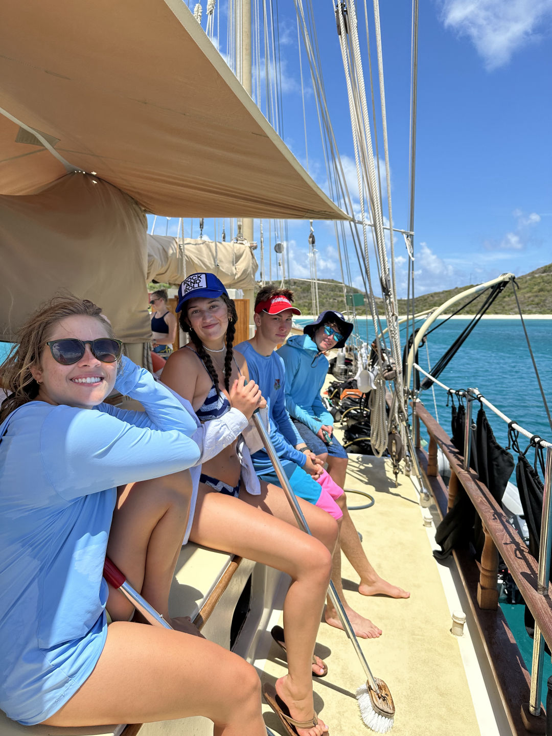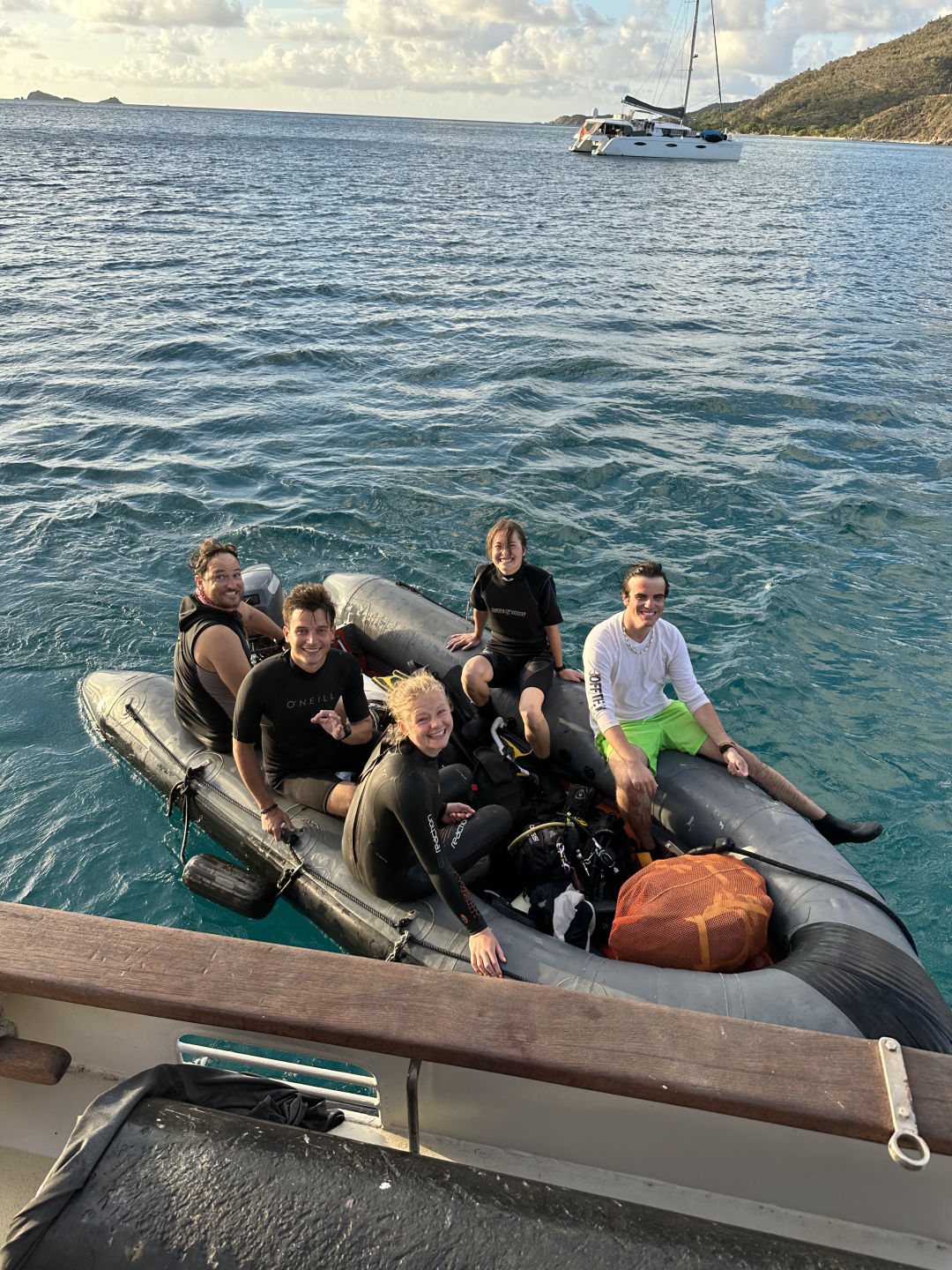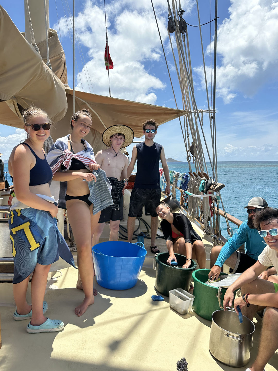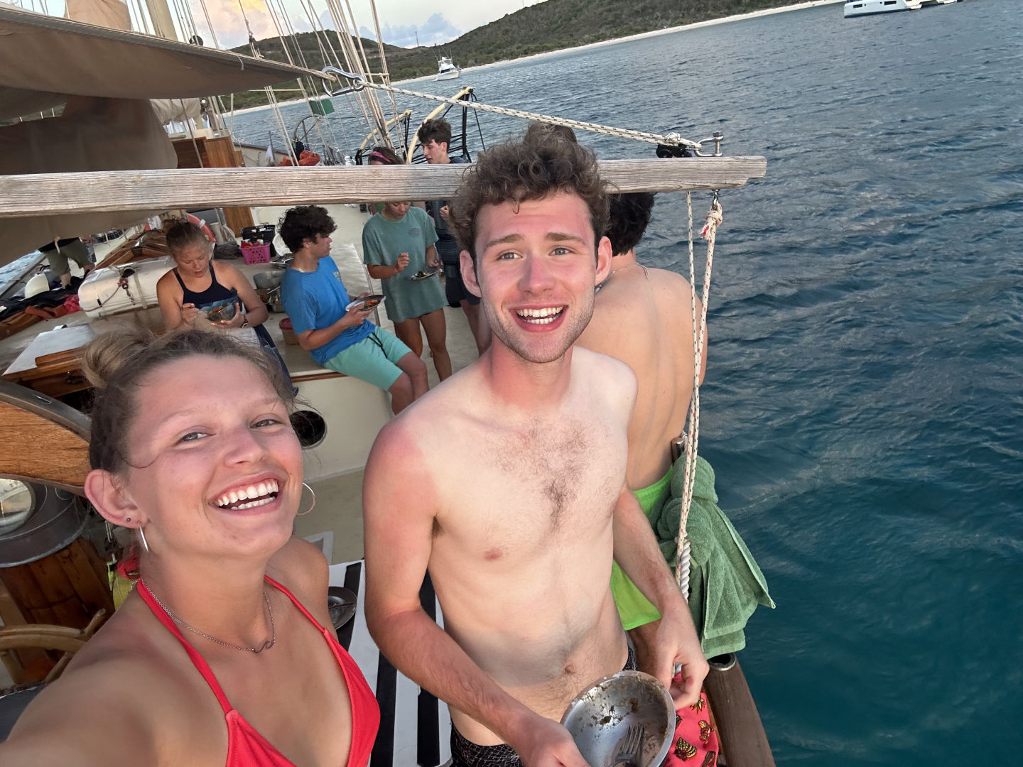 The day started with a soft wakeup, some delicious egg frittata, and going over the day’s schedule. This included those getting their open water scuba certification to watch some very important and interesting videos by PADI, and the advanced scuba certs completed their check-out dive. The open water certs then practiced assembling their scuba gear and getting ready for their first in-water lesson after lunch. Between lunch and afternoon activities, students jumped in the ocean from the boat to cool off. For lunch, we had a refreshing hot soup. After lunch, we had three different dive groups head out to complete their in-water lessons. I was a part of the open water group, and we were in the water all afternoon going over drills and skills. While the open-water students learned to breathe underwater, the advanced students made the unanimous decision to push all their homework to this evening and take the afternoon off sailing and paddle-boarding to a nearby beach. Savannah Bay is currently home to multiple student/kid voyages, including Argo, which lets the Ocean Star students use their sailboats and paddle boards. From what I’ve heard, they had a fun homework-free afternoon that only consisted of one casualty…a red Gonzaga visor ending up in the bottom of the bay.