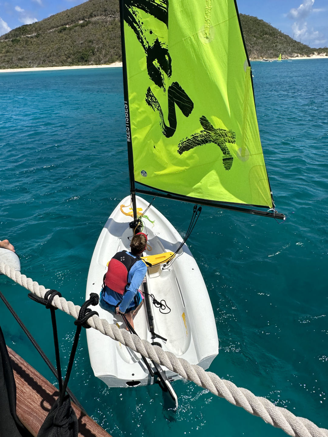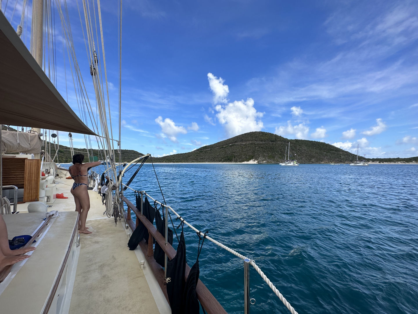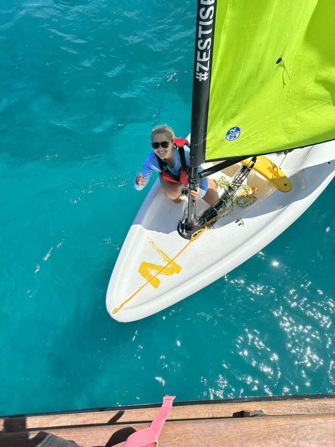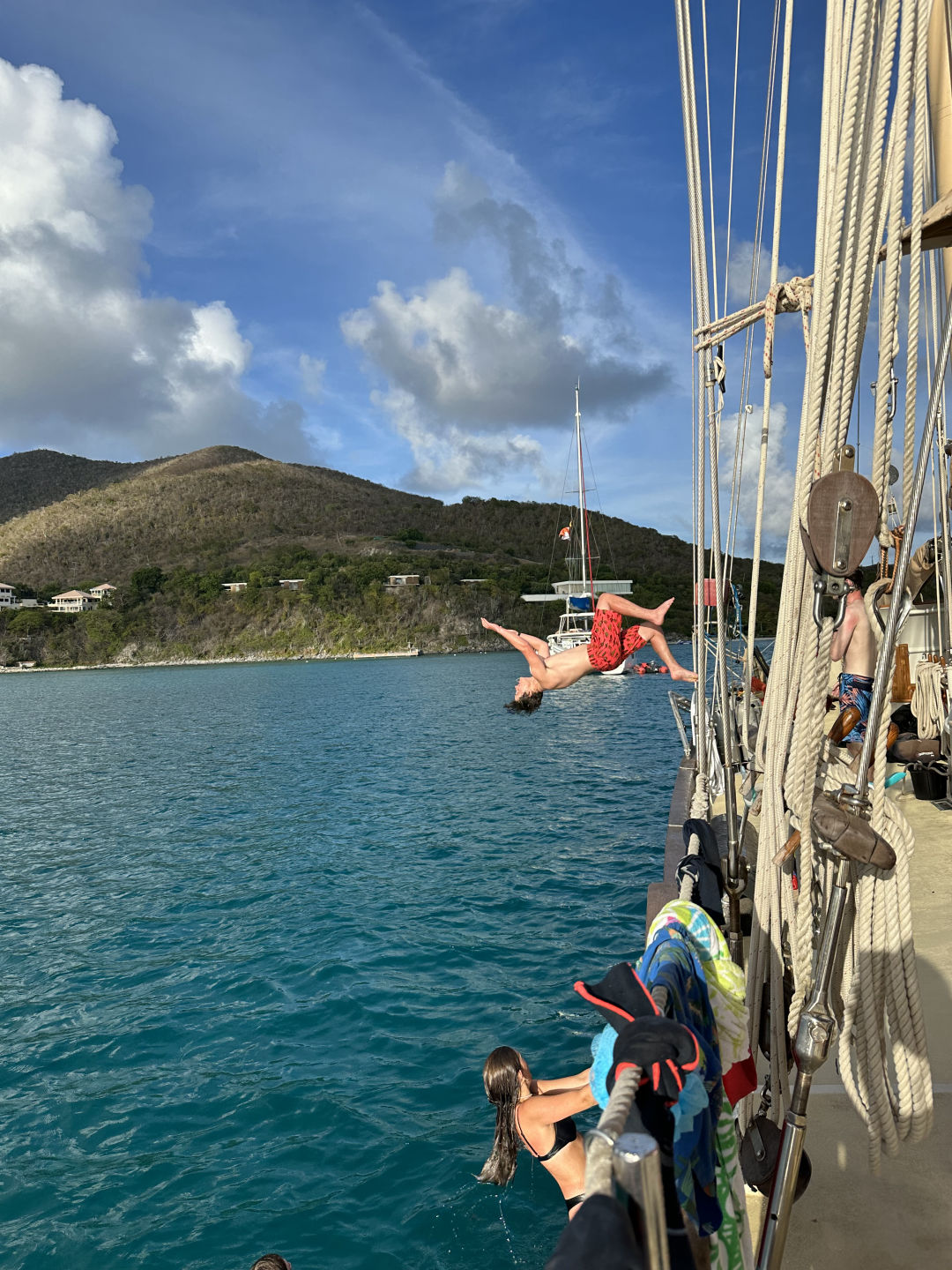 The day started with a soft wakeup, some delicious egg frittata, and going over the day’s schedule. This included those getting their open water scuba certification to watch some very important and interesting videos by PADI, and the advanced scuba certs completed their check-out dive. The open water certs then practiced assembling their scuba gear and getting ready for their first in-water lesson after lunch. Between lunch and afternoon activities, students jumped in the ocean from the boat to cool off. For lunch, we had a refreshing hot soup. After lunch, we had three different dive groups head out to complete their in-water lessons. I was a part of the open water group, and we were in the water all afternoon going over drills and skills. While the open-water students learned to breathe underwater, the advanced students made the unanimous decision to push all their homework to this evening and take the afternoon off sailing and paddle-boarding to a nearby beach. Savannah Bay is currently home to multiple student/kid voyages, including Argo, which lets the Ocean Star students use their sailboats and paddle boards. From what I’ve heard, they had a fun homework-free afternoon that only consisted of one casualty…a red Gonzaga visor ending up in the bottom of the bay.