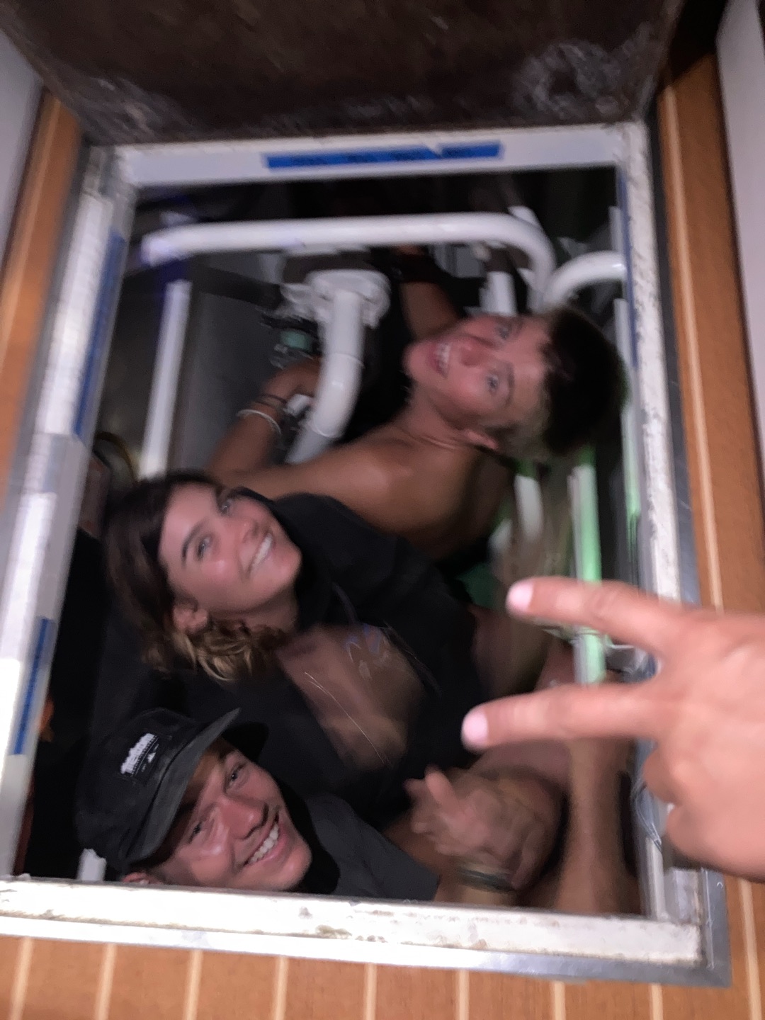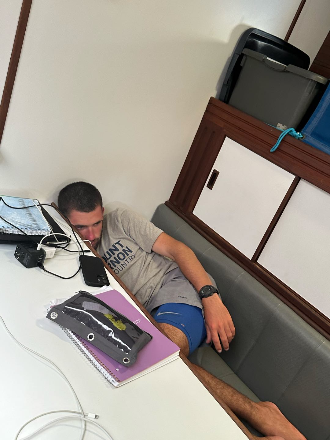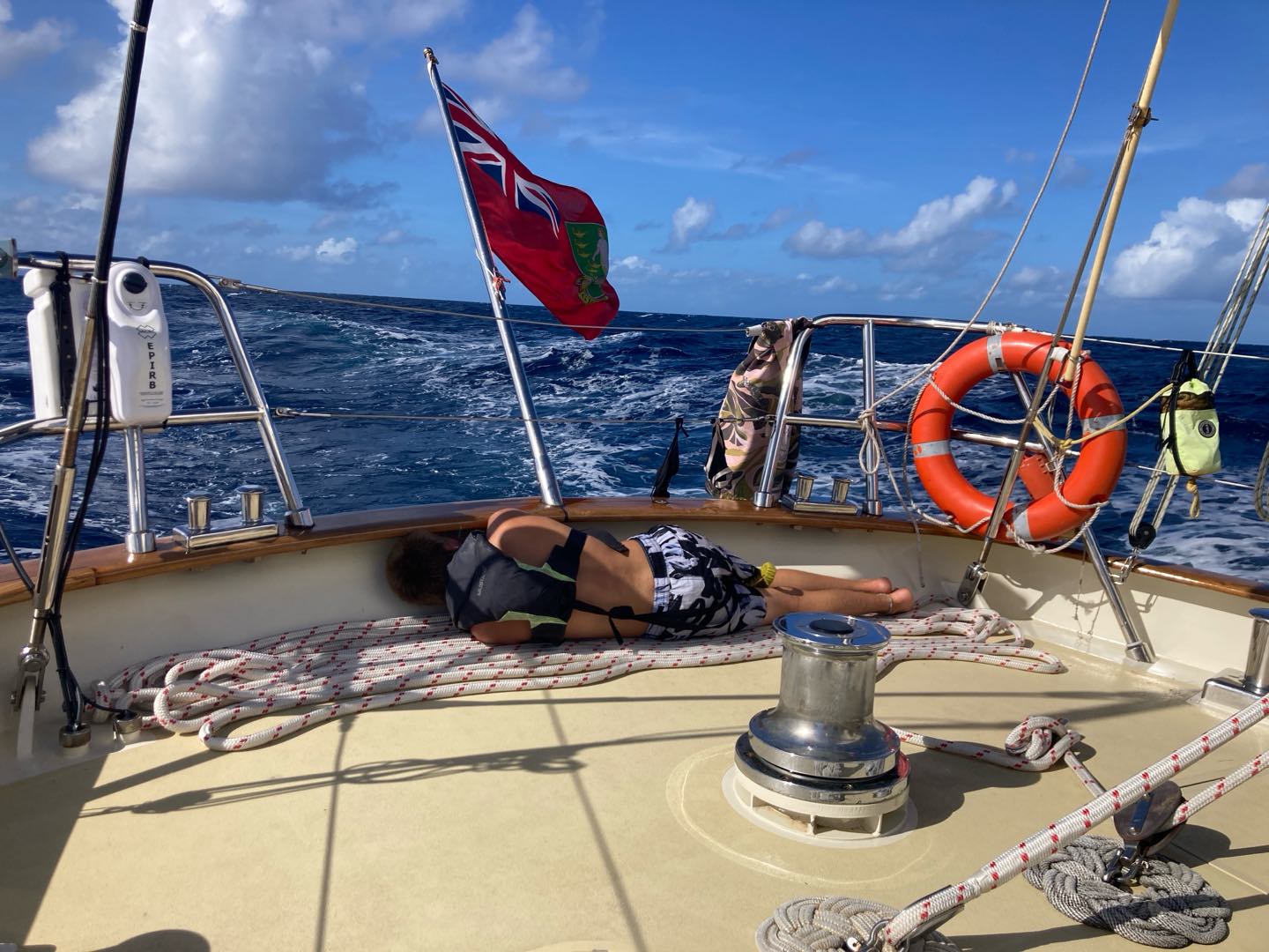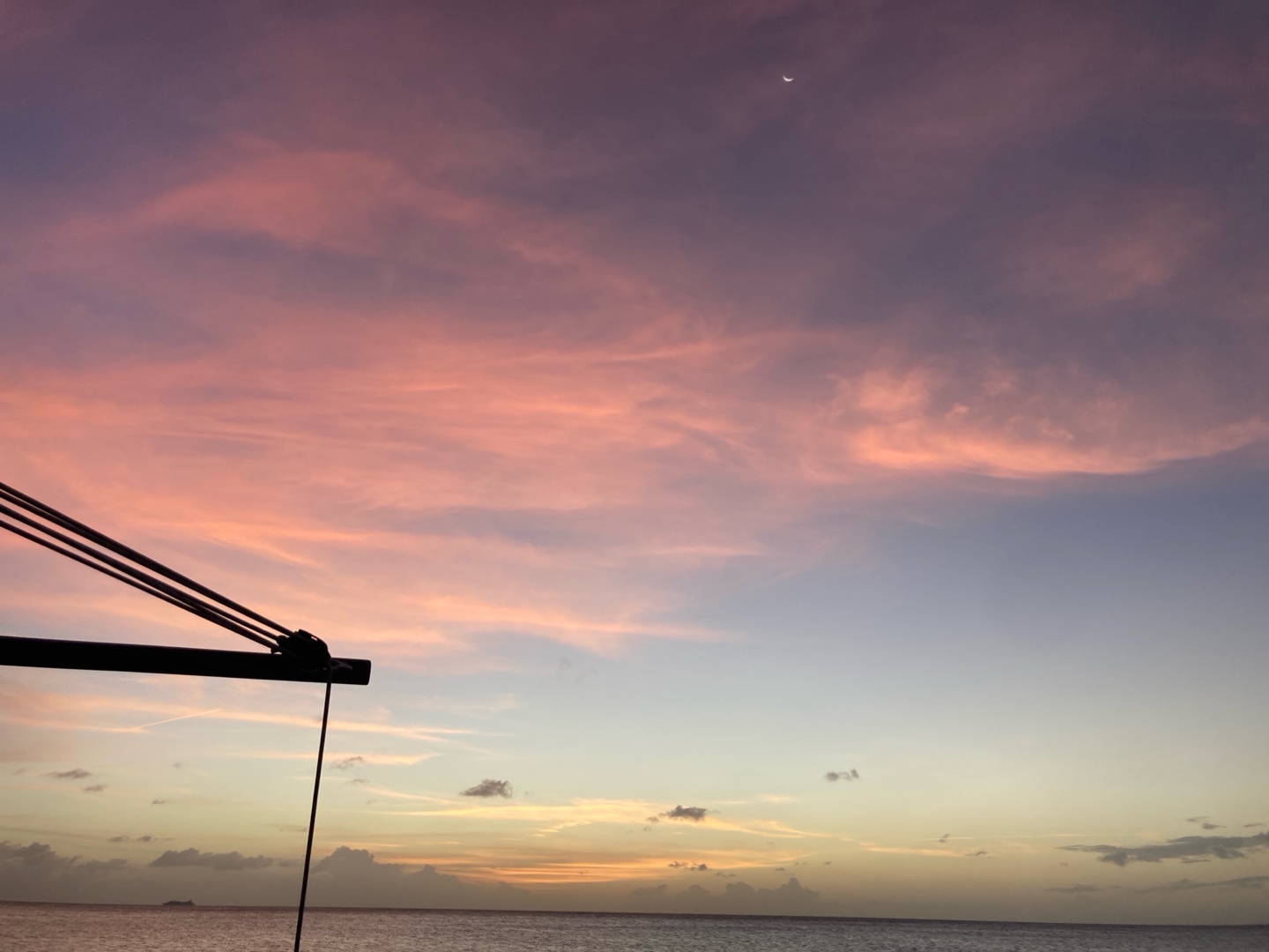For my squeeze question, we played a little personality test game where I had everyone think of the first three animals that came to mind. Then I told them what the meaning is: the first animal is what you see yourself as, the second animal is what others see you as, and the third animal is what you actually are. To end the squeeze, we played a game of down-by-the-banks and discovered some of our regional variations in the lyrics. We then prepped for our VHF seamanship class, which will happen soon after cleanup, by practicing the alphabet. Here it is (a bonus opportunity for me to practice right now): alpha, bravo, charlie, delta, echo, foxtrot, golf, hotel, india, juliet, kilo, lima, mike, november, oscar, papa, quebec, romeo, sierra, tango, uniform, victor, whiskey, x-ray, yankee, zulu. I hope none of those are wrong. Otherwise, that would be really embarrassing. Overall, it’s been a pretty chill day, a little sleepy seasickness, a bit of cramming for our research projects due tomorrow, excitement over visiting a new (French!!) island. We know passage prep and boat to bed like the backs of our hands these days! And not too many pranks or jokes… as far as I know. Maybe the joke’s on me.
