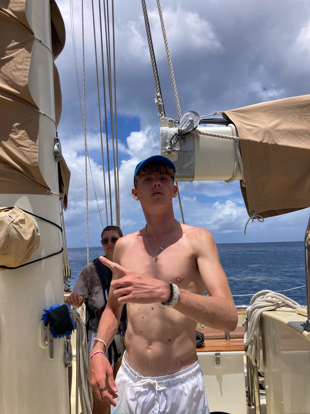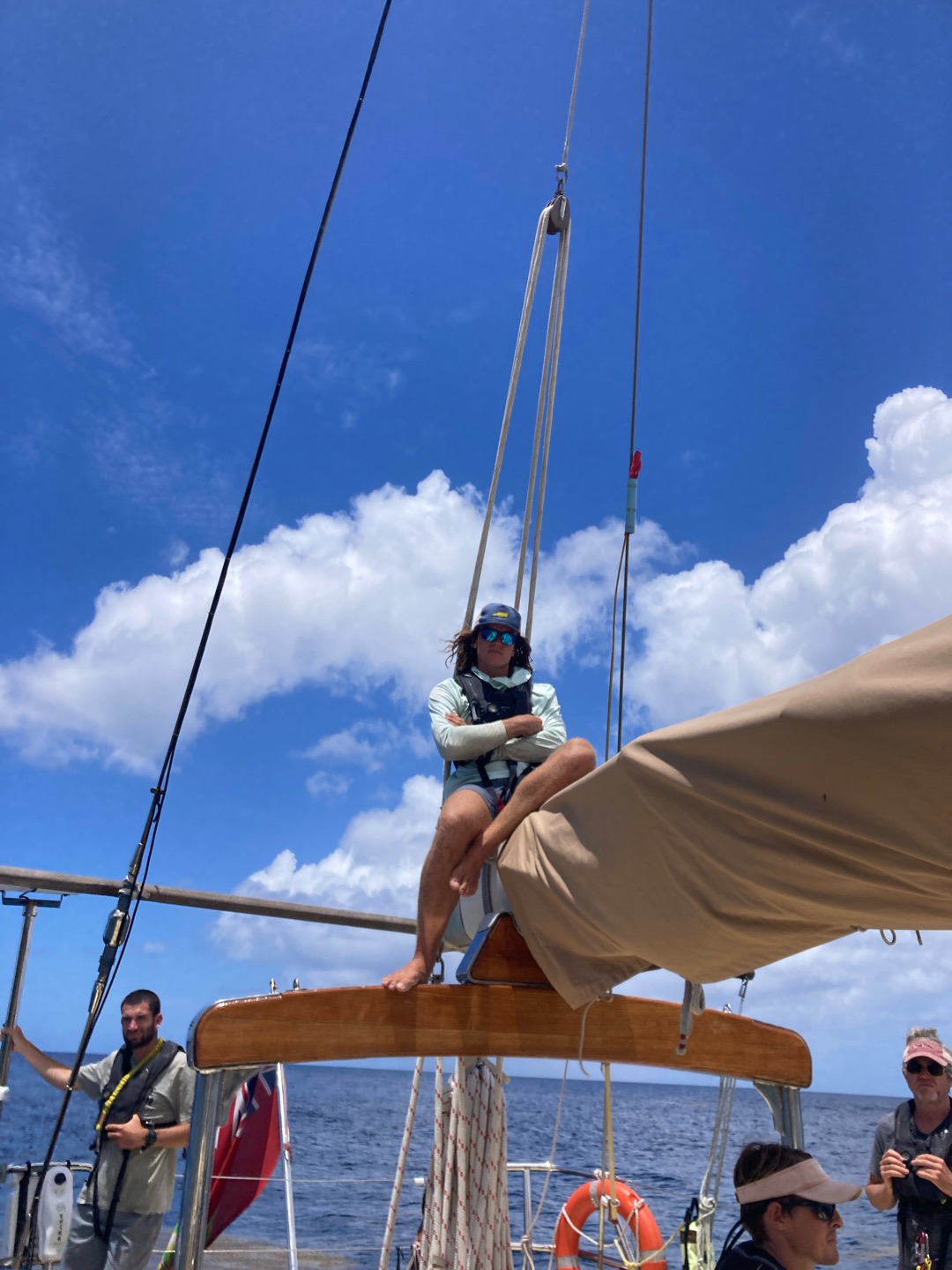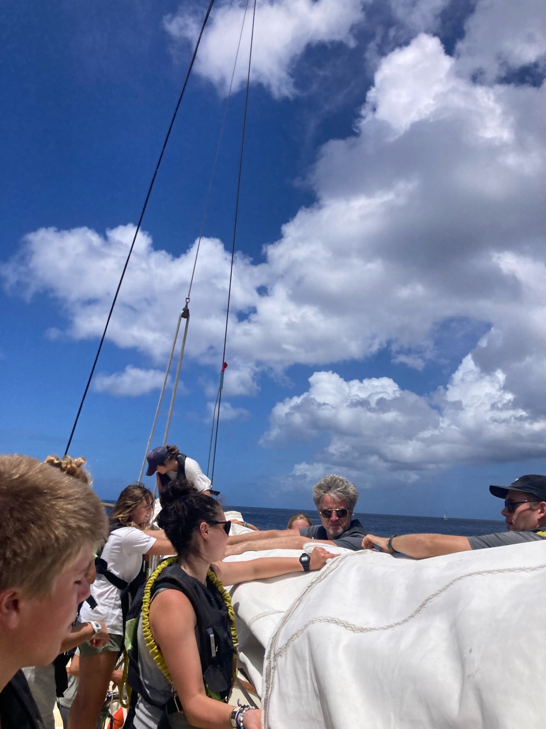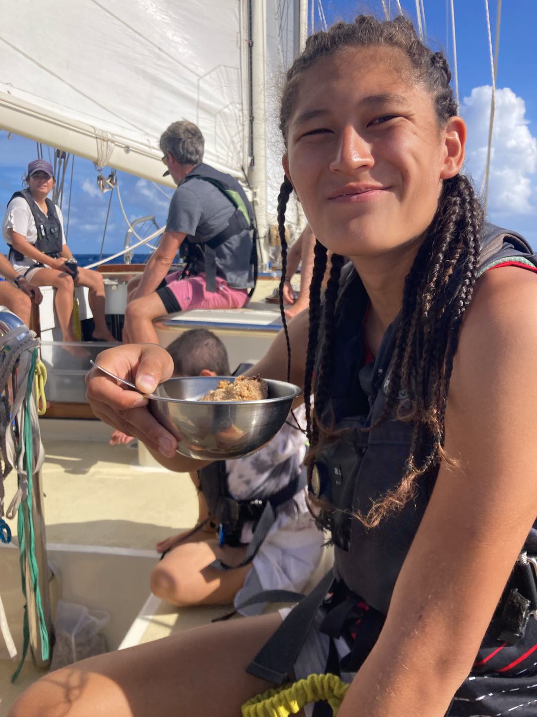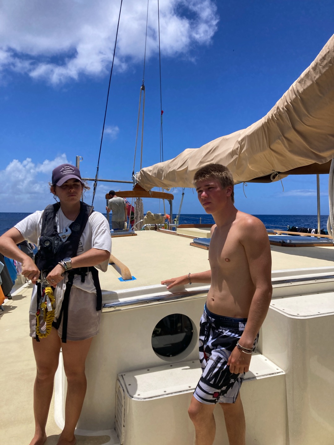We’ve made it to Martinique! Today’s foolish day started bright and early with 6 am wakeups and all hands on deck to sail off our anchor at Rodney Bay, St. Lucia, and set off to Martinique. We sped through, raising our sails while our neighbor’s super yacht, Dragonfly, coincidentally set off right before us (too bad they couldn’t see how cool we looked). I had the privilege to helm while we were sailing past the point of Pigeon Island with tons of wind! After we were underway, we had a lovely breakfast made by Nicole and Maddy of coffee cake, yoghurt, granola, and cereal. We were expecting a 5-6 hour passage to get here around early afternoon, but instead we absolutely sped and arrived a bit after 10 am. The day felt so long already before lunch! We reached at least 10 knots while I was helming, which was pretty exciting, though it did bring back an unwelcome bout of seasickness for much of our crew. During our passage, we intended to watch the movie Endurance as part of Leadership class, but experienced some technical difficulties, so we ended up having a brief moment of free time before it was time to drop sails since we’d already arrived. We sped through the boat to bed, getting sail covers on and halyards off before the anchor was even fully down. Then it was time for lunch, which consisted of caprese sandwiches. We’ve been putting our food in the cockpit or at mid-ships while the grab rails on top of the chart house are getting revarnished, which makes for an interesting deckie-ing situation. After the clean-up, we had a marine biology lecture from Ben on fisheries management. It was another one of his famous 2-hour-long lectures, which, while it was interesting, there must’ve been something in the air since almost every student (as well as Ben himself) took a fat nap afterwards and woke up completely discombobulated and thinking it was morning. Right before dinner, Meg gave us a quick class on using an emergency oxygen tank for diving, which the Rescue Divers practiced setting up. Then, we had dinner of veggie stew to wrap up the day.