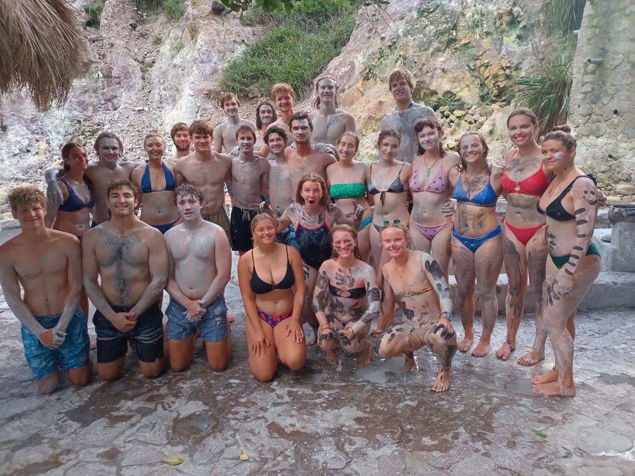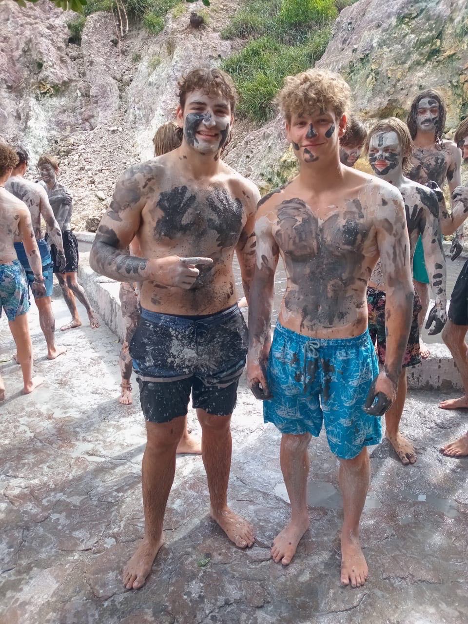 Once we got to the mud baths, we all covered ourselves in the clay mud stuff and then swam in the volcanic hot springs. It was really freaking cool. Mac decided to make a slide out of a waterfall, which we then found out wasnt allowed (oops, oh well). Everyone took turns drawing with the mud on each other before washing it all off in the hot springs. On our way out, Boston and Max grabbed some coconuts to drink, Audrey bought a magnet, and a few others bought some little trinkets and doodads.