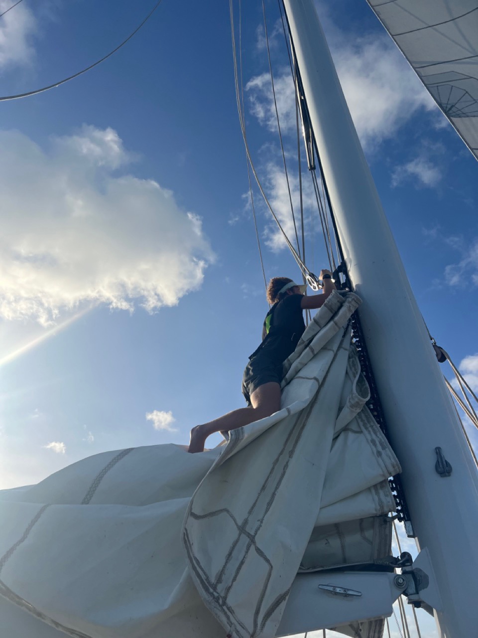 Once all the preparation was done, we got underway (and ahead of schedule!!) Great work squad. We motored out of our mooring, and then, once we got a bit offshore, we threw the sails up and began sailing! Pretty awesome because James thought for sure we wouldnt have enough wind to sail, so big wins there. Were currently averaging between 6 and 7 knots with the staysails and the Main up on a close haul Theo just came in and told me theyre raising the Jib now, so were probably about to go even faster!