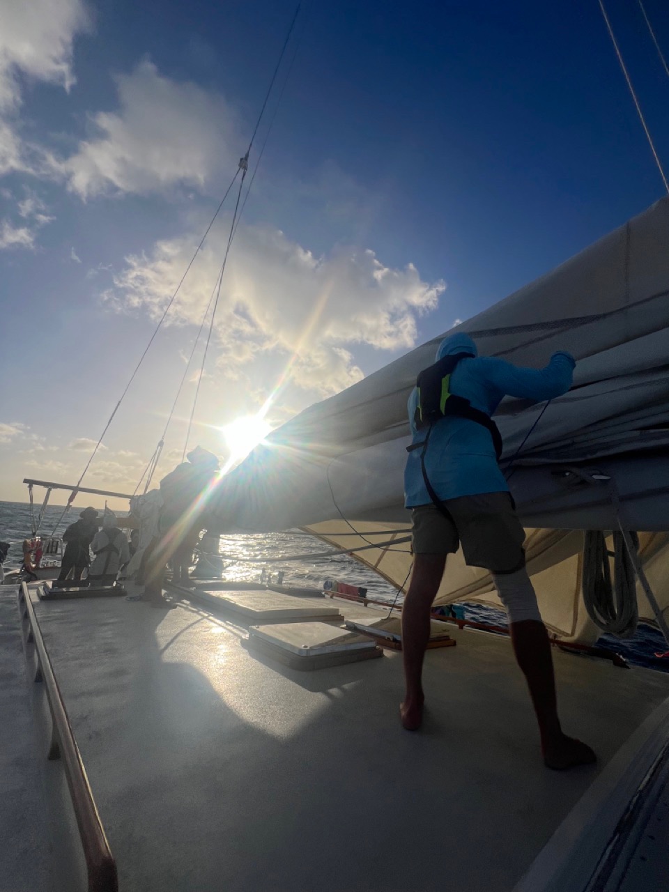 Howdy blog readers! Today, we had ourselves a DAY. I started the day by going for a morning swim with Grace C, Audrey, Ruby, Mich, and Grace N., and then woke up everyone else by blasting All I Wanted for Christmas Is You by Mariah Carey into all the forward cabins to wake up the rest of the super sleepy sleepy persons. Our head chef today was Watson, with sous chefs Grace C and Theo. Let me tell you, when you put Watson in the galley, he gets stuff done. We were treated to an EARLY breakfast of delicious pancakes and eggs with a side of melon. I peeked into the galley at 6 am when I woke up and saw Watson already slaving away with a headlamp strapped to his forehead so he wouldnt wake up Luke what a guy.