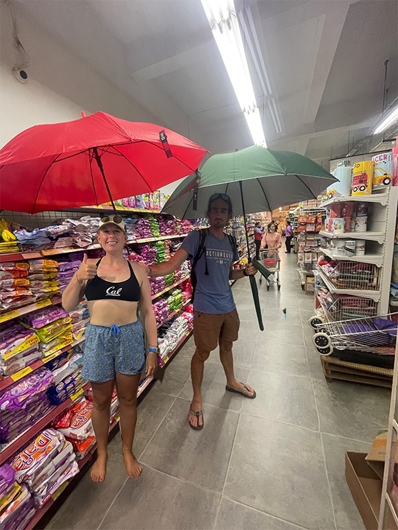 Arriving in Sorong also meant time for a vegetable top-up. So, after lunch, Gabe and I hopped over to shore to visit the grocery mart. BUT, before we left, Sidney was chatting about how much she truely hates umbrellas. It may have started last night after the squeeze question of what would you write a self-help book about, and her answer was how to not use an umbrella. It turns out she hates them dearly in all senses, “I just believe in the proper gear for the outdoors.” So fair.