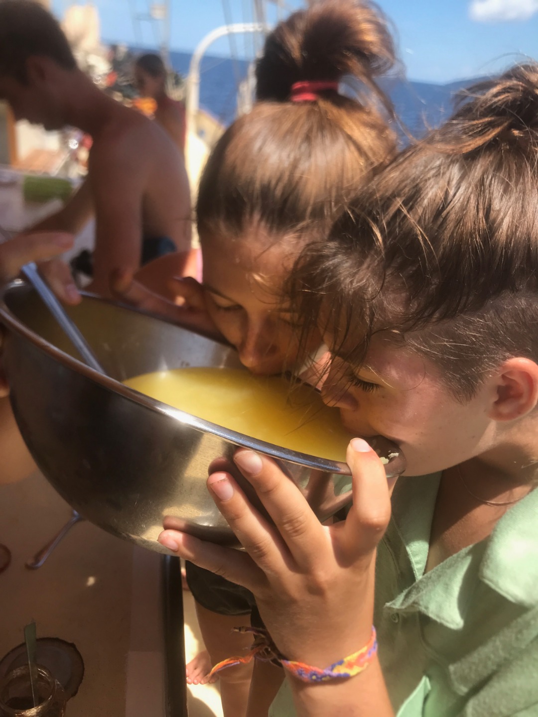 20. Vivian and Amelia going ham on some pineapple juice.