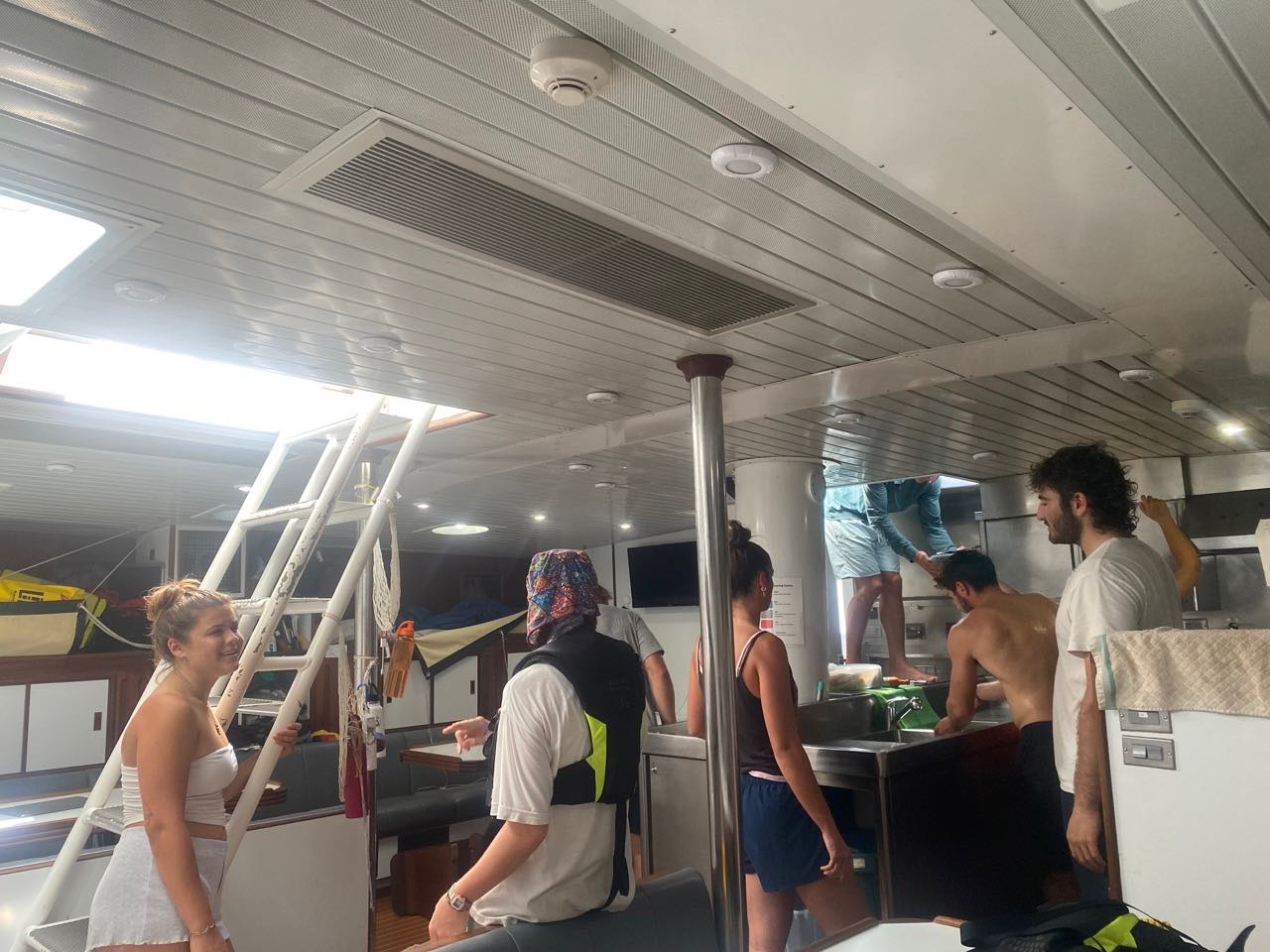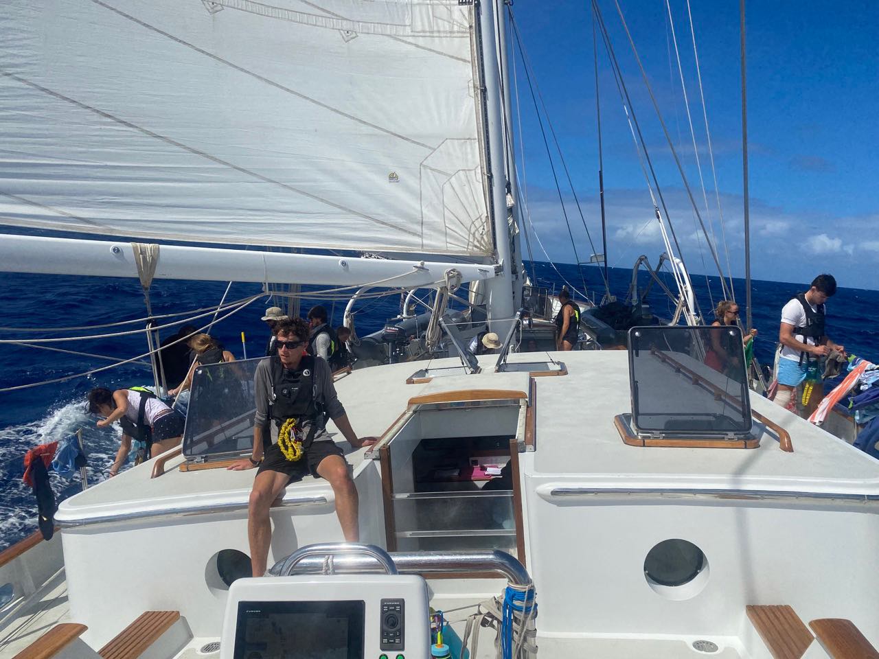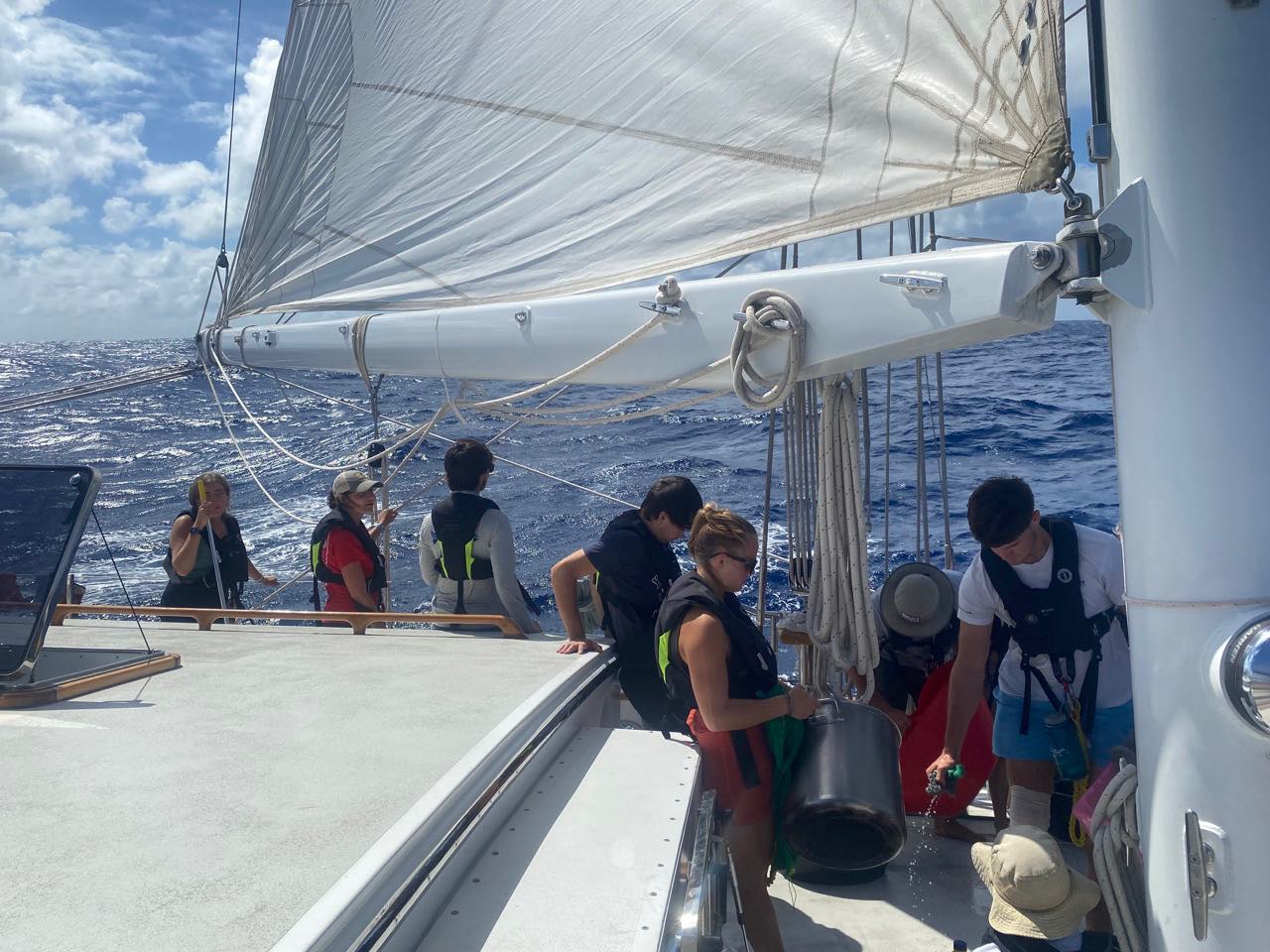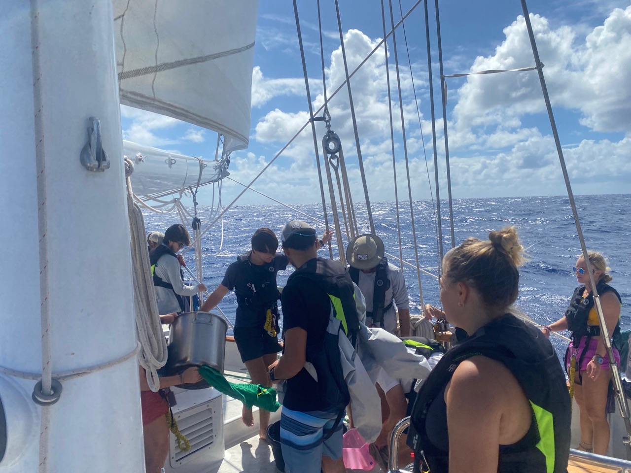 Today started like every other day on this passage, peaceful. Everyone had a calm watch the previous night, aside from a couple of large swells. And when everyone got up, we had a delicious lunch of BBQ chicken sandwiches made by our lovely chefs, Luke, Ben, and Eliza. Right after lunch, a large school of Skip Jack tuna started jumping out of the water, so Mac set out his lines to try to catch them. After that, we had our last oceanography quiz on the course. All that was left to do was the final and the research project. After that, we had a small leadership class. Then, everyone had free time for the rest of the day. Most of us watched Interstellar for the first time in the salon, and we all enjoyed it a lot. The movie takes place all the time, from dinner to enchiladas. They were very good; the head chefs worked very hard to give us a tasty meal, and they did just that.