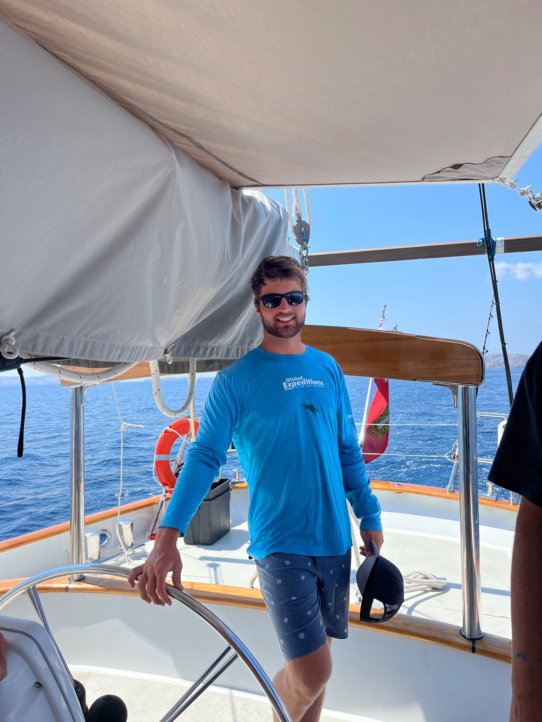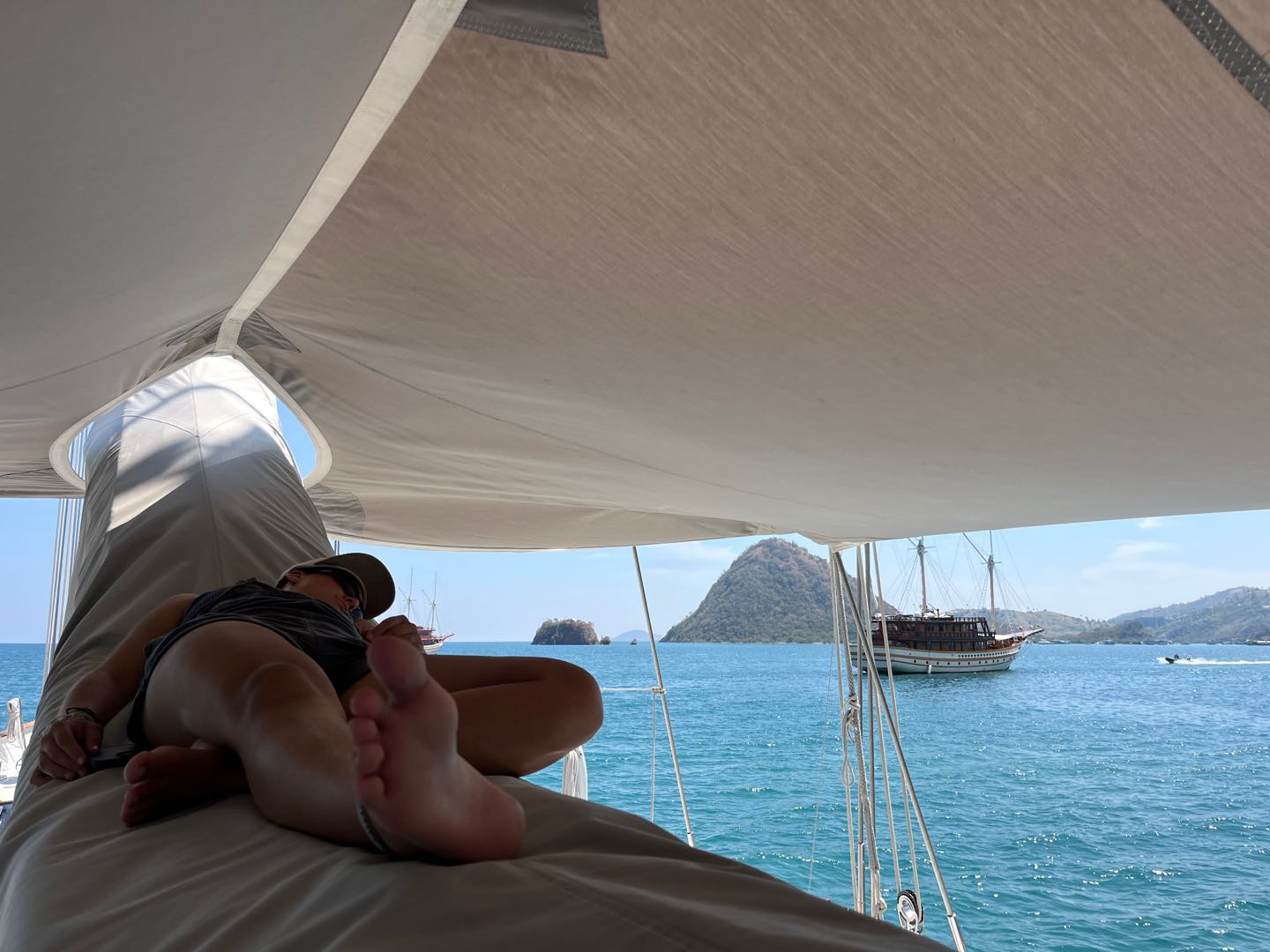 One of my daily appreciations on Vela is walking up the companionway just as the sun is waking up and seeing the beauty that surrounds me. Today is day 67 of this voyage, and I thought back to the first few days on the boat in Fiji and how far we have all come. Komodo has this hazy landscape and makes me feel somewhat as if I am in a vintage postcard. The ships that often pass us here have such charm and were built with character. I woke up to the haze of the mountains and to Arden working tirelessly in the galley, mushing frozen berries to prepare a smoothie bowl breakfast for Velas crew. We all sat in the cockpit and enjoyed the fresh starfruit with our breakfast from yesterdays provisions. The plan for the day was to move anchorages and perform some operational tasks around the boat while underway. Zoe and I began sorting through the fresh sheets in the salon from yesterdays laundry load. This task quickly turned into a full performance while everyone attended to their respective cleanup jobs.