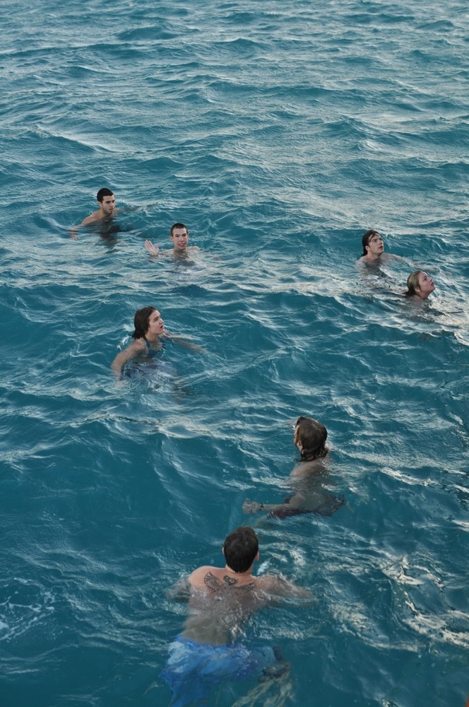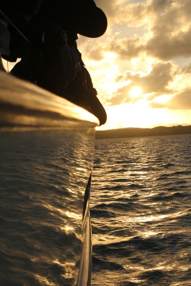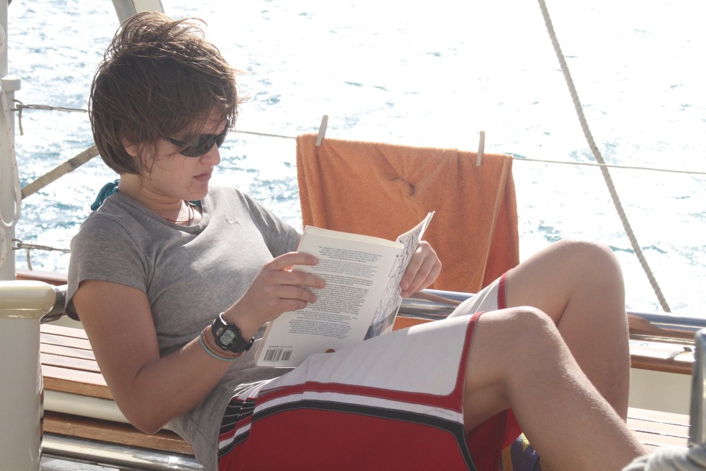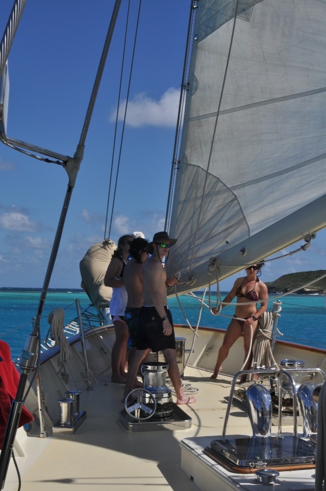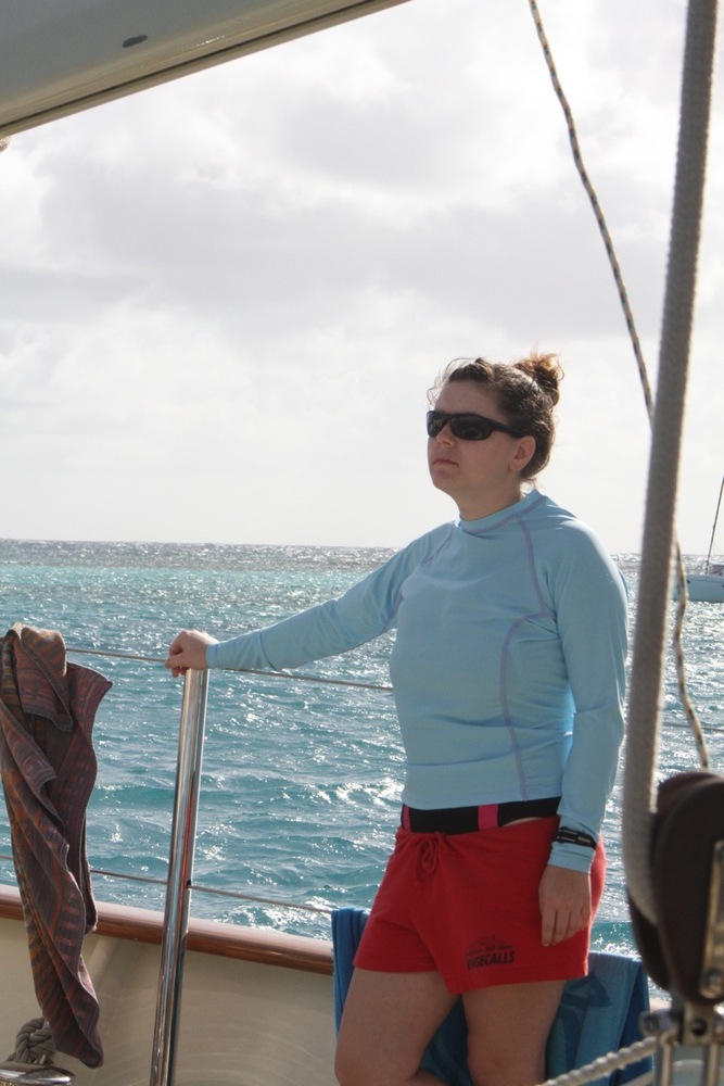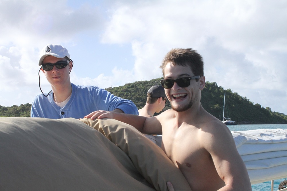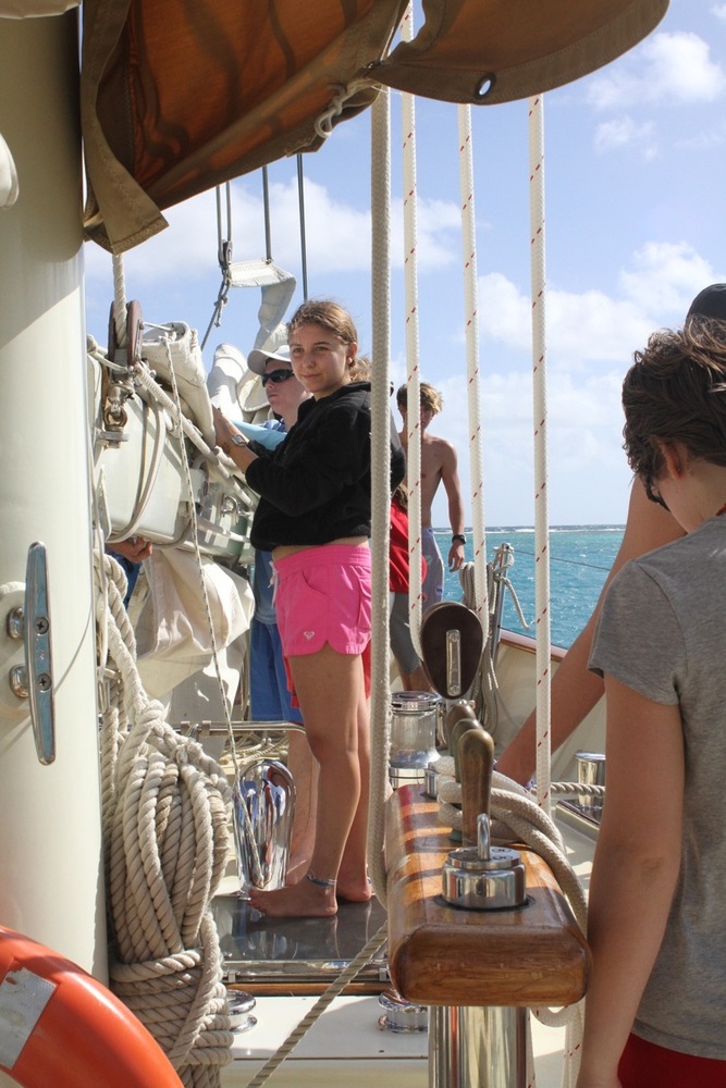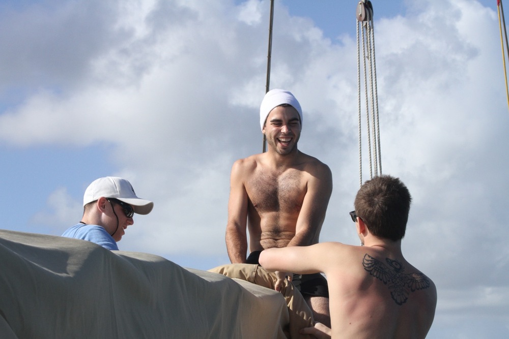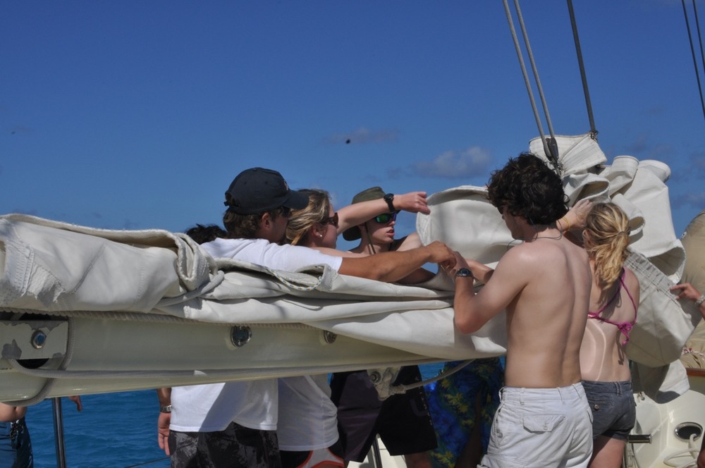 Today began bright and early with a dip in the bright blue water of the Caribbean Sea for a pre-breakfast swim test. For those non-certified divers, this was only the beginning of a day filled with splashing about. Back into the water, they jumped to continue working on their newly acquired diving skills. It may only be the second day these thirteen people have made bubbles underwater, but they are already showing great promise. From removing their masks underwater to practicing fin pivots, they will quickly be diving like pros all over the Caribbean. While the newbies dove, the already certified divers took in the surreal landscape of the anchorage from the sandy shores of Green Island. When the groups were not busy frolicking in the sun, they practiced line handling by setting the forward staysail and the mainsail. Although we remained at anchor during the whole procedure, the anticipation for tomorrow night’s inaugural sail is all the more apparent in the crew.