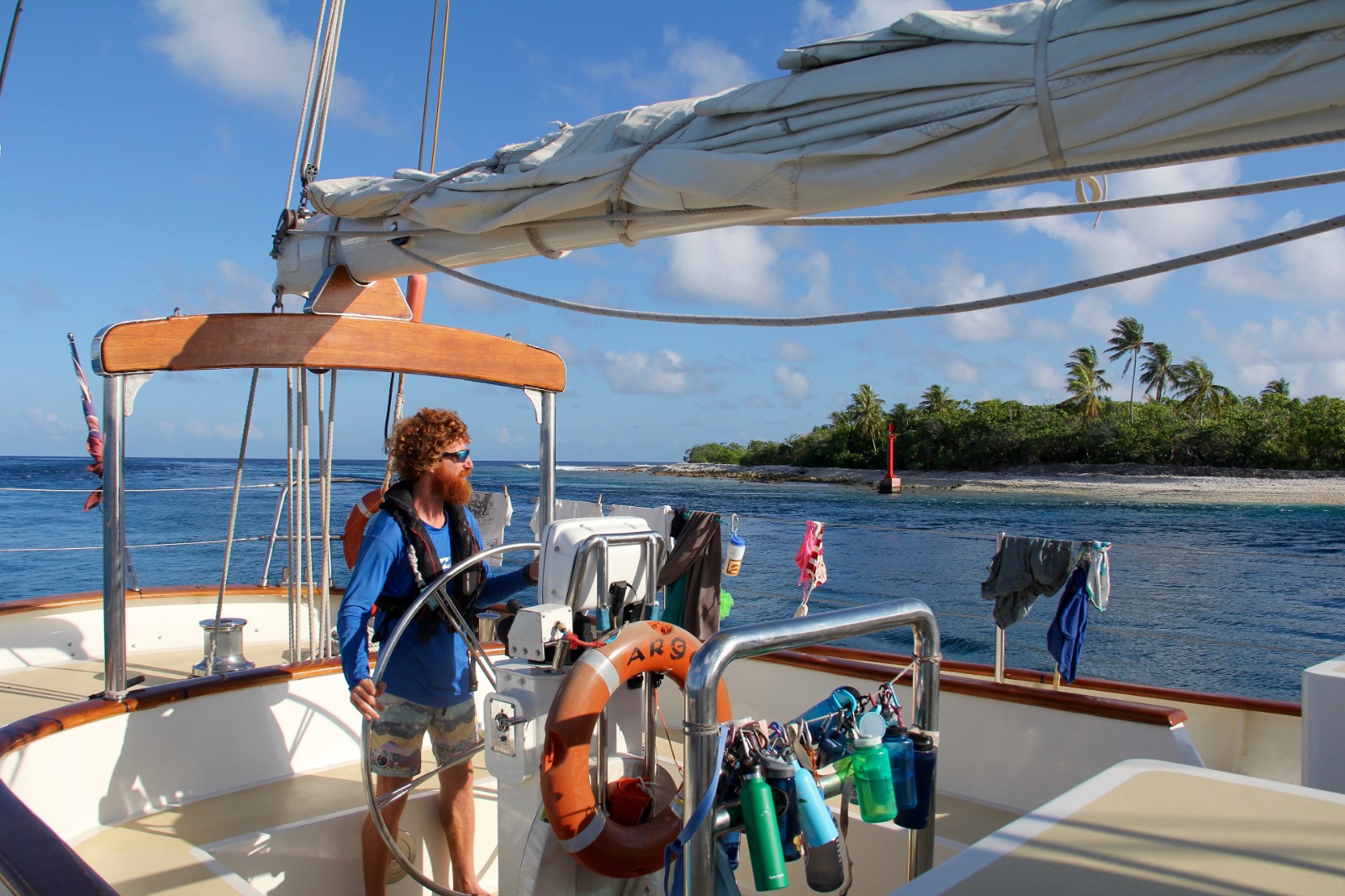 We arrived in Ahe early this morning, traveling through the cut that let us into the lagoon of the atoll opposite the outgoing tide. The atoll is made up of a ring of islands that look like large, long, palm-tree-lined sandbars, and aside from shallow cuts here and there, they surround us on all sides. We’re anchored on the southwest side of the lagoon, where the water around us is South-Pacific-blue with occasional strips and stripes of brilliant cyan. Upon our arrival, Ben and Carolyn went into town to arrange for tomorrow’s visit to a pearl farm while the rest of Argo’s crew put the boat to bed and tidied up the deck and salon. After a lunch of fried rice by head chef Audrey, we split up into three groups: rescue divers continued their training with Simon and Tina, the studious among us spent the afternoon on the boat catching up on work, and the rest went ashore to explore one of Ahe’s tiny islands.