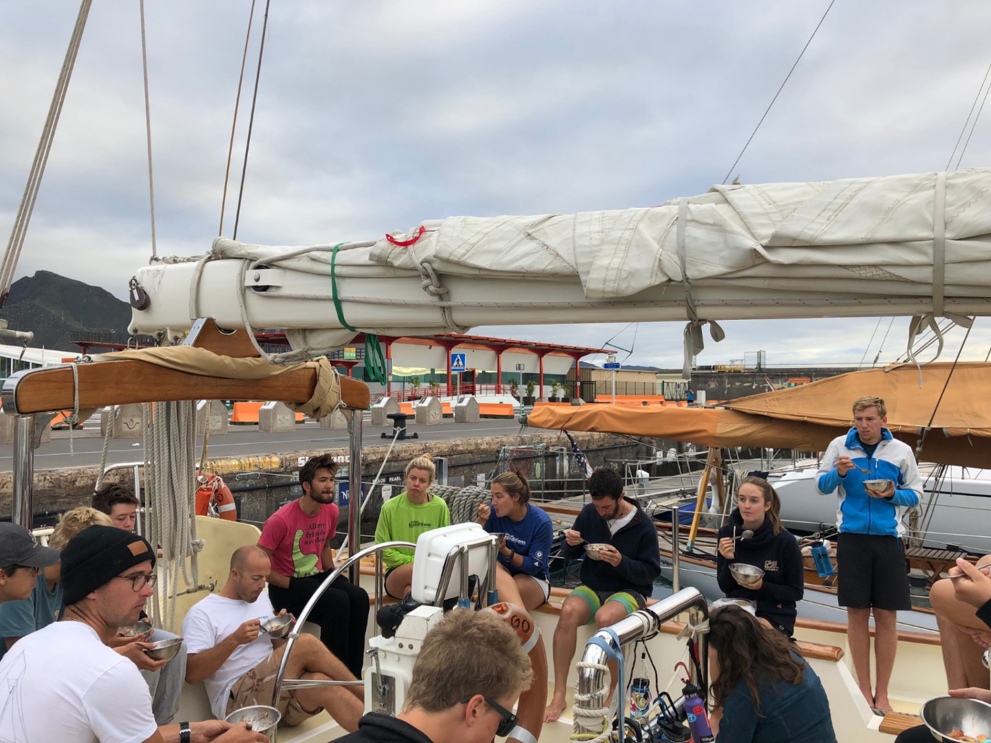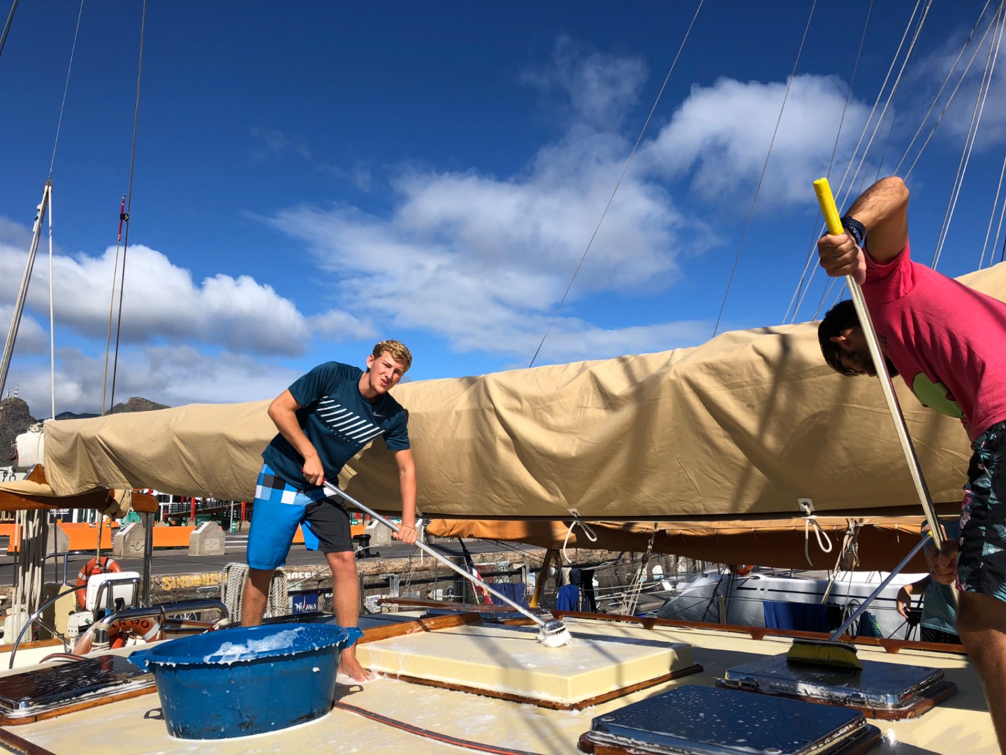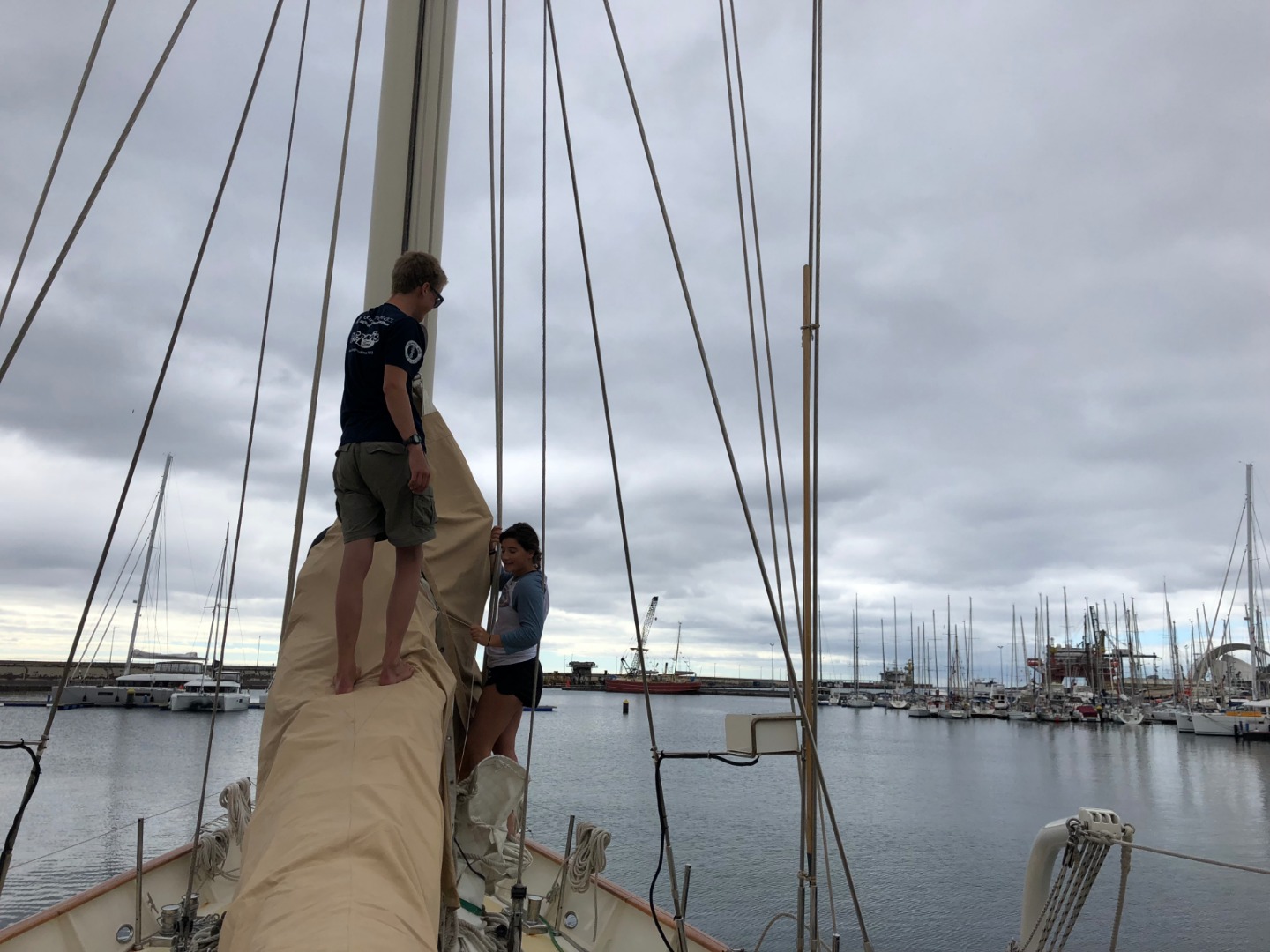Today was a very, very, very special day. Our task was to do a thorough boat appreciation. Argo is a beautiful boat, and she looks sad when she’s dirty. We had to do a complete inventory and count of all the food we had on board before the final grocery trip stop, and we had to clean every nook and cranny that we could find. We got new sheets on our bed, disinfected our bunks, scrubbed the deck, cleaned the bilges, washed the lines, and did numerous other chores to get ready to cross the Atlantic. After all of our hard work, we had the rest of the day to walk around Santa Cruz de Tenerife, do homework, and have a final night out before the three-week passage across the ocean. As of right now, our beautiful schooner looks cleaner than she did the first day we got here, and we are all mentally preparing for the challenges ahead.