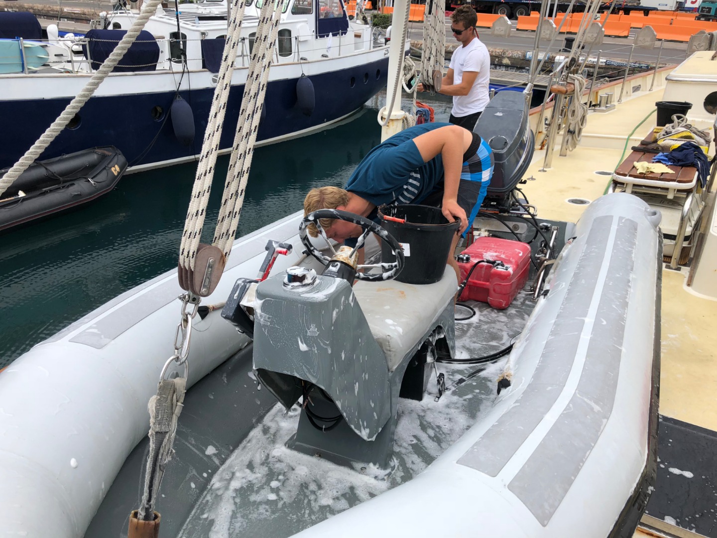 Pictures: ARGO; Crew members scrubbing deck; Crew member cleaning one of our small boats Nopadone; Crew members attaching halyards, inventory of food; Argo crew eating breakfast.