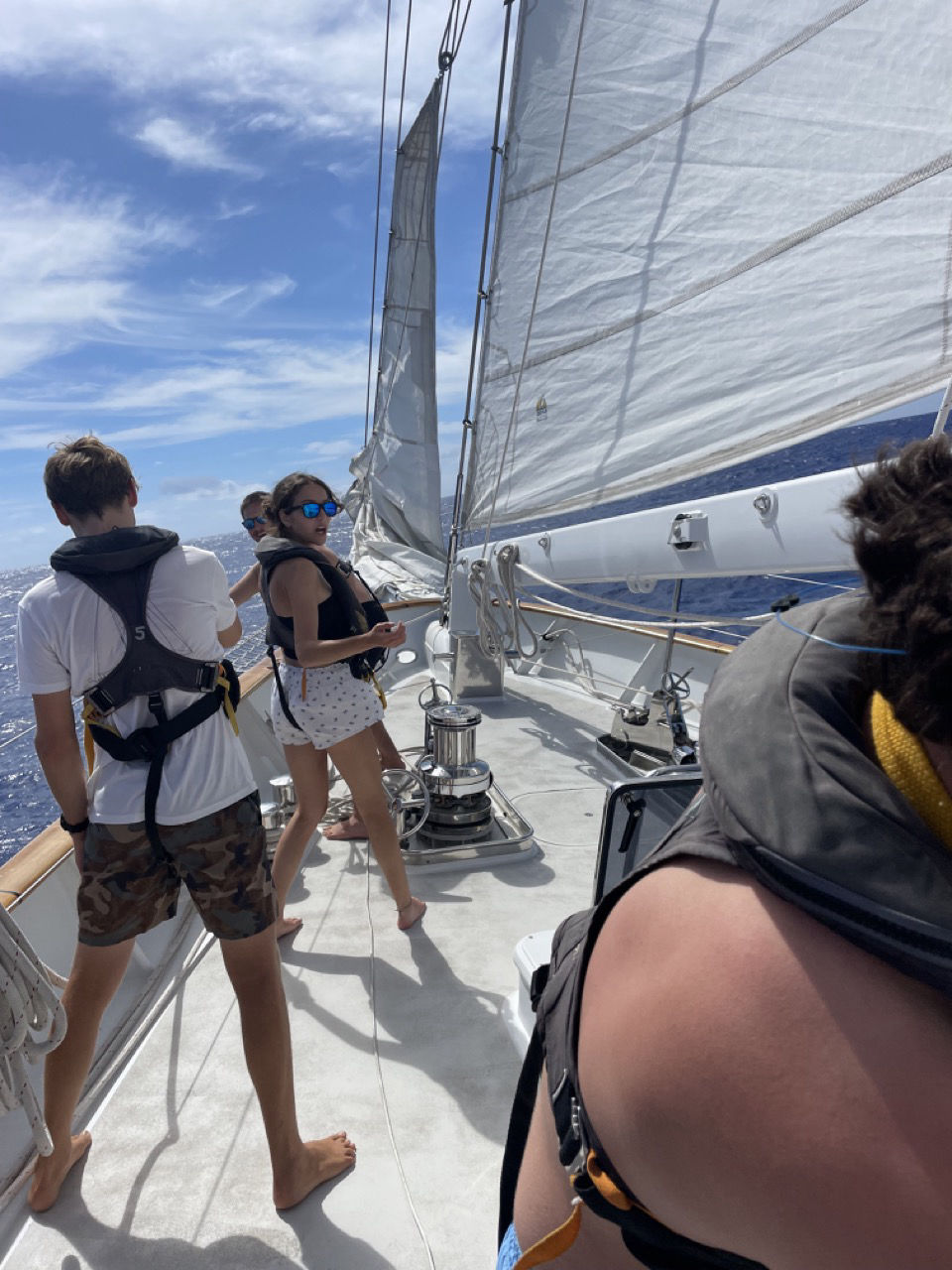 Starting the day off strong with Watch Team 3 serenading everyone as wake-up calls. Honestly, it felt like a fever dream. Especially after a long night on watch talking all things music to Kiss, Marry, Kill while huddled up around the light at the helm, like moths to a flame, lol. The days on passage have been starting to blend together, but, if anything, bringing us closer together as a crew and soon-to-be family. I’d say the biggest struggle is making sure all your sunscreen is blended in before somebody else does it for you and making sure you’ve got on the right SPF. The Atlantic sun does NOT play around, skip reapplying after a few hours and your shoulders/nose are toast. Classes today were as entertaining as ever, from learning about water salinity in Oceanography to an on-deck fiasco of Seamanship Jeopardy (things got competitive real quickly). The stakes were high as winners would earn candy, the power of knowledge, and shaving Jake’s back hair. Unfortunately, they only got 2 of the three things; I’ll leave you’ll to guess which onesfinishing the day off as a Win with some spicy chili and honey butter with cornbread. I’d say it was another successful day of sailing on Vela. ALSO February 14th is right around the corner, make sure to send a virtual valentine. I’m sure we could all use a little love from home, St Helena, in three days!!