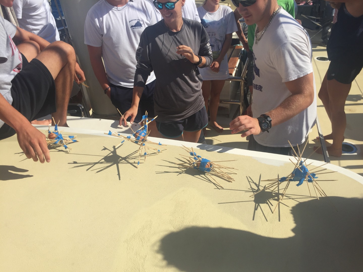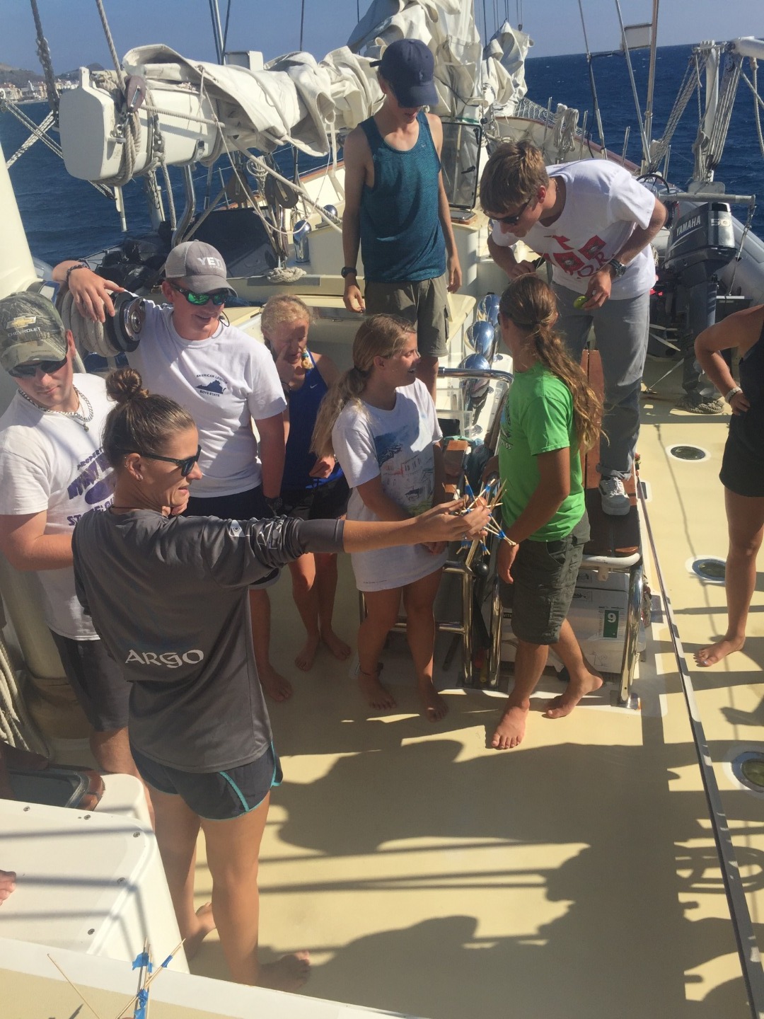Today we arrived early in Montril during the afternoon. Before that, during my night watch from 12:00 am to 4:00 am, there were the most bioluminescent dinoflagellates I have ever seen! If you looked behind the boat, it seemed like there was a trail of glowing blue stars behind us, so cool! Even cooler than seeing them light up the toilet bowl! Besides that, there were a few other wildlife sightings throughout the day. A few more dolphins joined us, with Tait and Lexy seeing them most during their bow watch. Also, during lunch, some people saw some flying fish. At the end of our passage, we had a Seamanship class where we learned the pirate code (which is more like guidelines) and then Leader-Ship class. It turns out, no matter how far away you sail, you still can’t escape high school team-building exercises. In this case, we broke into teams and tried to find the best way to drop an egg and not let it crack with the materials given. Each team leader was given a specific leadership style to use. Thanks to Cole’s autocratic/dictator style of leadership, our team (team 4) prevailed. Until we didn’t- our hubris ended up cracking it. Whatever.