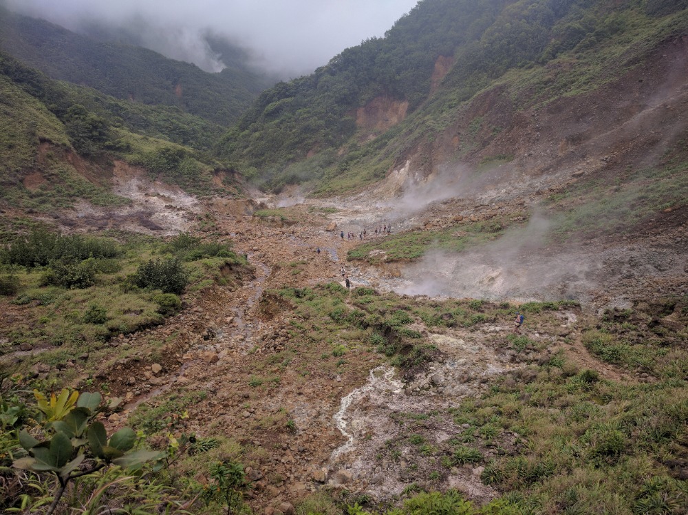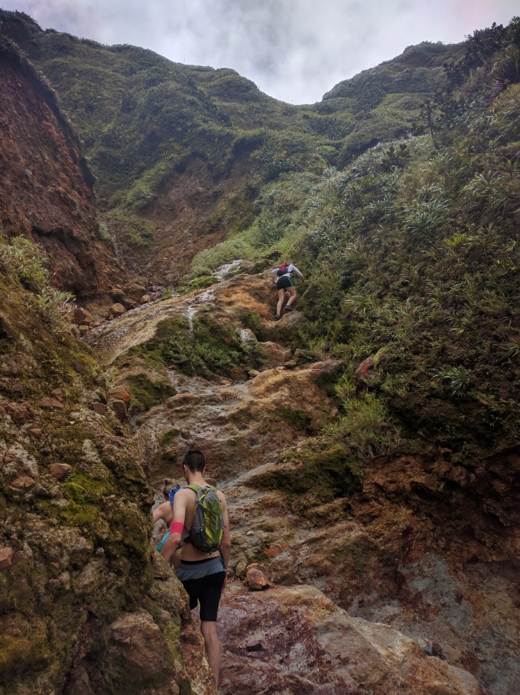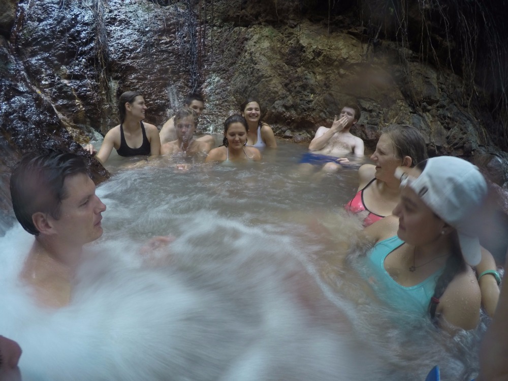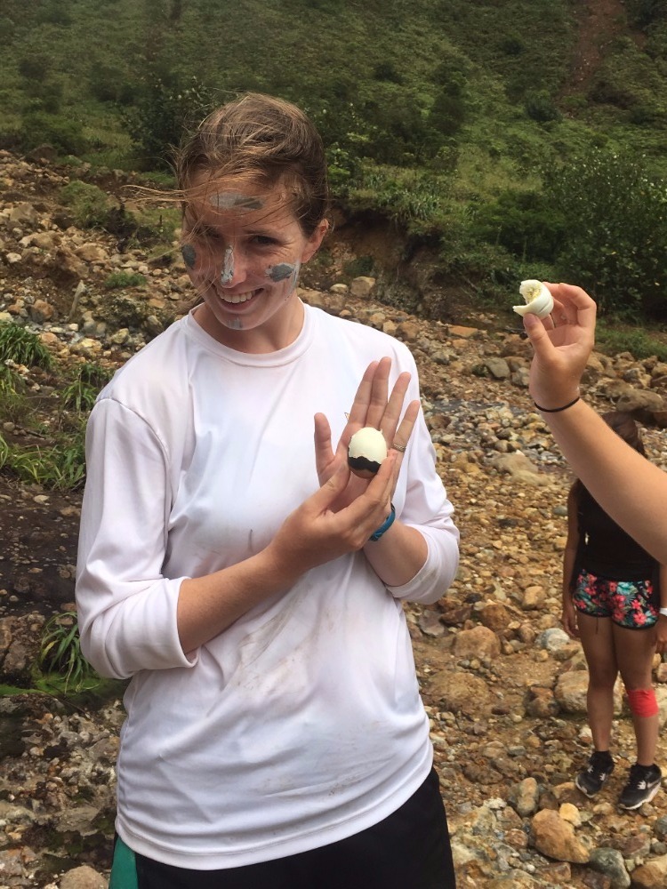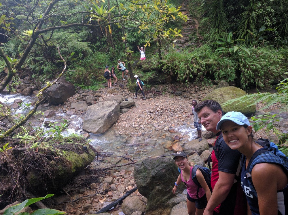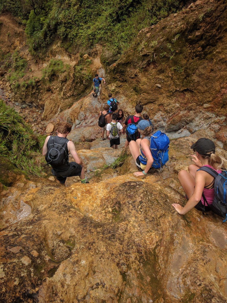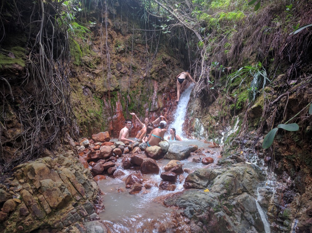 After an early wake-up this morning, we headed out on a magnificent hike to the boiling lake. The hike was “quite strenuous,” and wound up and down through the rainforest, over the top of the peak, across spring rivers, and finally towards the geothermal boiling lake. Along the way, we stopped to hard-boil eggs in the hot springs and enjoyed mud face masks led by our wonderful tour guides. They also pointed out places where the spring water ran clear and was delicious to drink. Later, where the cooler rainwater mixed with the hot water spring, we hopped into the stream as though it were a hot tub (with maybe just an extra bit of sulfur). Overlooking the captivating boiling lake, we took time to enjoy lunch as well as the view before we trekked back to the beginning. To finish off our time onshore, we splashed into the cold gorge to cool off and relax. Some adrenaline-inducing activities, such as jumping from waterfalls, also occurred. With the wonderful feeling of having spent a day in nature, literally climbing mountains, we came back home to Ocean Star to enjoy yet another evening. With the steam covering the tops of the lush green mountains and freshwater trickling down everywhere, the island of Dominica is paradise.