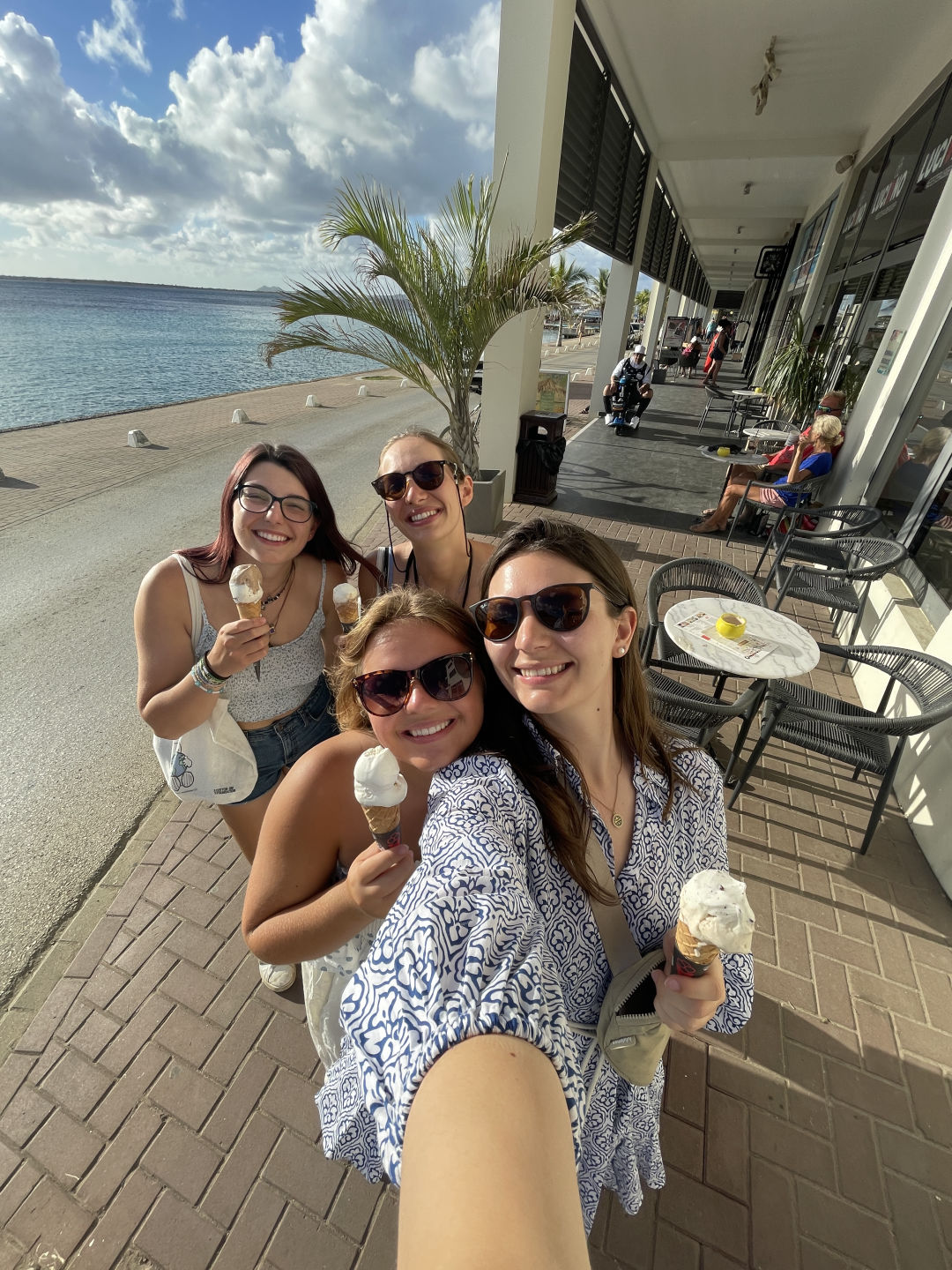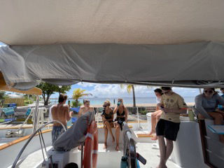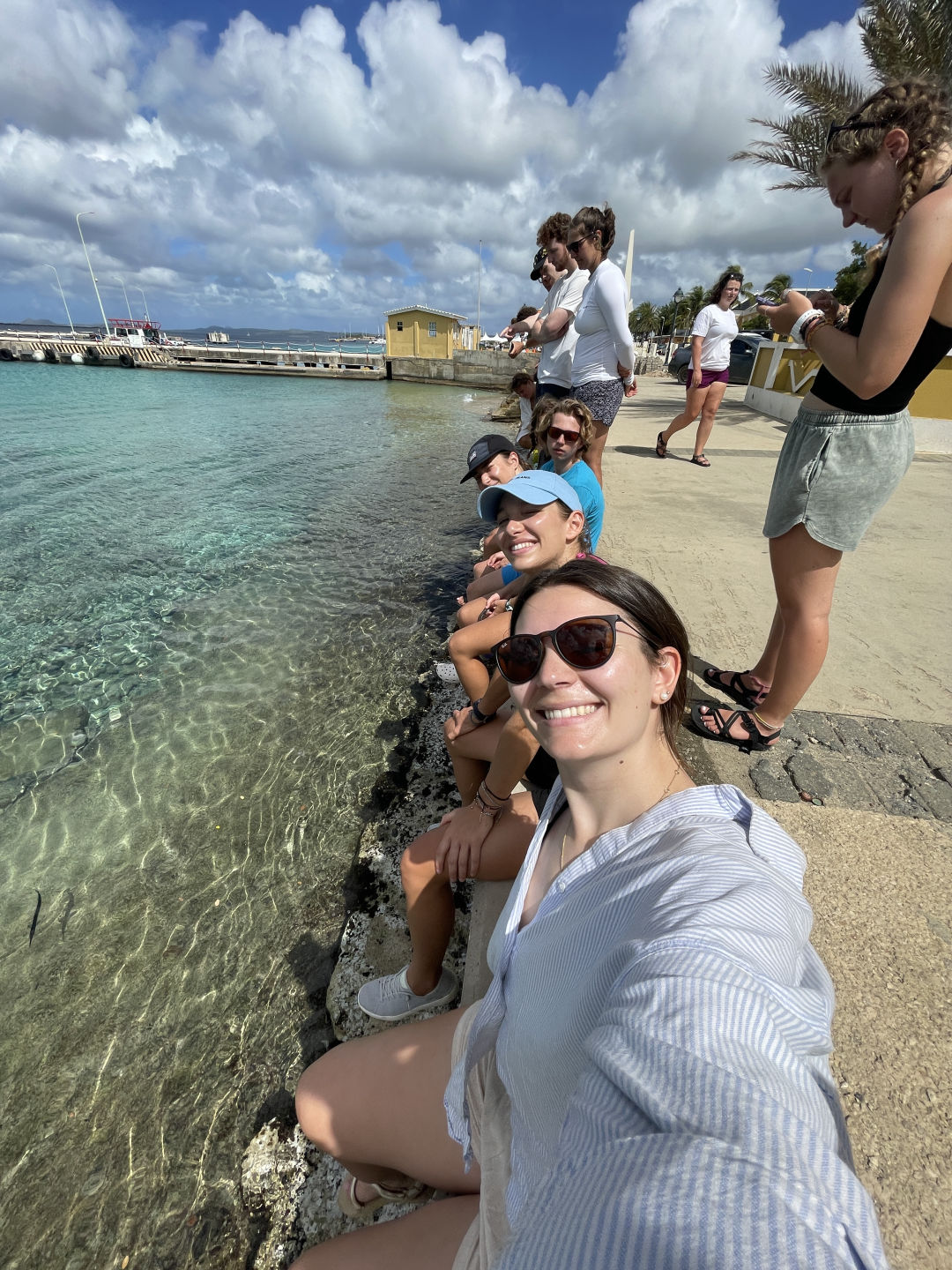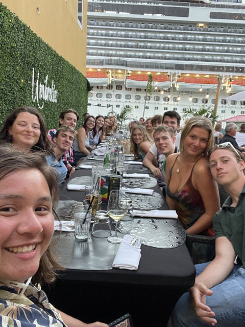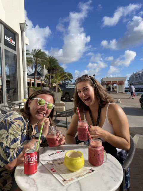 Today was an early start for the members of watch team three (Me, Gabby, Cosmo, Skyler, Magdelena, Lexi, Ben, and Charlie) as we rolled into our port in Bonaire at around 2 in the morning. We all banded together, and with help from Drew, Matt, Smash, and Tom, we successfully got Vela docked despite many worm dances and rounds of the much confusing “Line Game.” We were all pretty happy to get to go to bed an hour early. Then at 7 am, I started up the mellow tunes of “Daydream Believer” by the Monkees and woke everyone up. Alexis. Skyler and Saskia prepared some DELICIOUS fruit turnovers that had everyone going back for seconds. Once breakfast was cleaned up, we all trekked down to customs and pointed out all the places we would want to stop later during shore time. Unfortunately for us, customs were closed until later in the day. But we got to see some super colorful parrotfish on the way over and back, so silver lining. Upon getting back to Vela, we split up and started our very first Boat Appreciation. Cosmo, Nella, and I tackled some line and deck lockers. Others flaked sails, cleaned bilge covers, and scrubbed topsides. Allie encouraged us to think of the Waffles on a Stick that we had spotted on our earlier walk as motivations for scrubbing the deck. We also took care of our cabins by cleaning our beds, popping new sheets on our mattresses, and tidying up the floors. Our chef team prepared a salad bar for lunch which we all gulped down. I heard quite a few remarks on just how good the salad was floated around. After all that hard work, everyone was allowed to go explore the town next to our port. We took showers, shopped around, did laundry, drank smoothies (and most importantly to Daphne and me, drank Coca-Cola), and found Lexi a new waterproof watch. It’s a great little area with tons of shops, food, and activities which prompted a few of us to agree that this was our favorite stop yet; despite only being here for a day. One successful adventure later, and it was time for our first sign-out night. We shared tons of laughs, good stories, and games over an amazing dinner at Umbrella (Seriously, the passionfruit cheesecake was INCREDIBLE). Some ended the night by grabbing Gelato. Some ended it by smacking head-first into a pole they didn’t see on the way back to the ship (unfortunately, that would be me). But nothing could put a damper on another great night with Vela and the crew.