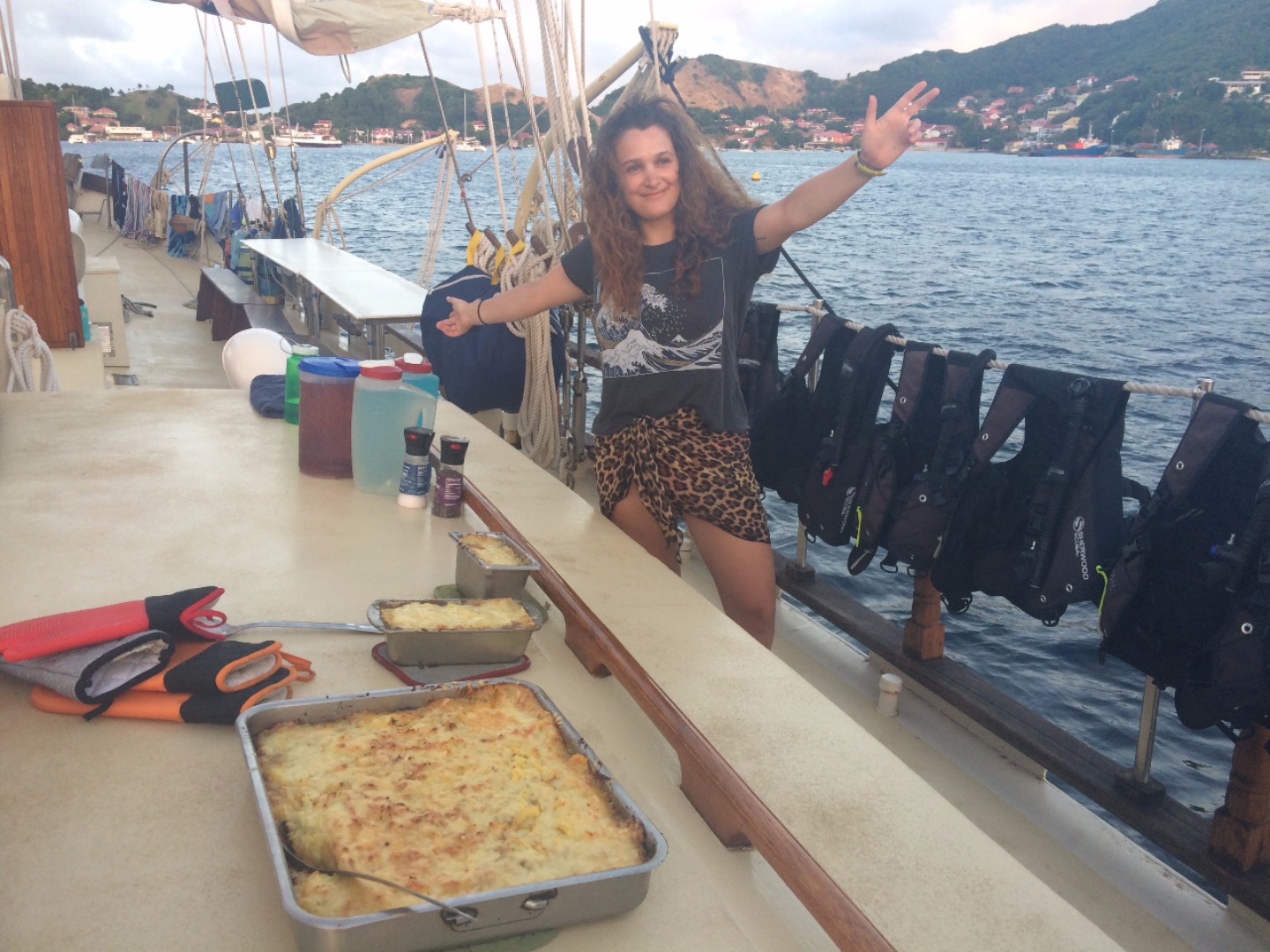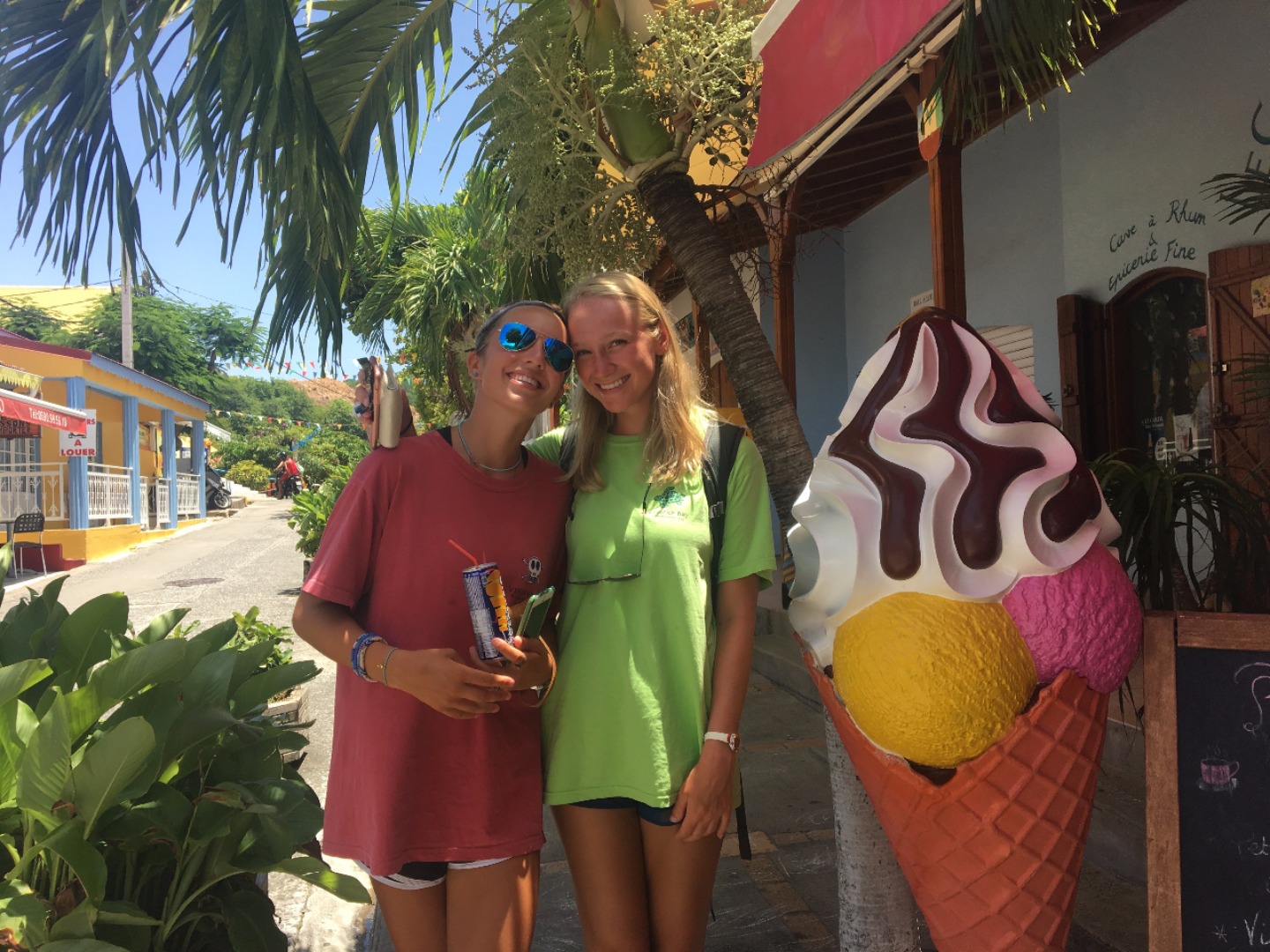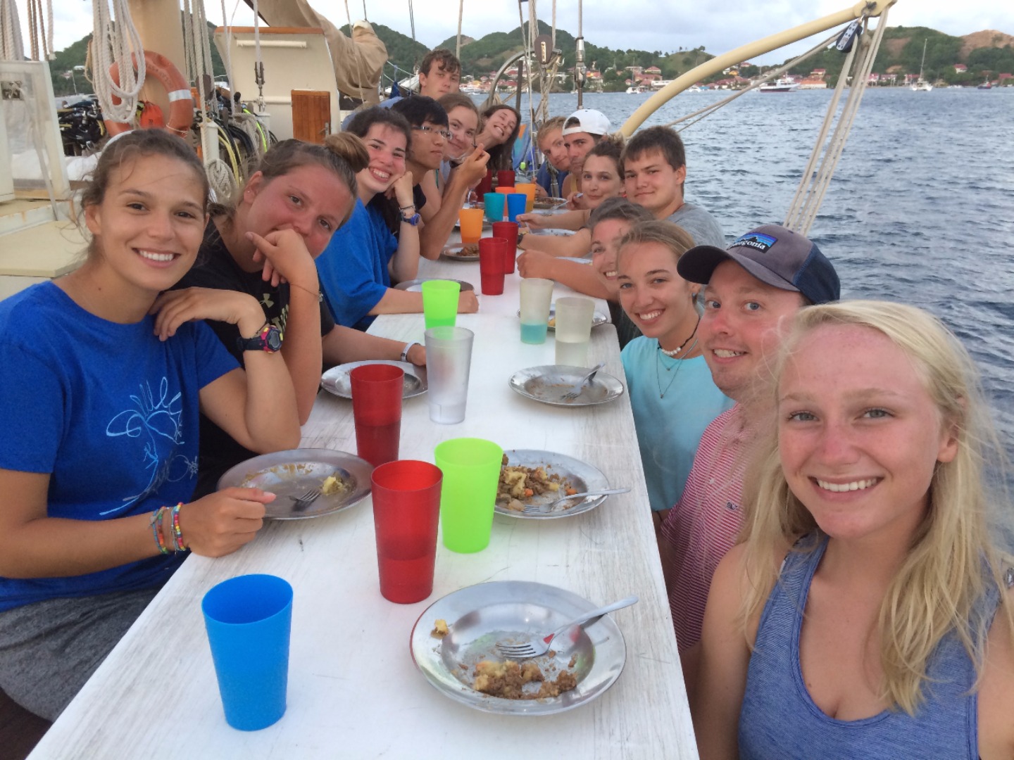Today started out like any other day on Ocean Star; the crew got their daily wake-up call at 7 am. However, our tired faces soon turned to smiles as we walked up on deck for breakfast and saw that our lovely staff had surprised us with fresh-baked goods from one of the bakeries on the island of Terre de Haute, Les Saintes, as a welcome to Francelandia, as Marina put it. Immediately after breakfast, we were ushered downstairs to take our Oceanography midterm, so Im sure you all can imagine the excitement. After our test, we raised anchor and quickly motored over to a little town about 20 minutes away. Before we got there, though, we had a man overboard drill as our poor buoy, Oscar, was thrown off. The crew scurried and was able to get our lovely crewmember back on board in 11 minutes. We then got some fun news when we learned that we had the rest of the day until dinner to explore the small French town. We all spent our day exploring the town, and we were all able to find amazing places to sit down and eat lunch, after which we got a chance to look through the dozens of shops and find gifts for our loved ones back home.