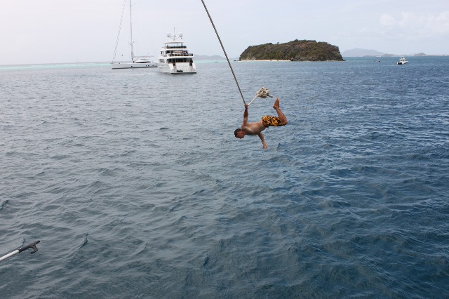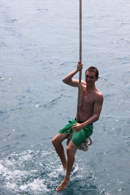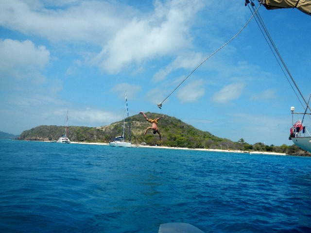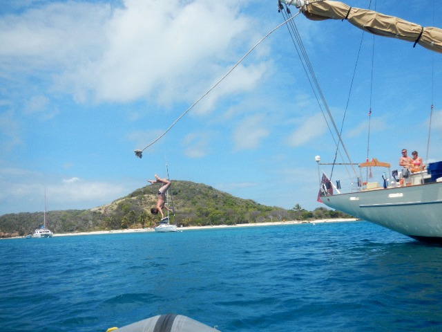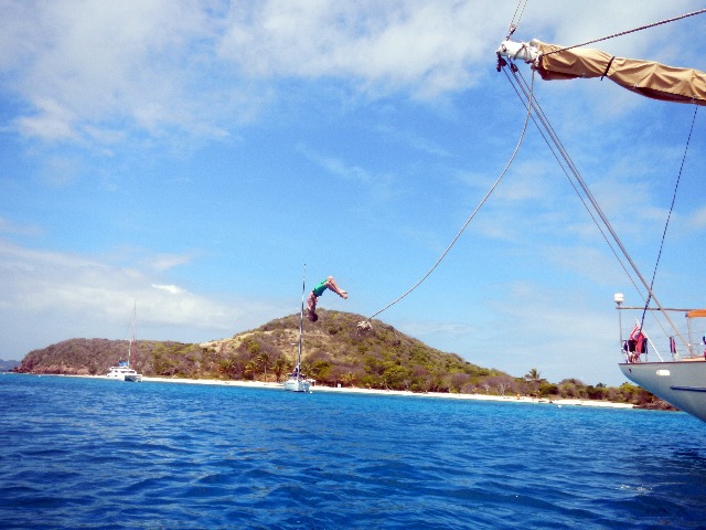 Tobago Cays has really been quite the incredible destination, allowing for a great time to be spent together as a group not only aboard Argo but in the water and on the beautiful sandy beaches. Today marked the start of something we have had yet to do on Argo, the boom swing! What is the boom swing…? well, it’s a swing on the boom. More specifically, it is a contraption we put up along the boom, so we were able to jump from the cap rails of Argo into the beautifully warm Caribbean waters below. It was such a blast getting to just play around, everyone attempting to do different tricks or poses off of the swing. This also allowed for all of the crew to learn who is really gifted at back-flips and who is really gifted at belly-flops. With a few stinging backs and a few more stinging bellies, we all persevered and overall had an amazing time just being able to fool around on the swing. The daily sunshine has been perfect, allowing for our little pet cacti (Bert and Roberta) to get plenty of sunshine, and hopefully, they will start to grow a little more.