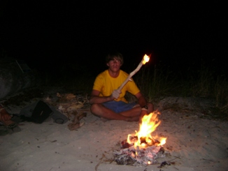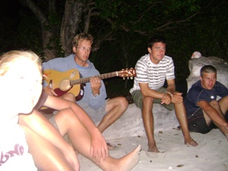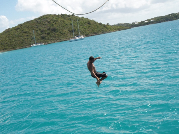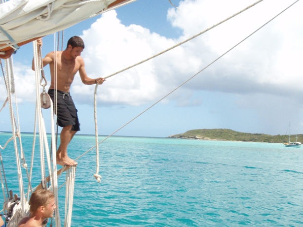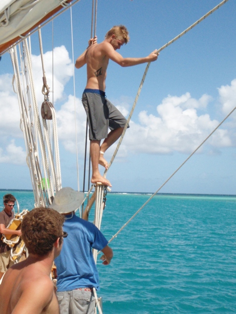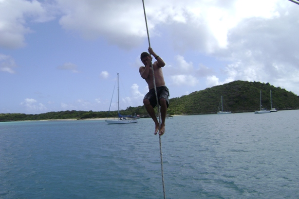 Today had nothing on the schedule, and it was supposed to be a day for doing nothing but relaxing, and for most people, it was. In the morning, Mike, Kathryn, and I went to do some Elkhorn Coral Survey, but unfortunately, we couldn’t locate the colonies. Unfortunately, they may well all have died in the past four months or so since they were last surveyed. The rest of the morning was spent on the beach, windsurfing or hanging out on Ocean Star. After a scheduling meeting in the afternoon, we set up the boom swing. Doing this involved the day’s hardest work: getting the boat ready to sail so that we could hoist the boom out at a 45-degree angle over the water. From there, everyone could swing from the end out over the water and perform some sort of acrobatics before splashing down into the water. Inevitably there was some belly-flopping and red skin afterward. Everyone thought that the boom swing was a blast, and nobody came away with anything worse than a small cut and some bruises. Tonight we are planning on a beach bonfire which everyone is excited about.