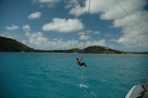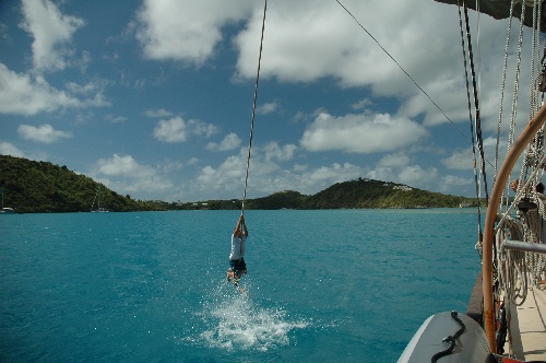 The morning started with a splash as bodies hurled through space and landed in the cool, clear waters off Green Island. The boom swing was in full effect this morning, and while it took some fine-tuning, the end result was an exhilarating experience. After we had our fill of swing time, the ship’s rigging was restored to normal, and we prepared for the motor to Falmouth. As we cruised out of the protected waters, we noticed a sizeable swell running that made the short voyage reminiscent of a sleigh ride. Soon, we dropped anchor in Falmouth and began putting the boat away, and met to schedule the next ten days of our voyage. After dinner, we had an Oceanography quiz and enjoyed a Nautical Science class. All in all, another action-packed day.