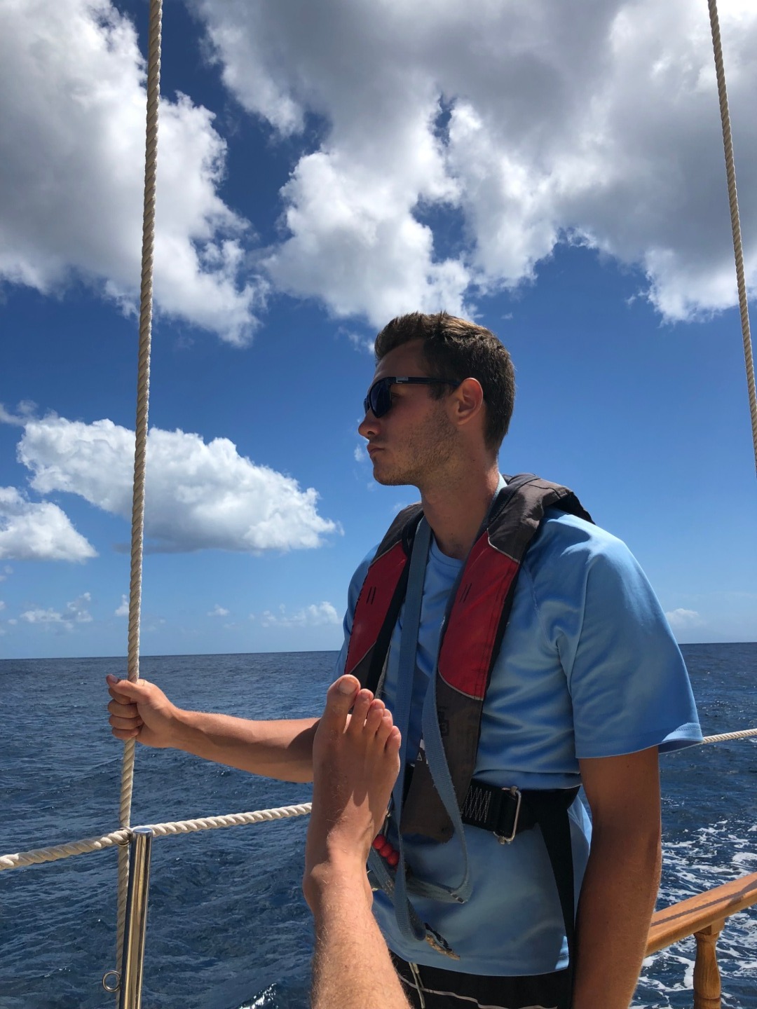 I hope you’re ready to hear about our absolutely killer day today. We started off with a good solid 6:00 am wake up. It’s just about the earliest I’ve ever been up in my entire life. After rubbing crusties out of our eyes and brushing our zubies, we grabbed our trusty type FIVE personal floatation devices and hopped on deck. Why did we need our PFD’s SOOO early, you may ask? I shall tell you. The reason is that our good captain Mr. Steve Greaves wanted to absolutely rip to St. Lucia as early as possible. Before we knew it, we dropped our stinky barnacle crusted mooring ball and set out for the high seas. Actually not the high seas, more like the low seas because the wind was quite dead. That’s okay, though! After a lovely brekky of banana bread, cheffed up the previous night by our lovely chef Mr. Burger, we hauled the sails up!