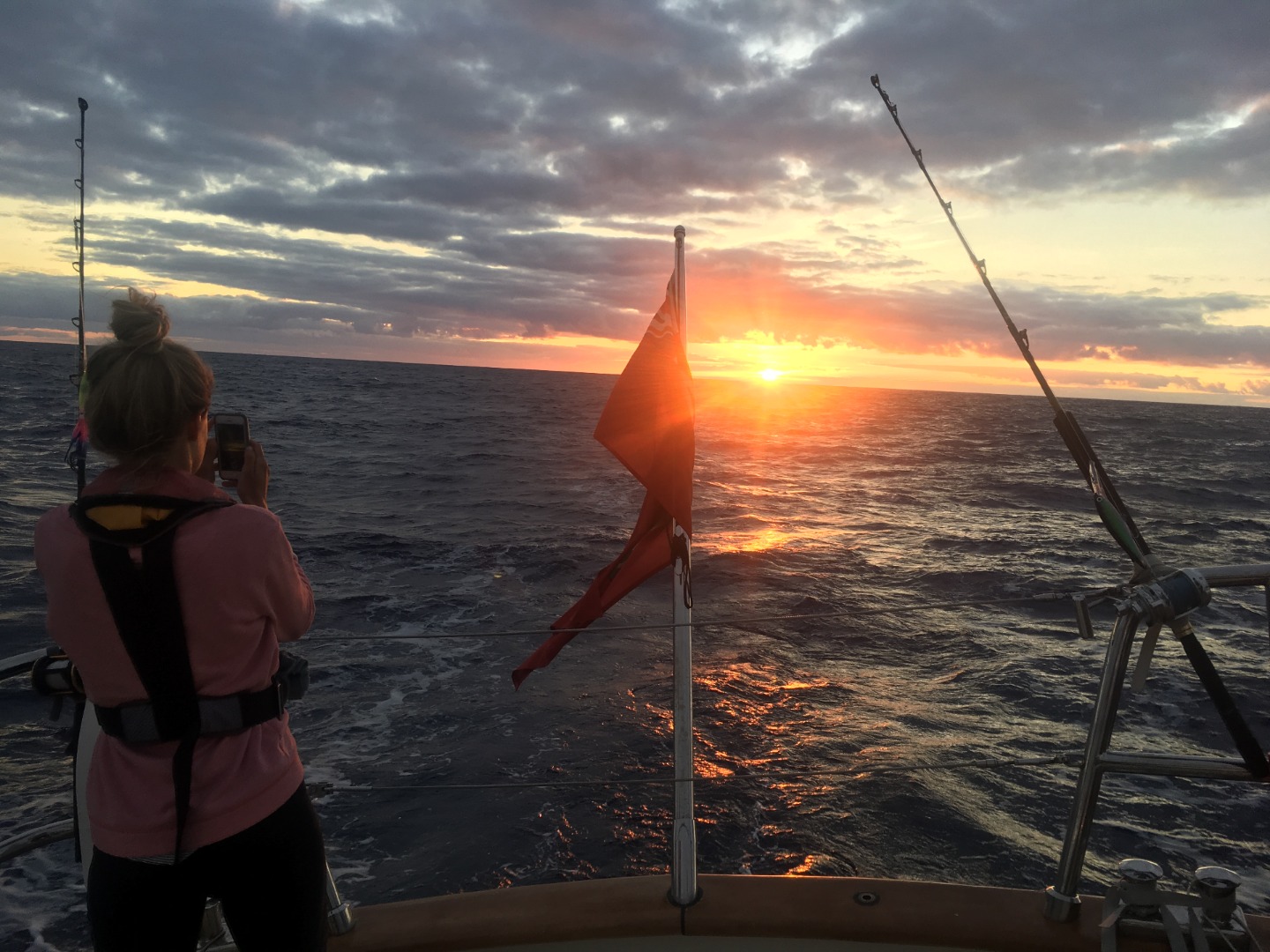 After a lunch of grilled cheese and tomato soup, Carolyn returned our Seamanship exams (which we all passed), and Argos first mate, Dan (aka Lieutenant Dan), subbed in as teacher for a lecture on VHF radio. In Oceanography, we learned about the underwater highway used by whales to communicate with each other over distances of a thousand miles. (Particularly relevant after our whale sighting on the way into St. Helena) I wonder if, with the right equipment, we can still hear the whale chatter around St. Helena? This afternoon was also our first with an upside-down fisherman as a mainsail (sans boom, of course), and from the looks of the sunset, we might be in for our first fully cloudless night of watch. Not only are the stars mesmerizingly beautiful, but they also double as a reference point for easy steering on the helm!