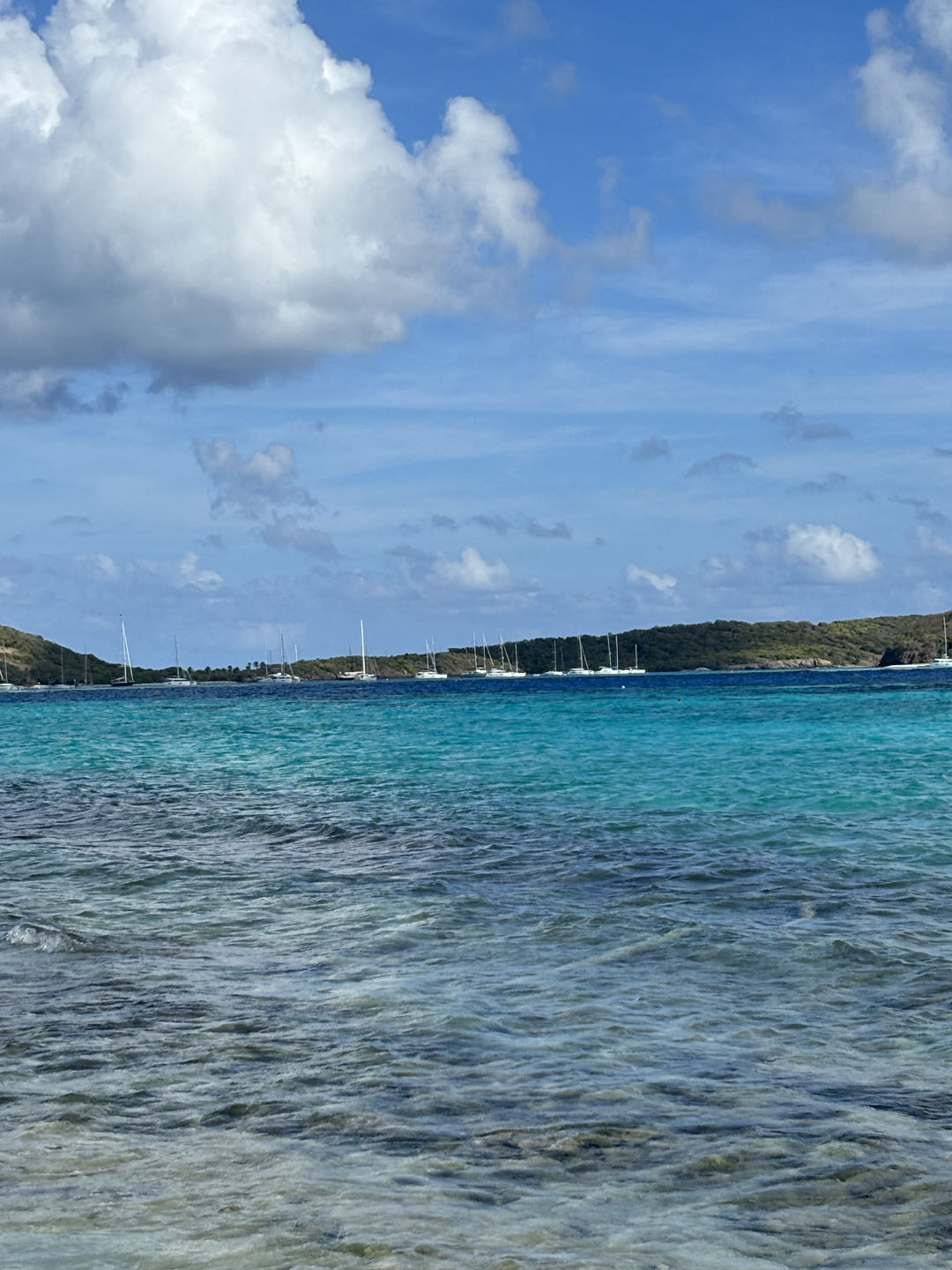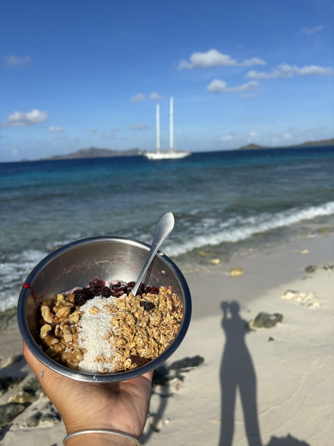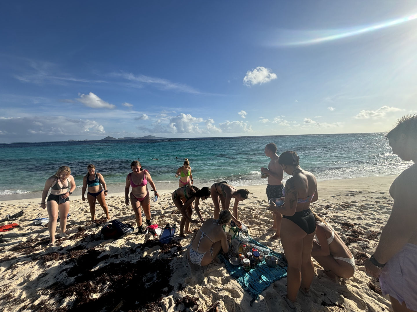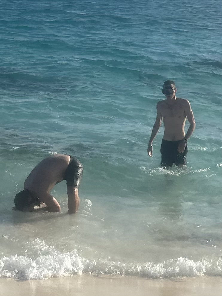 We started the day off by motoring over to the island Jack Sparrow was trapped on for a while in the Pirates of the Caribbean movies. I have still not seen the movies, so that might be wrong (sorry, Olivia). I, therefore, as a skipper and person who gets to wake people up, played the Pirates of the Caribbean soundtrack at full volume at 7 in the morning. In hindsight, it might have been on repeat for a bit too long, but at least everyone got up in time. We all lathered up with sunscreen, got our snorkeling gear on, jumped in the water, and swam ashore. Somehow, nobody got stung by a sea-urchin getting out of that water and onto the island. Steph had made amazing chia pudding, which was gorgeously laid out on a towel on the beach with fruit, granola, and other toppings, too. After eating, we had time for some exploring where we found a graveyard of conk-shells and also a disturbing amount of glass that had not yet fully become sea-glass. We still had an amazing time, though, seeing some cool sea creatures in the intertidal zone. I also spotted a cute little lemon shark swimming in the shallow waters on the beach. He was very afraid of humans, though, and quickly swam away. After exploring, it was time to swim back to the boat, where a lot of people saw a barracuda hanging around.